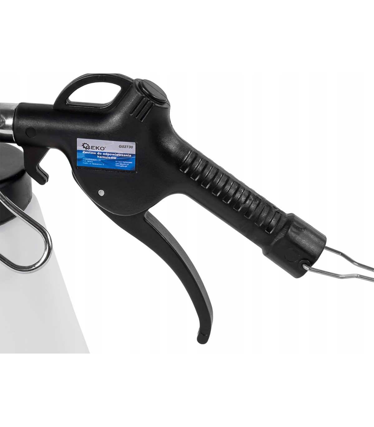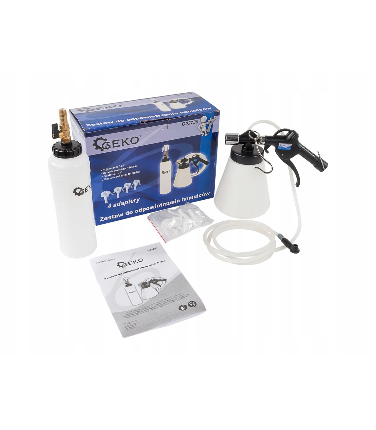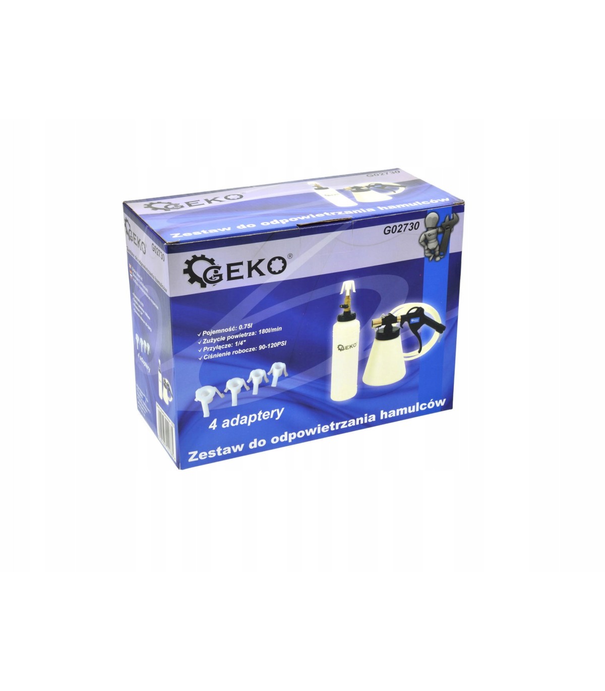 Uniwersalny zestaw do odpowietrzania układów hamulcowych marki GEKO. Urządzenie tego typu umożliwia jednoosobowe wykonanie napełnienia oraz odpowietrzania układu hamulcowego przy pomocy ciśnienia kompresora.