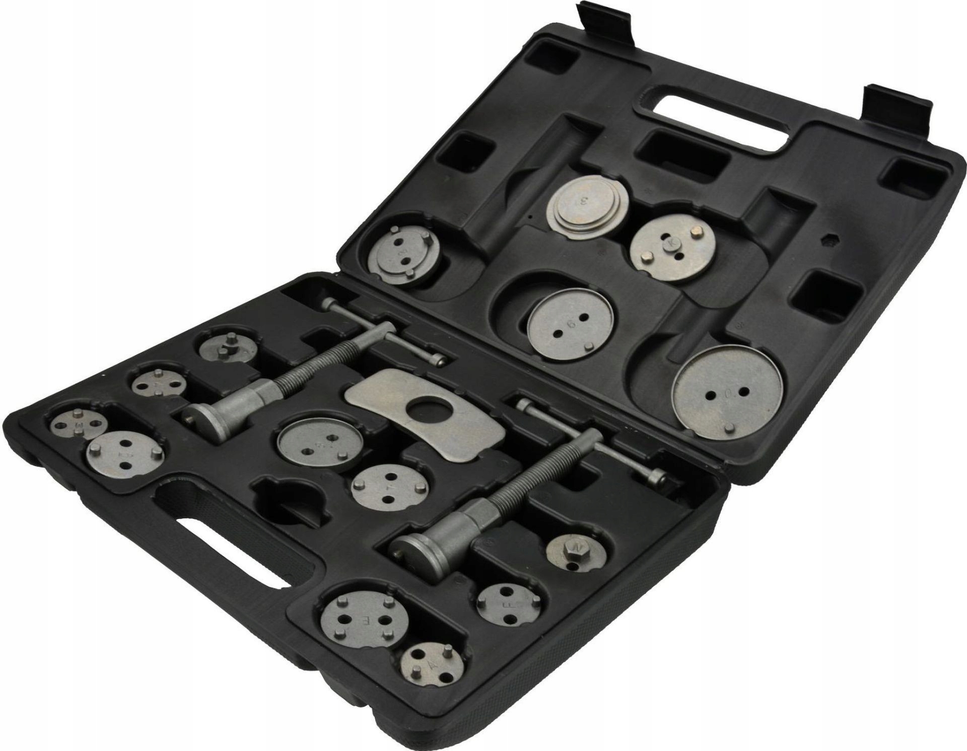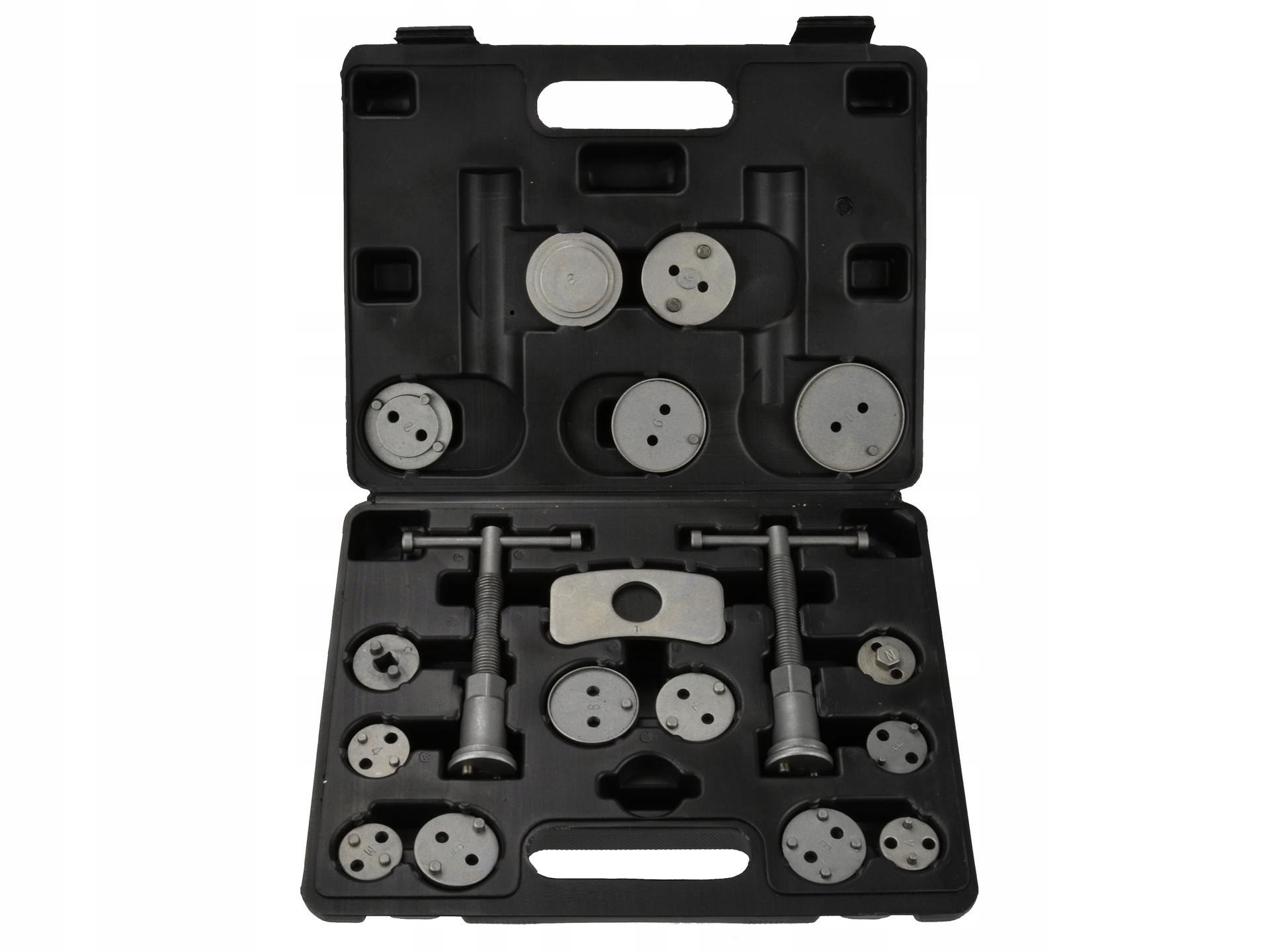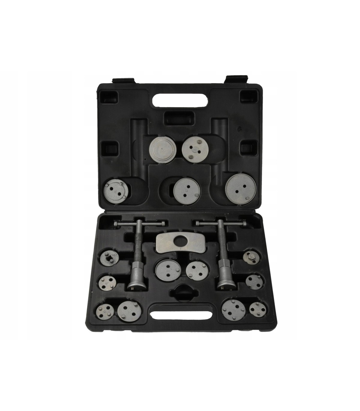 Profesjonalny 18-elementowy zestaw do cofania / wyciskania tłoczków hamulcowych, niezbędny przy naprawach pojazdów wyposażonych w hamulce tarczowe.