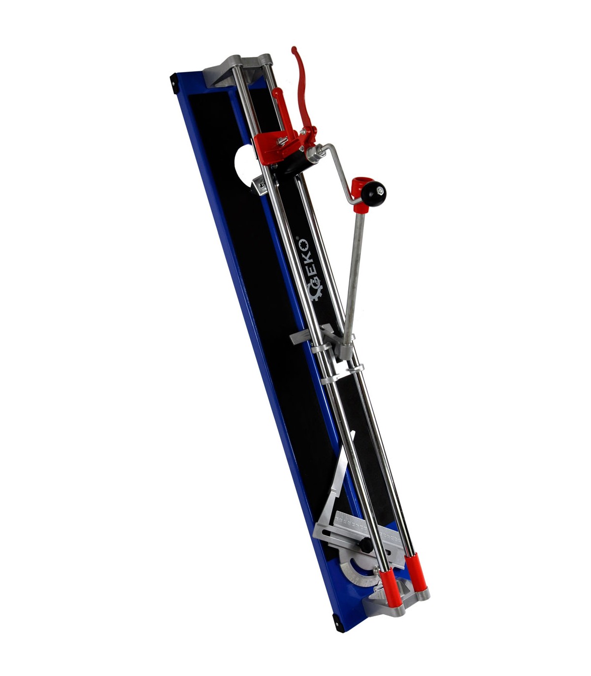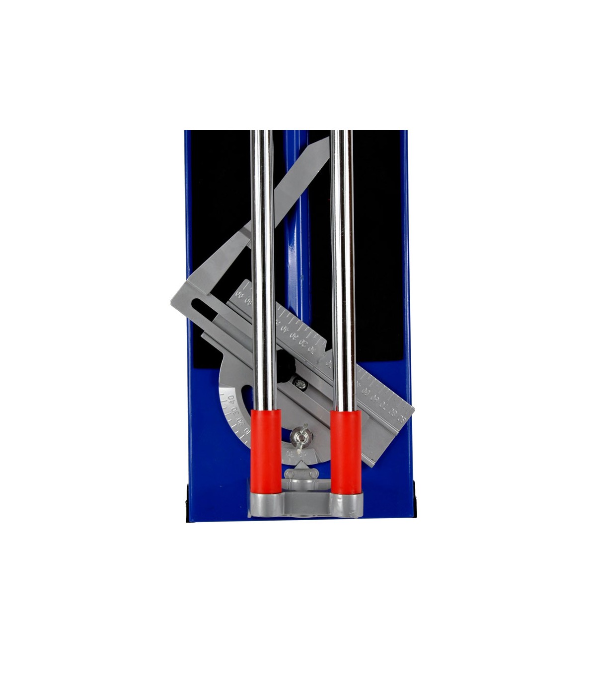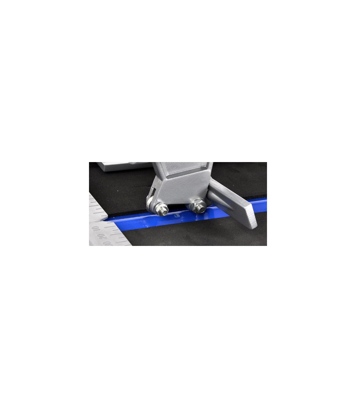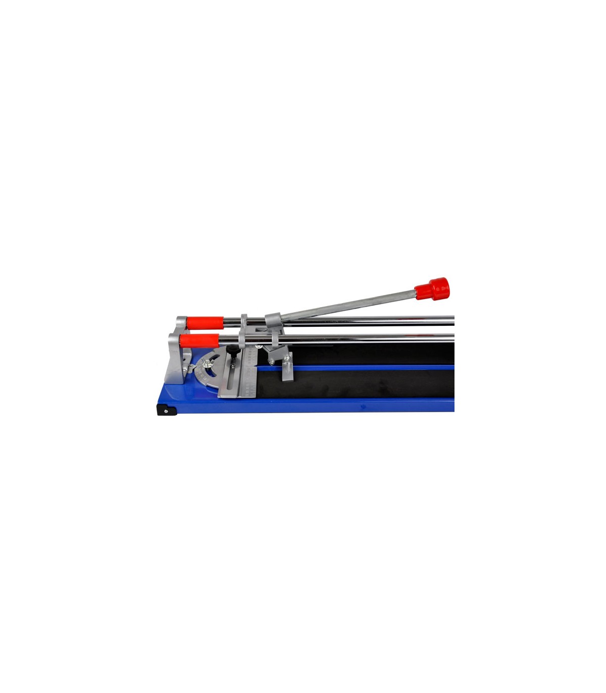 Metalowa linijka maszynki do cięcia płytek glazurniczych pozwala na dokładny pomiar cięcia i ustawienie kąta cięcia w przedziale 0 - 45o.