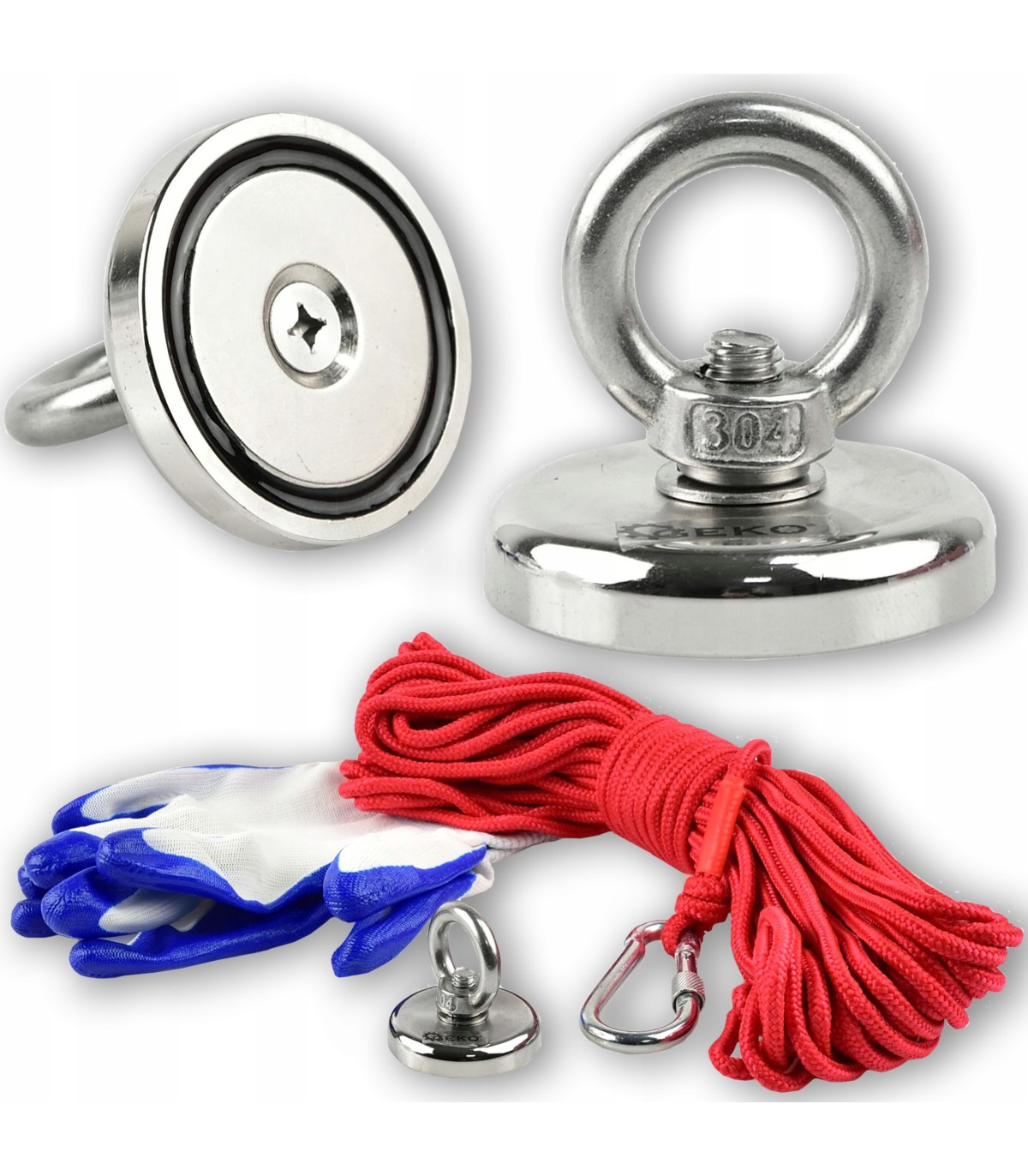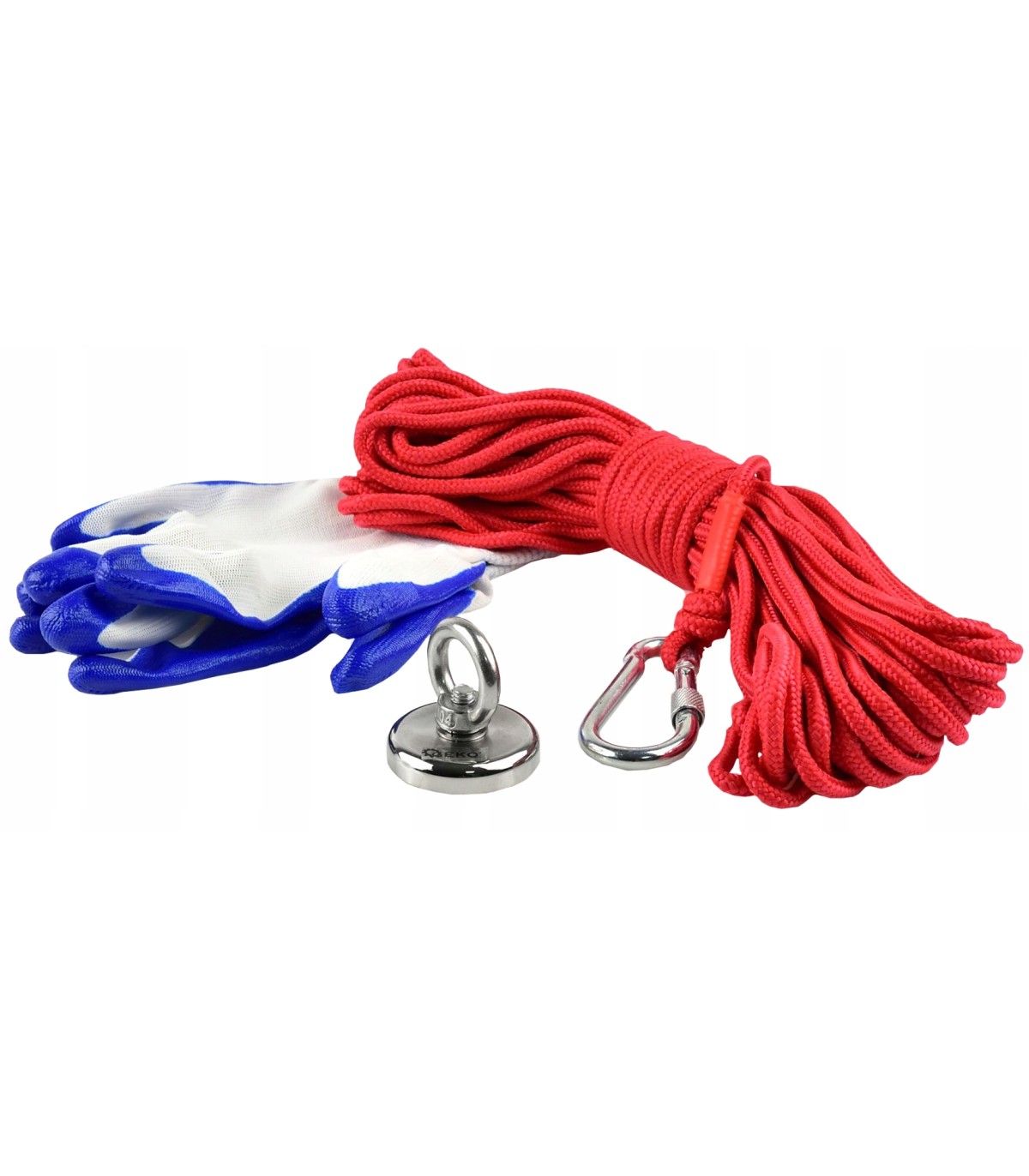 Magnes neodymowy 50kg* z uchwytem górnym, w zestawie z 20m liną, karabińczykiem oraz rękawicami. Tego typu magnesy z powodzeniem wykorzystywane są to poszukiwań metalowych (metale ferromagnetyczne) przedmiotów w wodzie.
