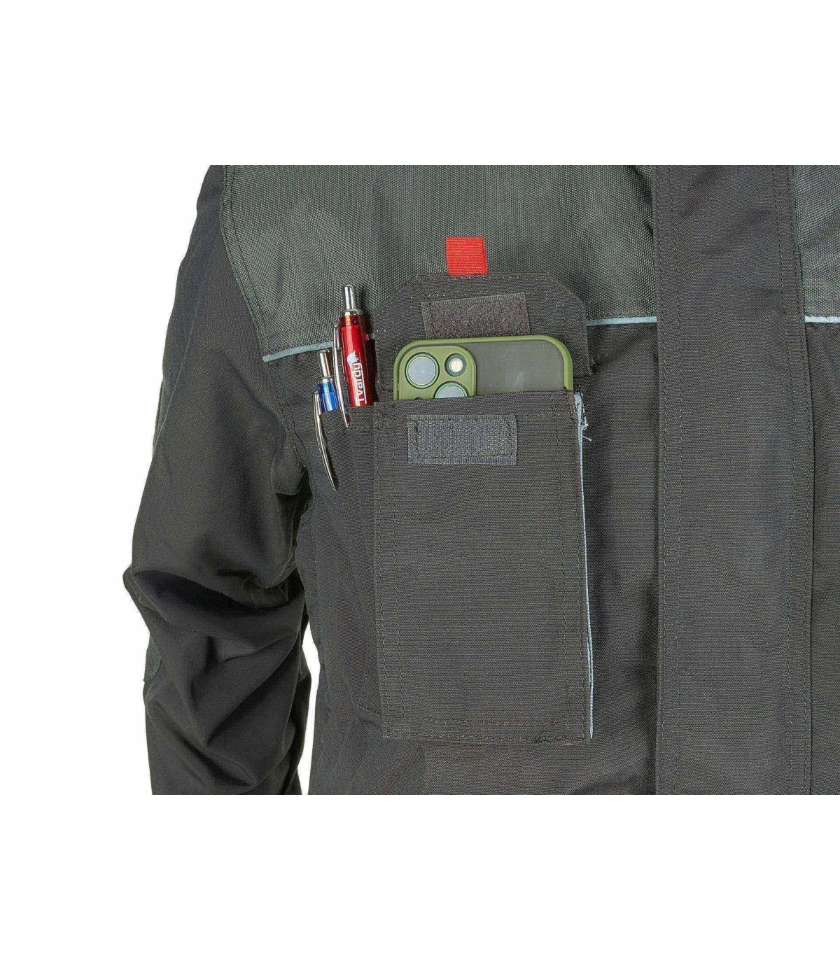 Bluza posiada łącznie 7 praktycznych kieszeni, w tym 4 zapinane na rzep, co umożliwia bezpieczne przechowywanie narzędzi i drobnych przedmiotów. Dedykowana kieszeń na smartphone'a oraz kieszeń na długopis/ołówek zwiększają funkcjonalność, umożliwiając szybki dostęp do niezbędnych akcesoriów. Zamek błyskawiczny zapewnia łatwość zakładania i zdejmowania bluzy.
