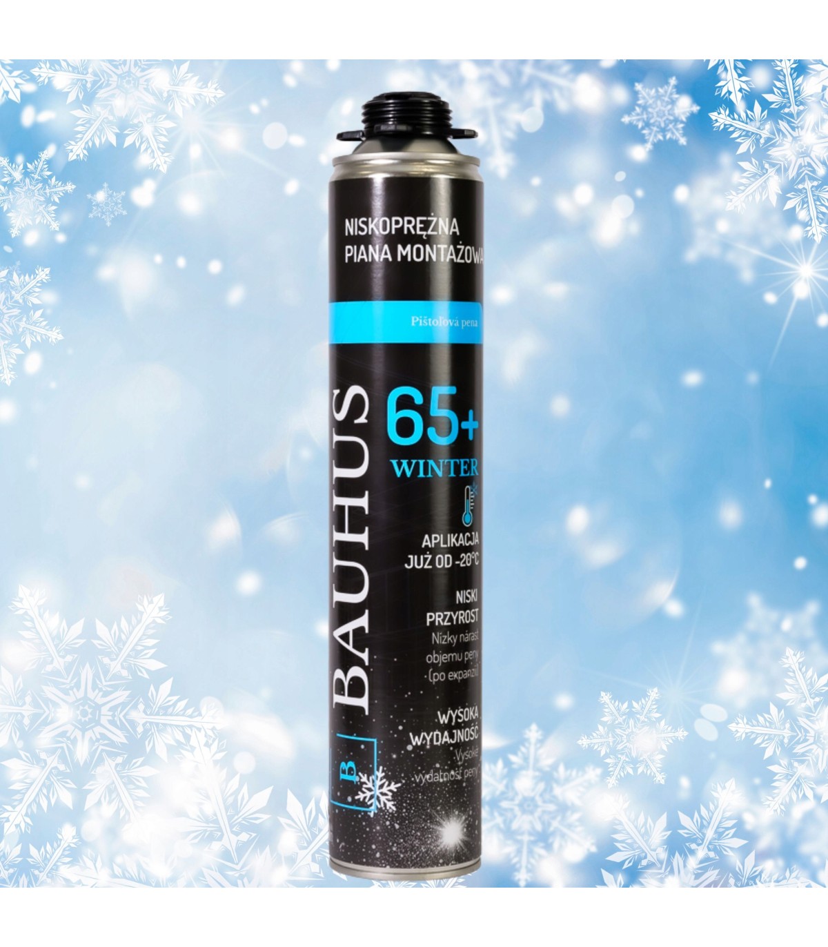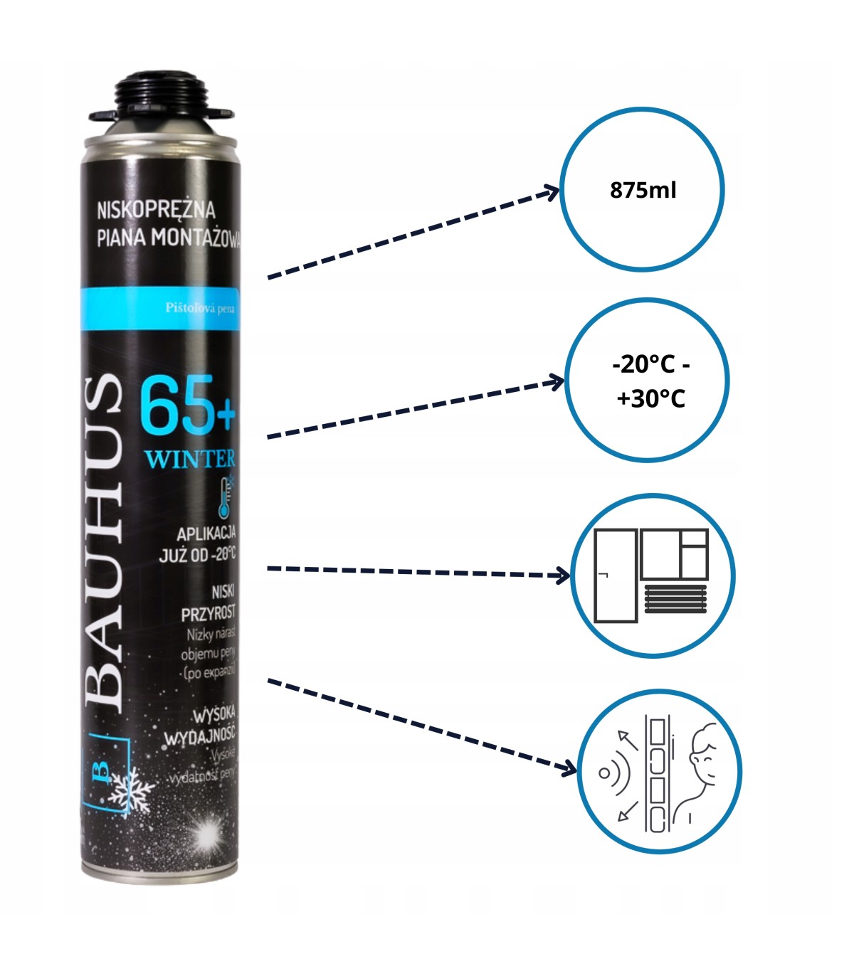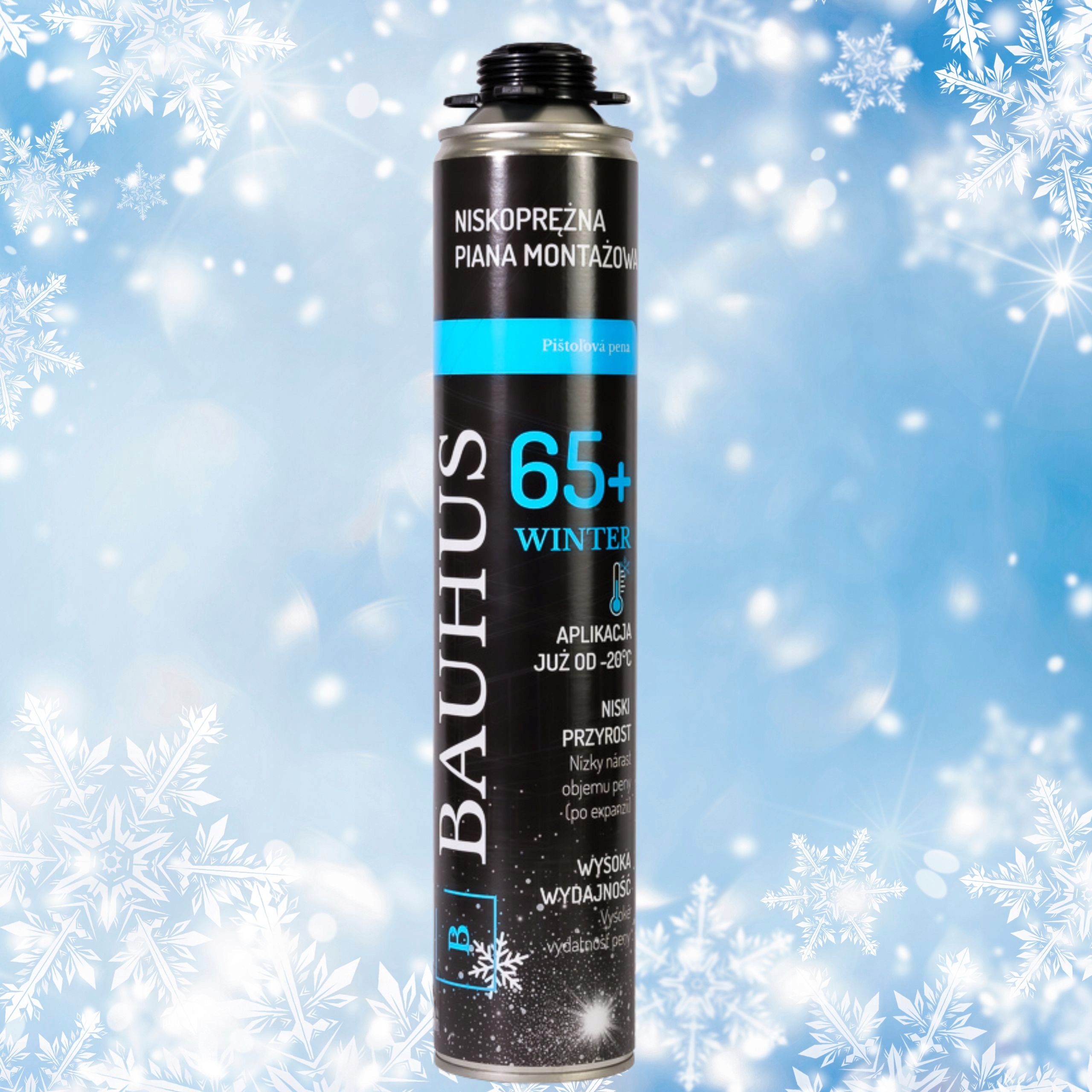 Piana 65+ Bauhus w wersji zimowej to niskoprężna piana pistoletowa o krótkim czasie utwardzania, charakteryzująca się dużą wydajnością i wysoką izolacyjnością termiczną nawet w trudnych, zimowych warunkach.
