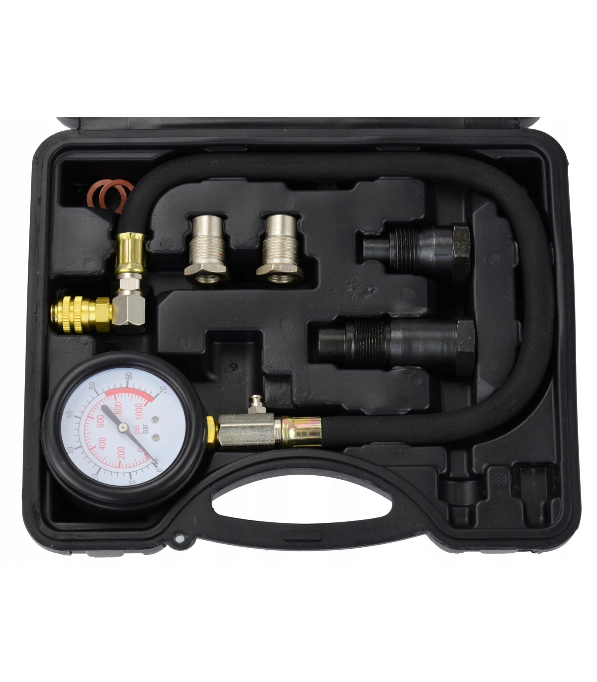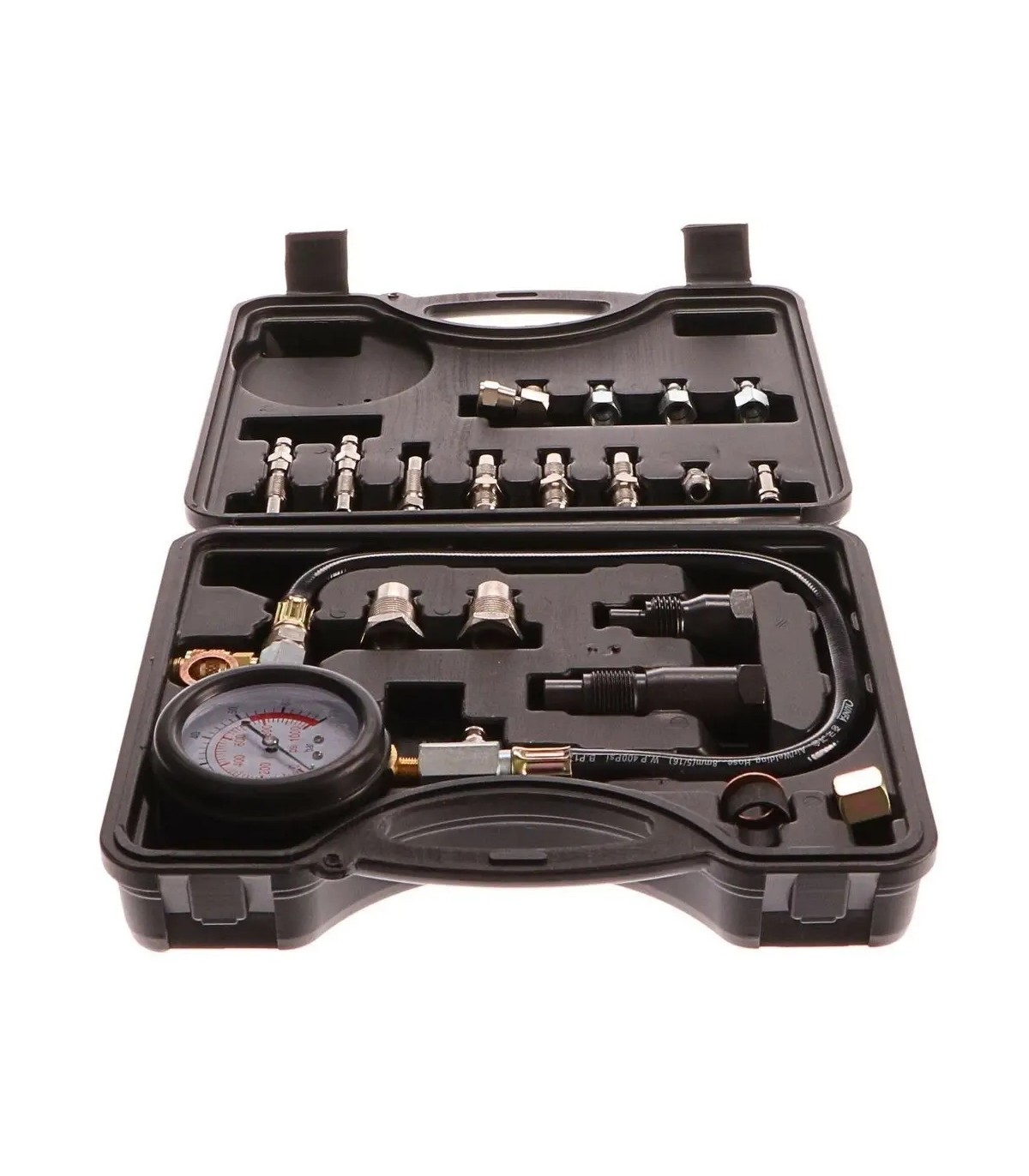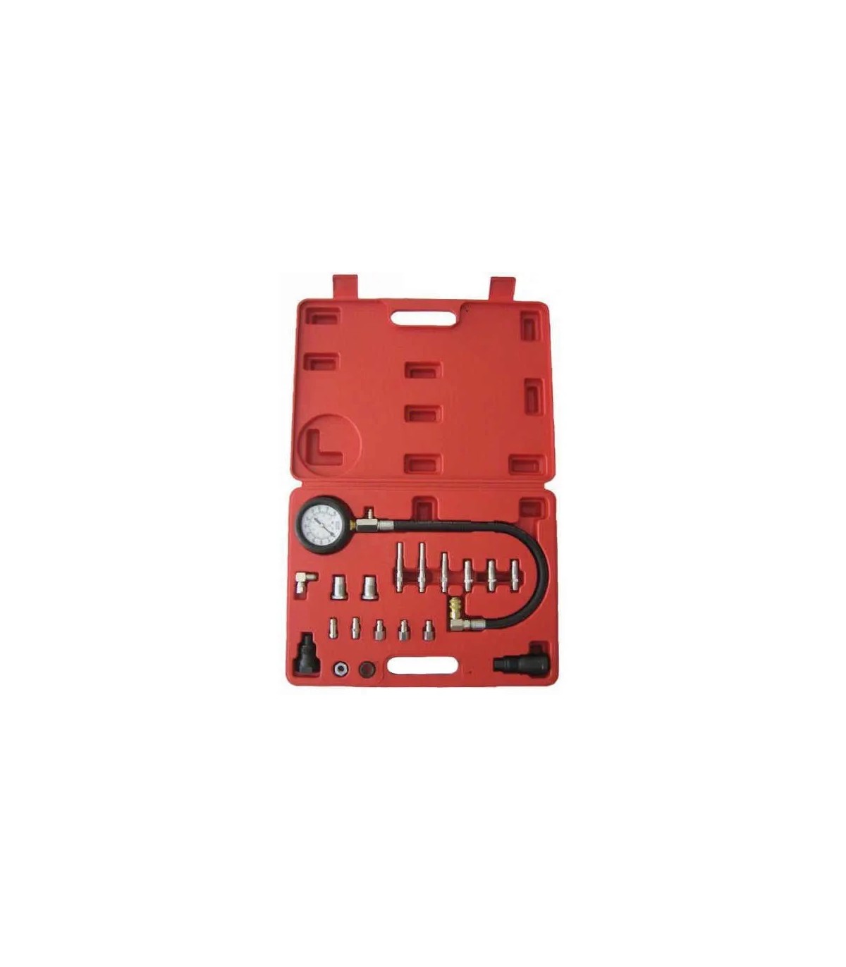 Profesjonalny tester ciśnienia sprężania przeznaczony do samochodów z silnikiem diesela.Zestaw wyposażony jest w zestaw końcówek do większości silników wysokoprężnych produkowanych na świecie.Przeznaczony jest do serwisu motoryzacyjnego, diagnostyki silnika z zapłonem samoczynnym. Zestaw zawiera miernik ciśnienia do 70 BAR (1000 PSI) z przewodem, szybkozłączem i zaworem zwalniającym, adaptery montowane w miejscu wtryskiwacza, oraz adaptery montowane w miejscu świecy żarowej.Znajdzie zastosowanie w samochodach osobowych i dostawczych. Cały Zestaw zapakowany w wygodną walizeczkę, która zapewnia bezpieczny transport jak i przechowywanie.