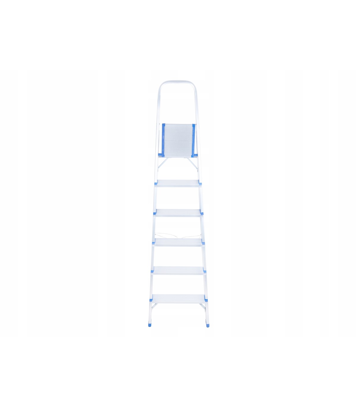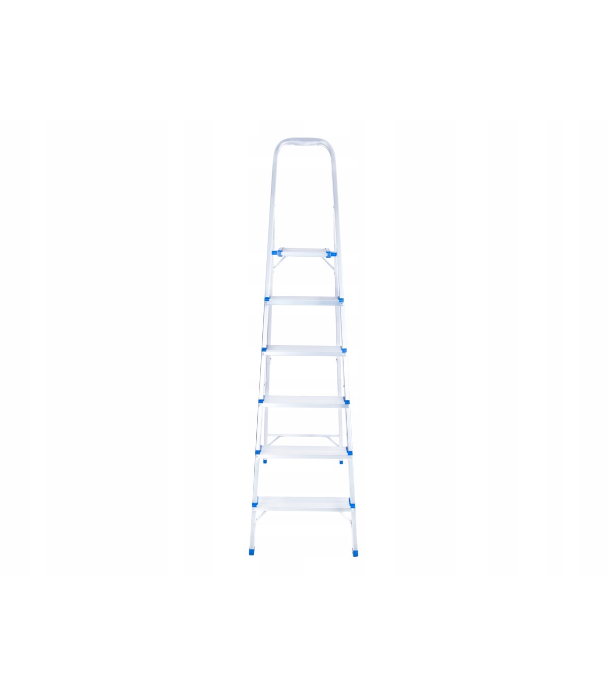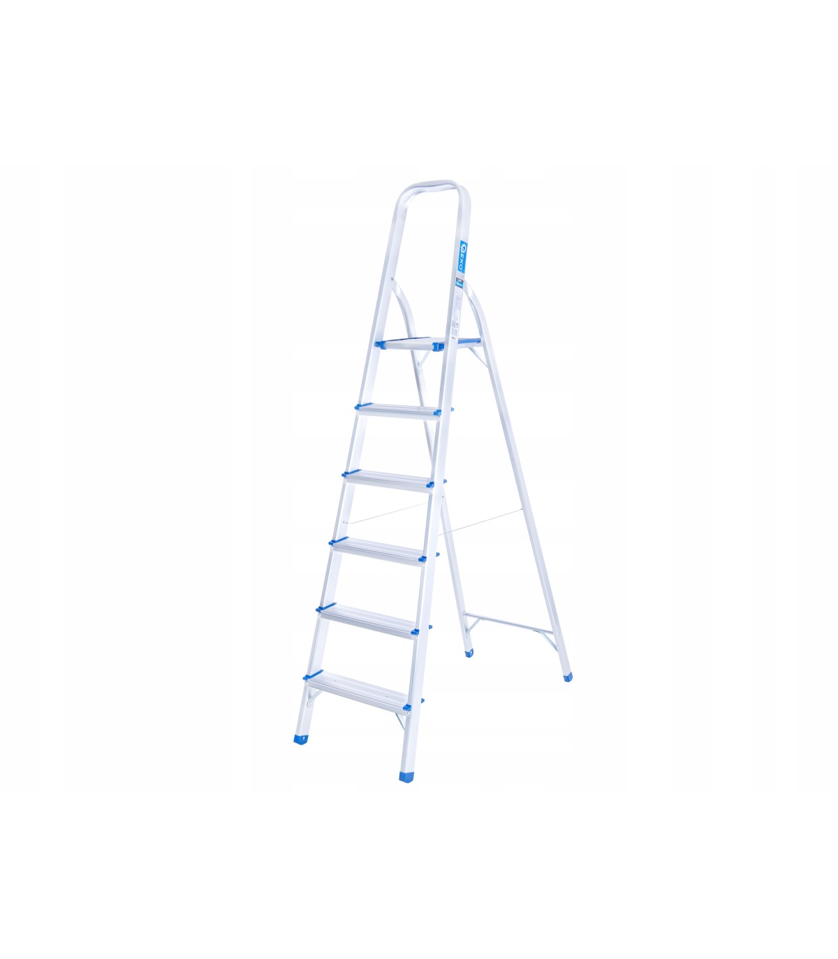 Drabina oferuje 6 poziomów roboczych – 5 dolnych stopni oraz podest główny na górze.