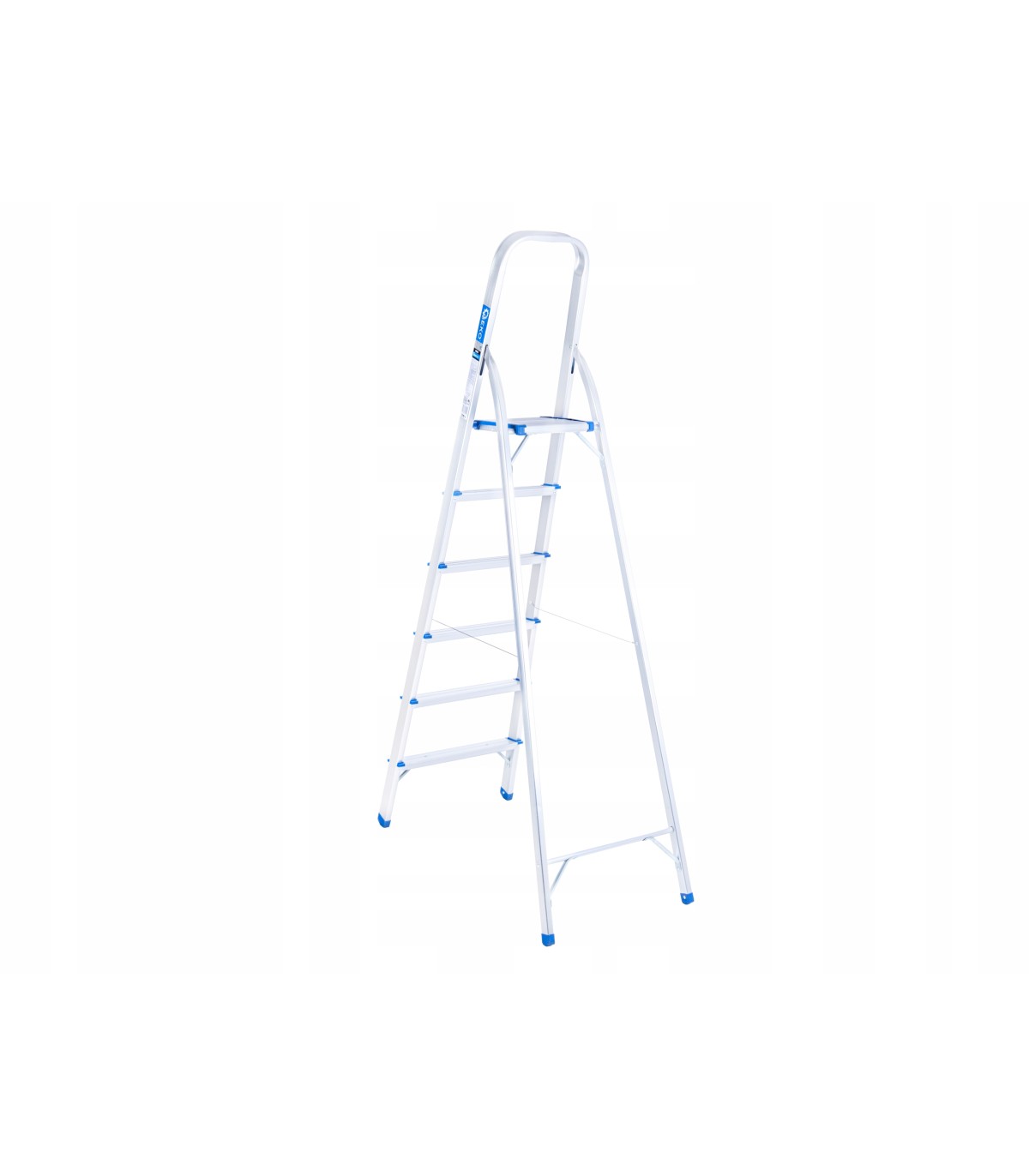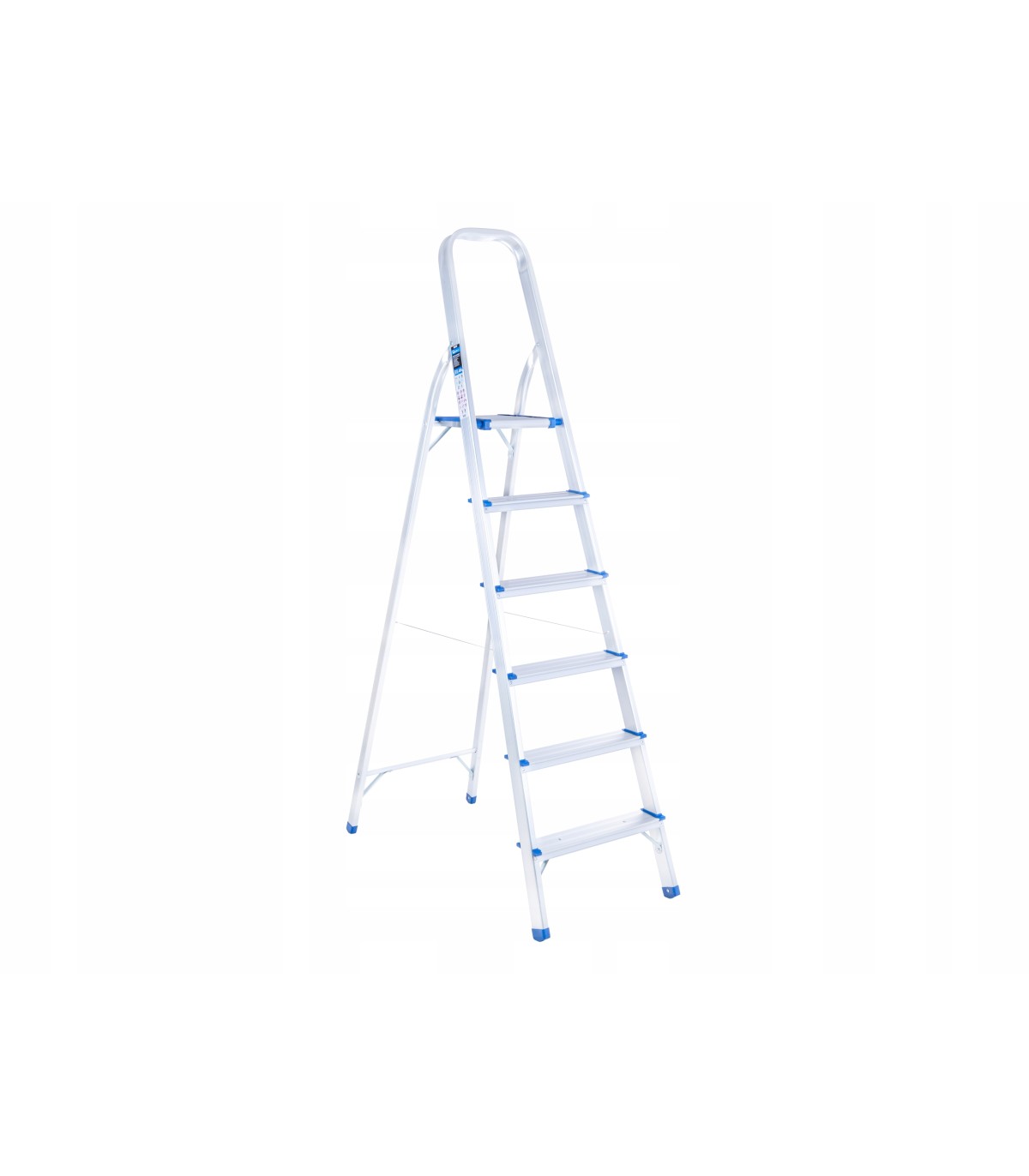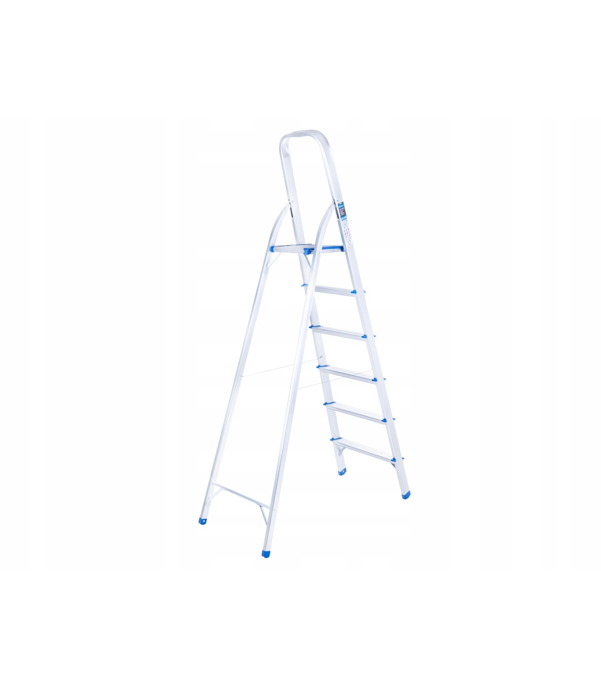 Drabina oferuje 6 poziomów roboczych – 5 dolnych stopni oraz podest główny na górze.
