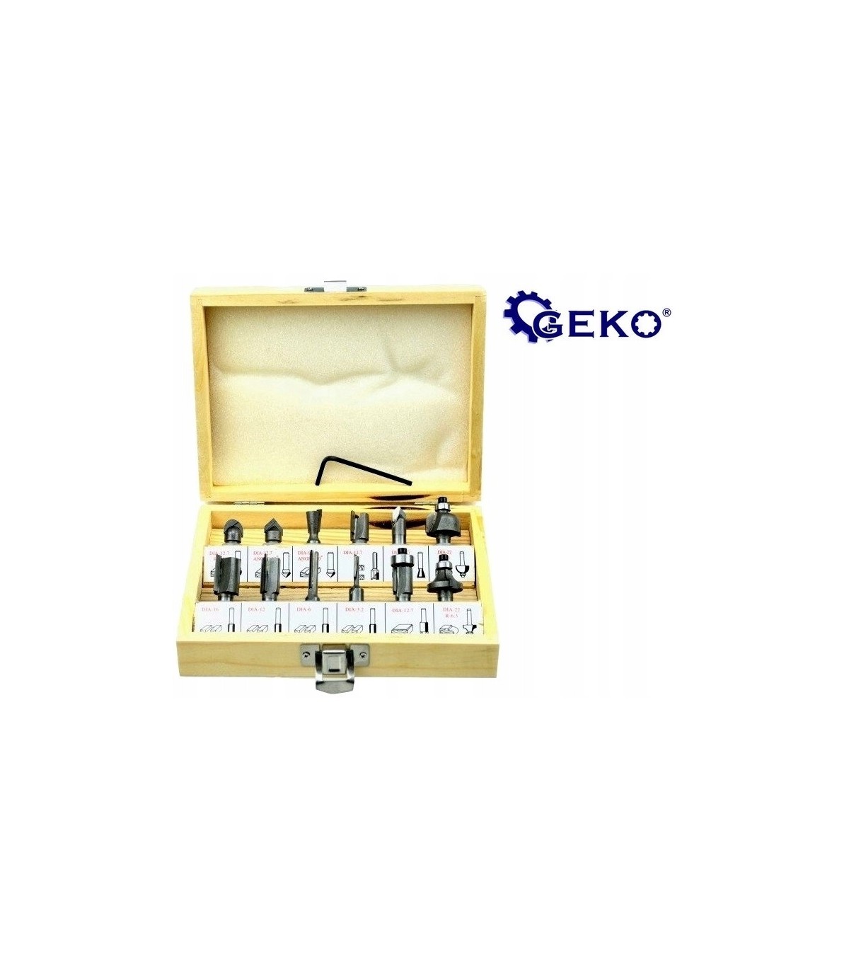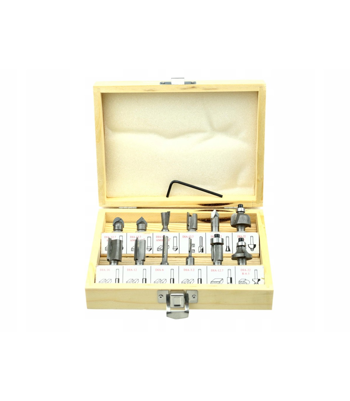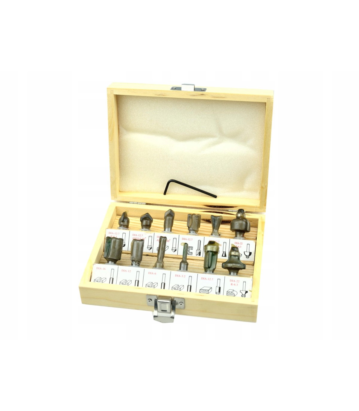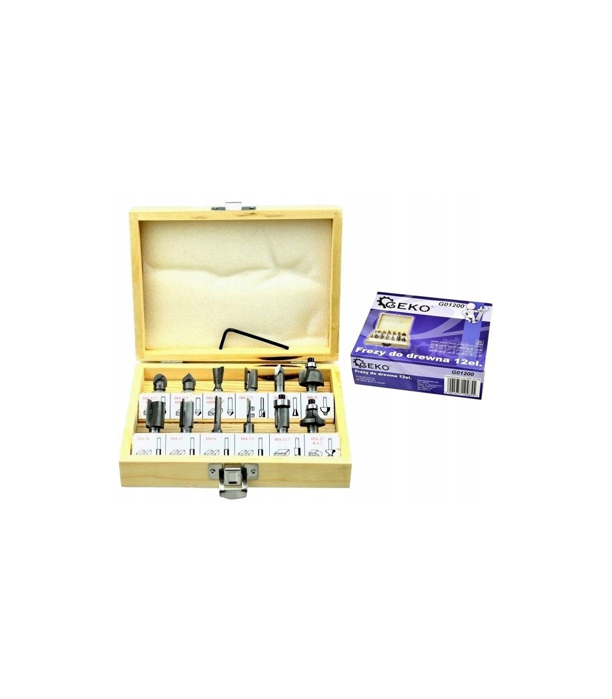 Zestaw 12 frezów kształtowych do drewna pozwalające na precyzyjną obróbkę materiału. Ostrza frezów wykonane są ze stali szybkotnącej HSS co sprawia, że narzędzia te mogą być stosowane do obróbki drewna litego, płyty wiórowej, MDF i innych materiałów drewnopochodnych. Zastosowane łożyska, zmniejszają opór toczenia, dlatego frezy idealnie nadają się do kształtowania obłych materiałów. Całość w praktycznej drewnianej walizce, gdzie każdy frez ma swoje podpisane miejsce.