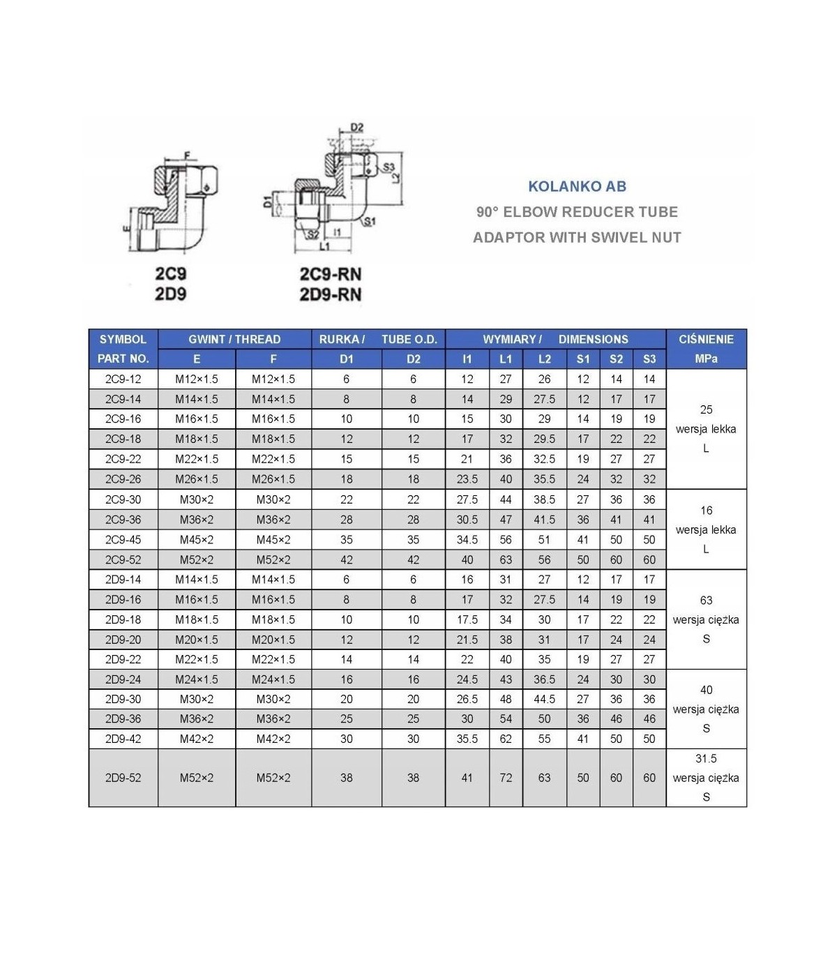 Złącze kolankowe - z jednej strony gwint zewnętrzny , z drugiej strony ruchoma nakrętka. Złączka stosowana w układach hydraulicznych pozwala na przeprowadzanie przewodów w kanałach nawet pod kątem prostym. Występuje w gwintach calowych oraz metrycznych. Występuje również jako złączka redukcyjna. Wykonana z wysokiej jakości stali automatowej. Pokryte warstwą antykorozyjną o-cynk w pasywacji białej. Element wykonany z odkuwki ( monoblok ). Elementy nie są lutowane! Występują w wersji lekkiej L. oraz ciężkiej S.