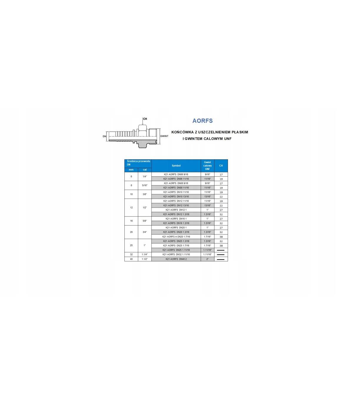 Końcówka prosta AORFS (K21) z gwintem zewnętrznym UNF z uszczelnieniem płaskim.