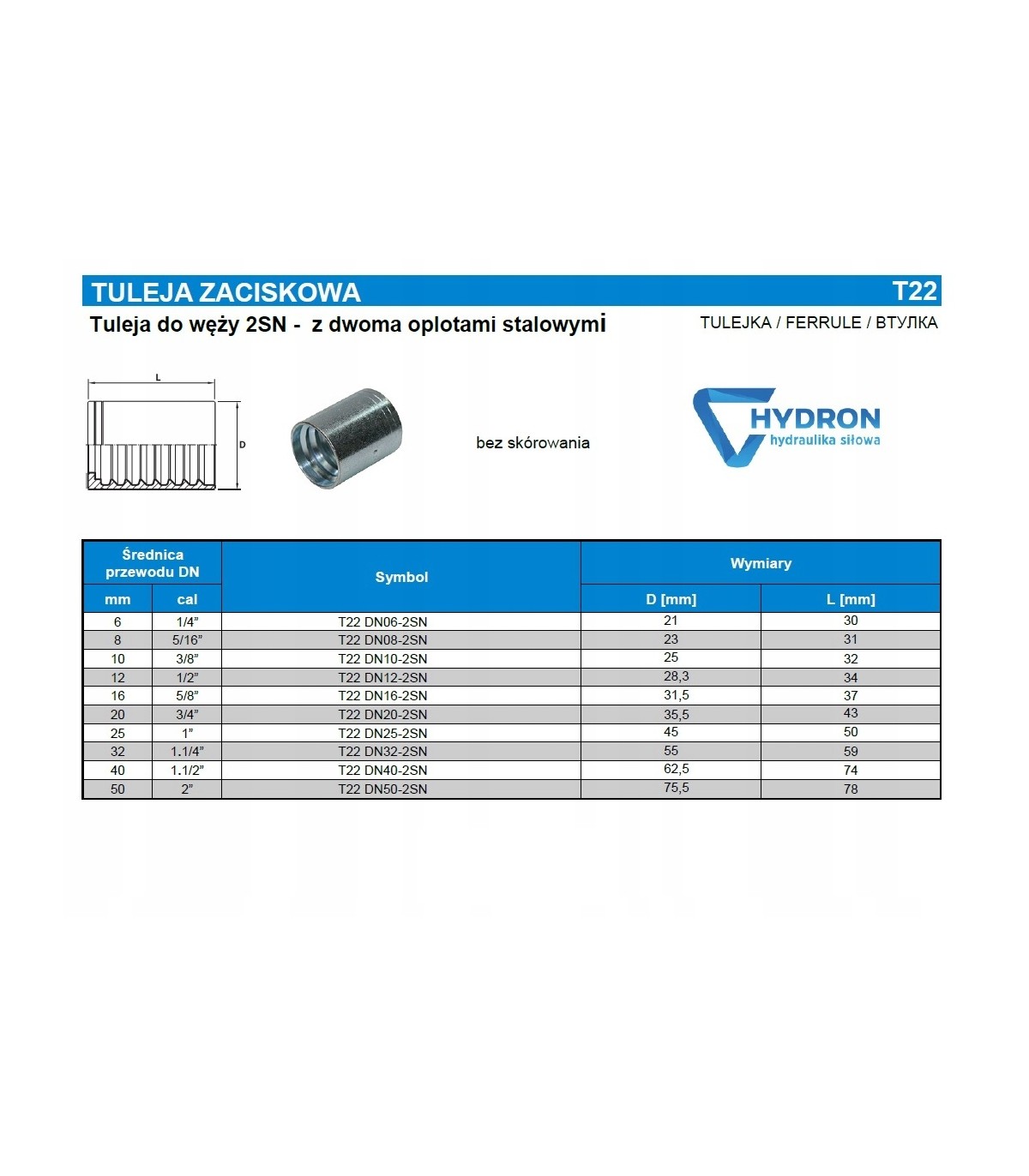 Tuleja ( oprawka zaciskowa ) przeznaczona do zaciskania na wężach 2SN. Tuleje na wąż bez skórowania ( no skive ). Materiał : stal węglowa ocynkowana. Alternatywne oznaczenie : PHN206. Karton = 700szt.