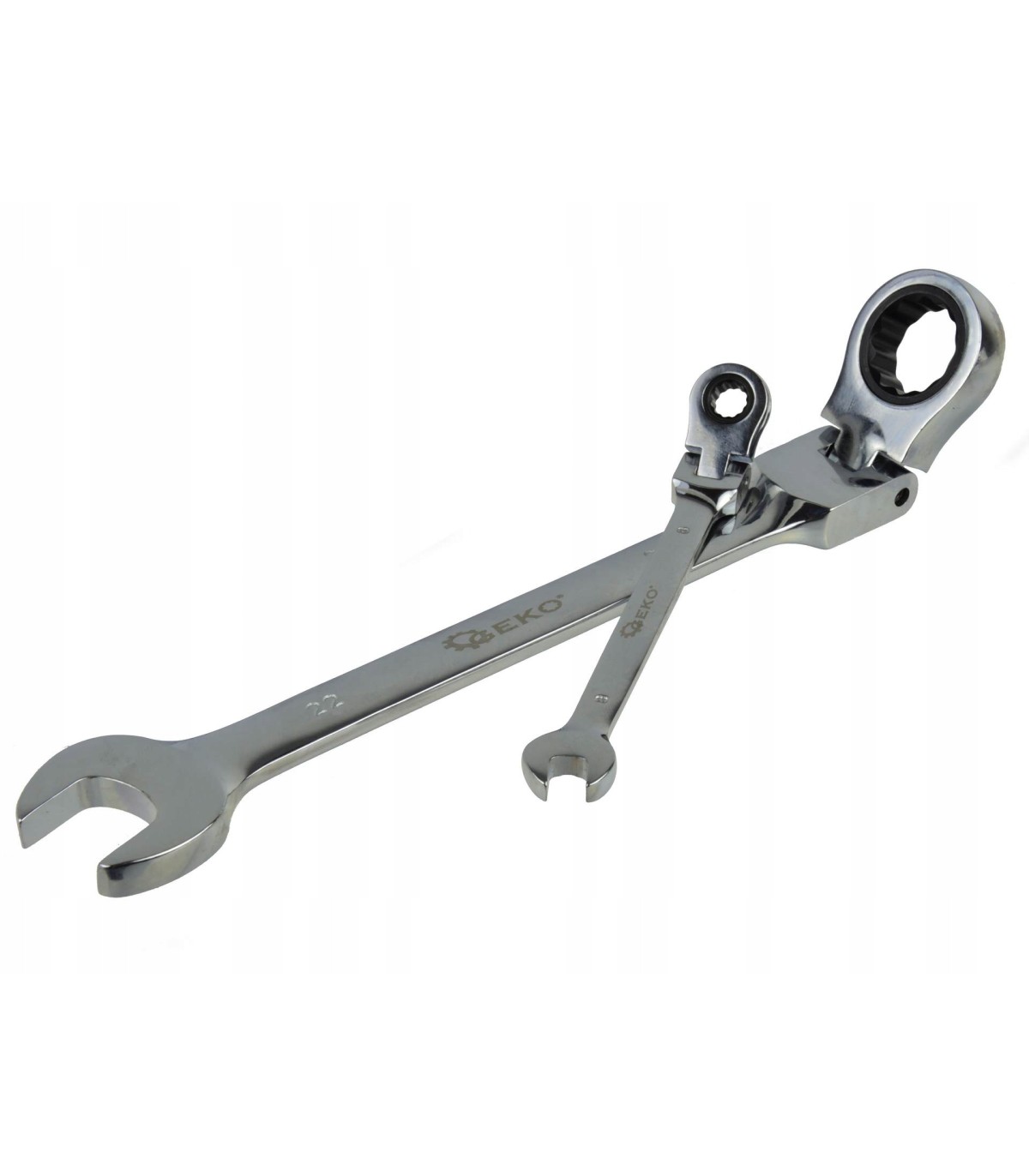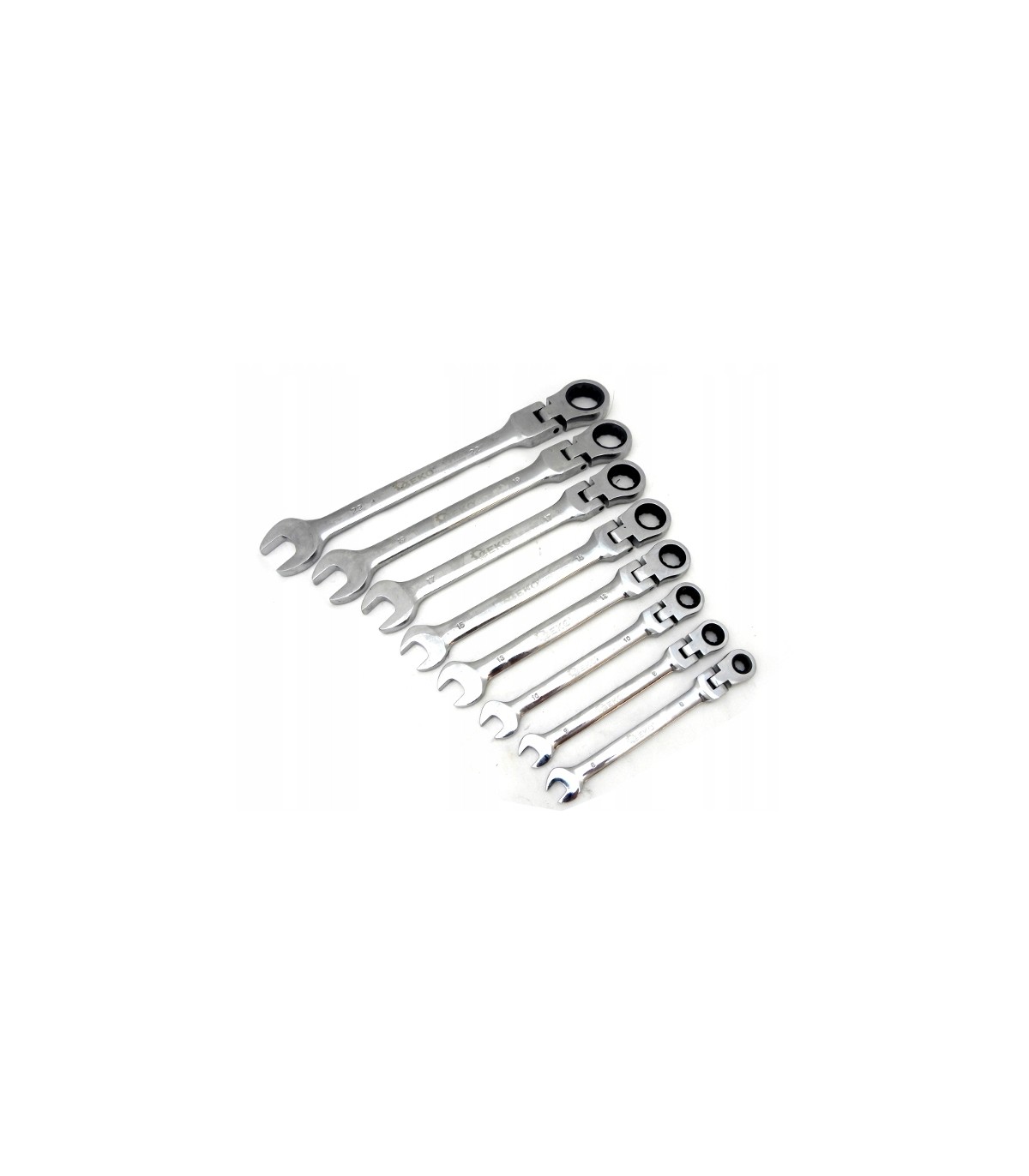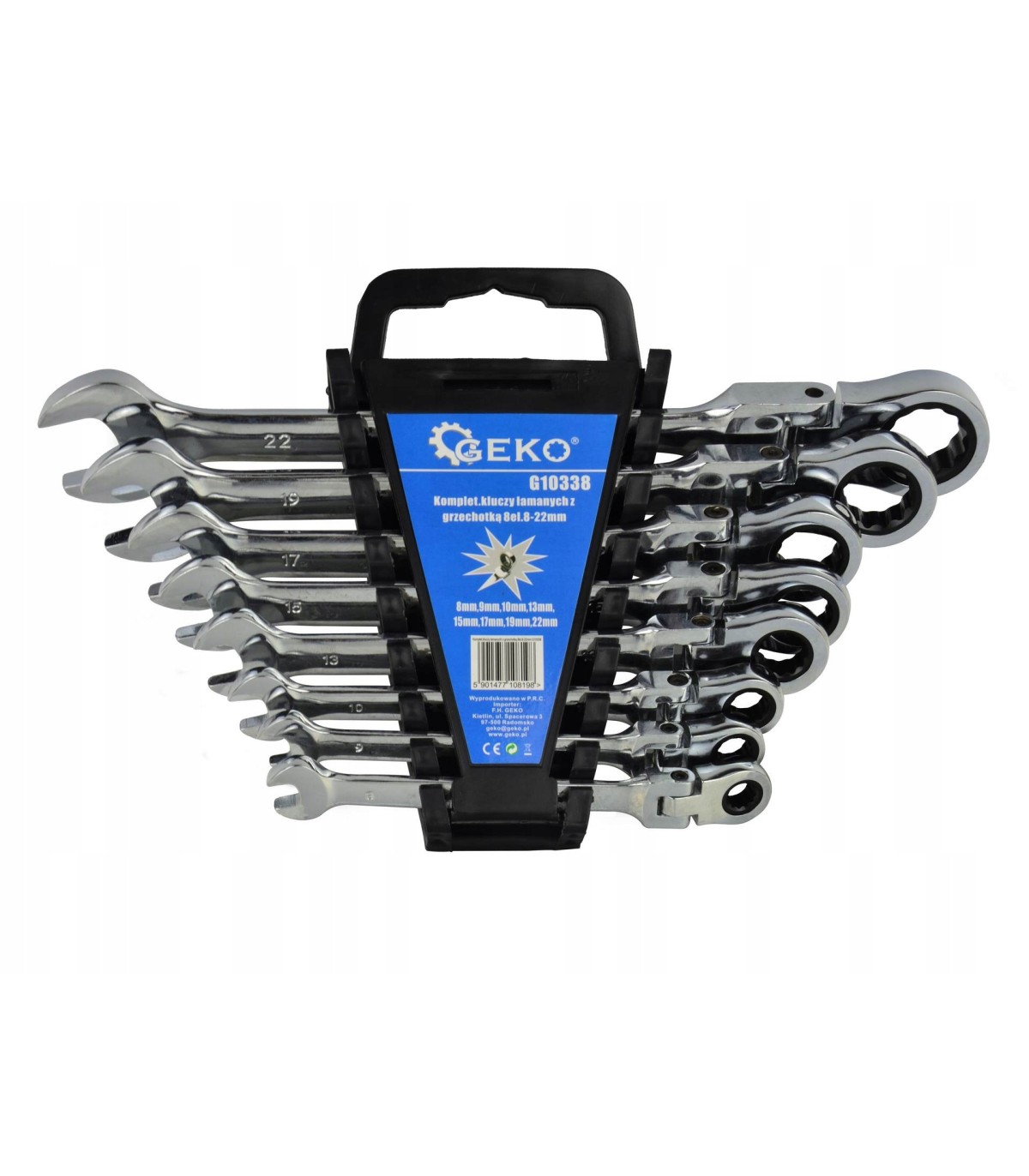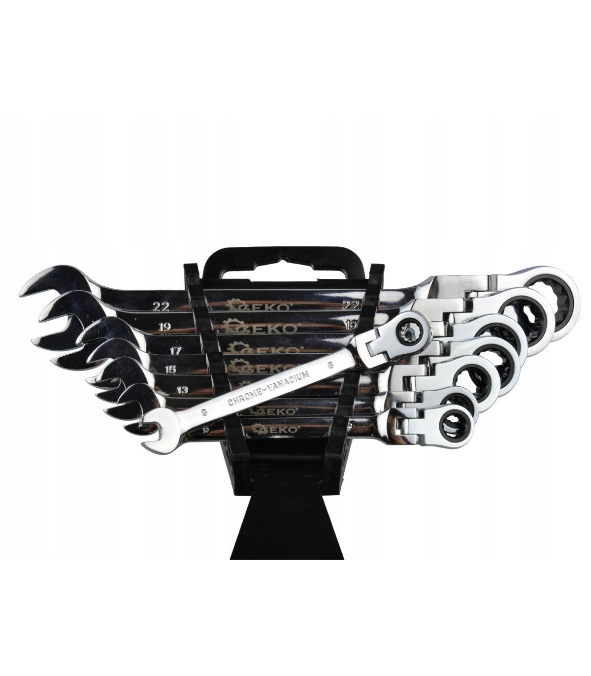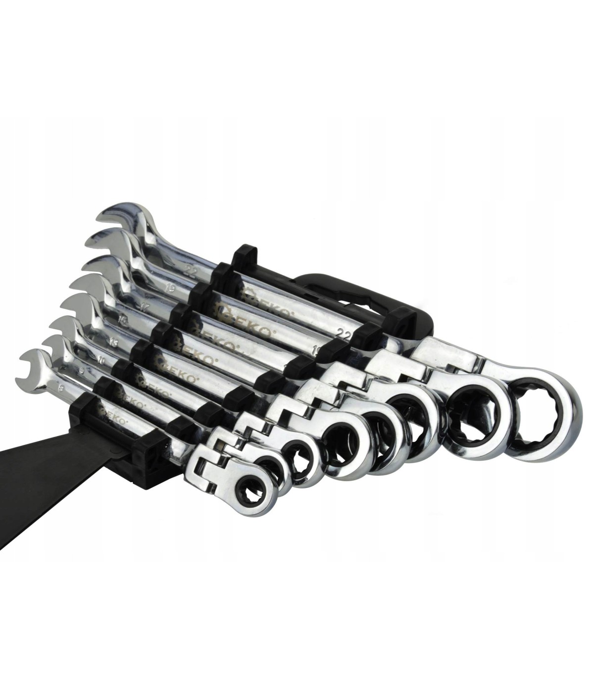 Komplet kluczy płasko-oczkowych wykonanych z trwałej stali CRV, wyposażonych porządne grzechotki.