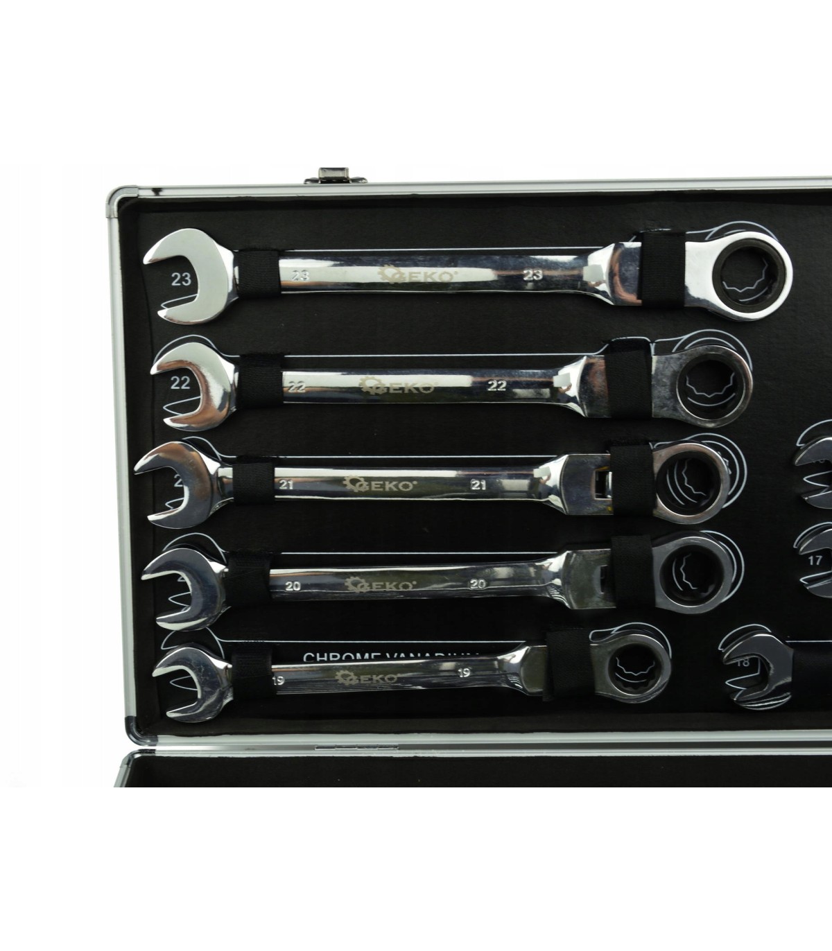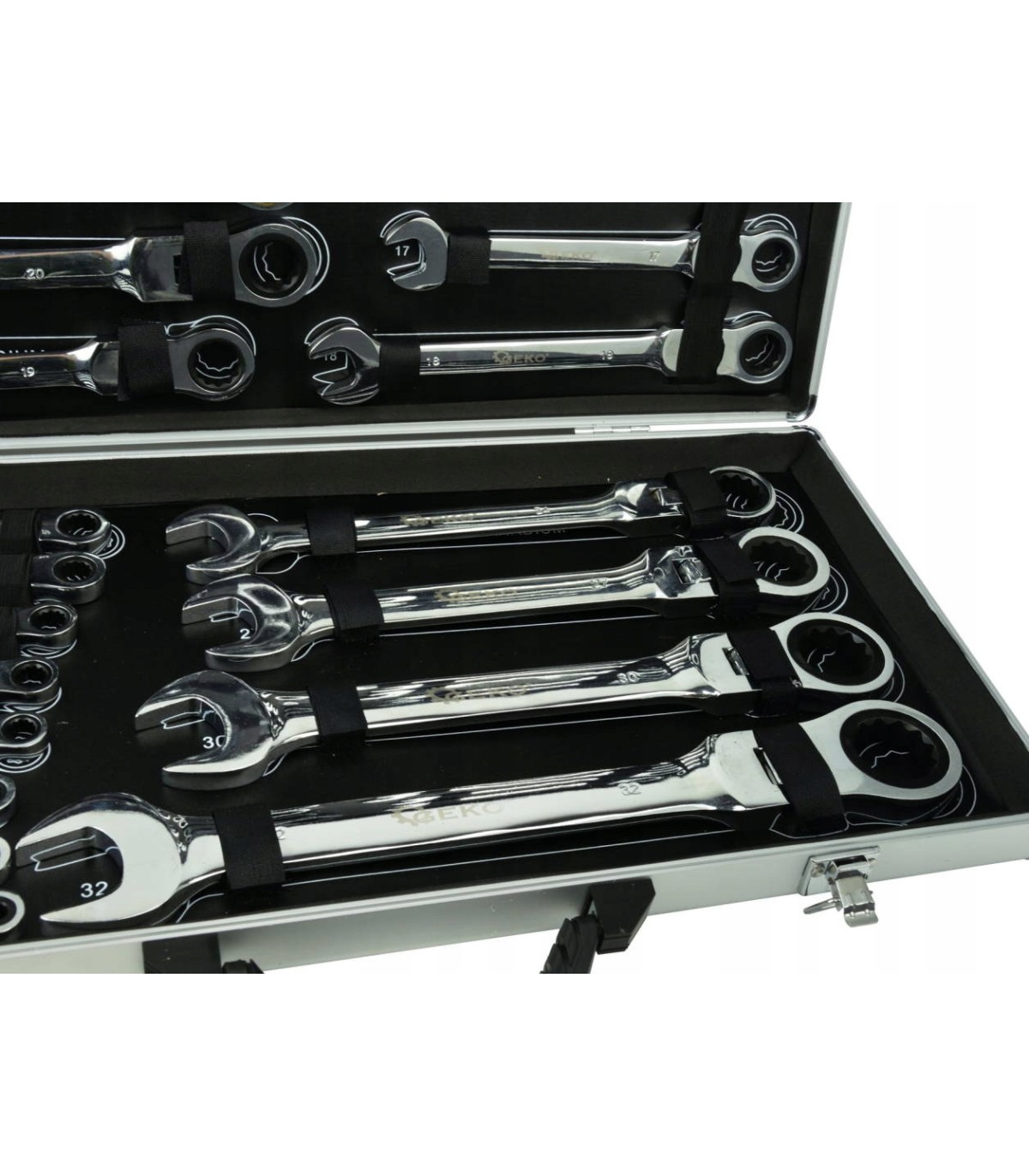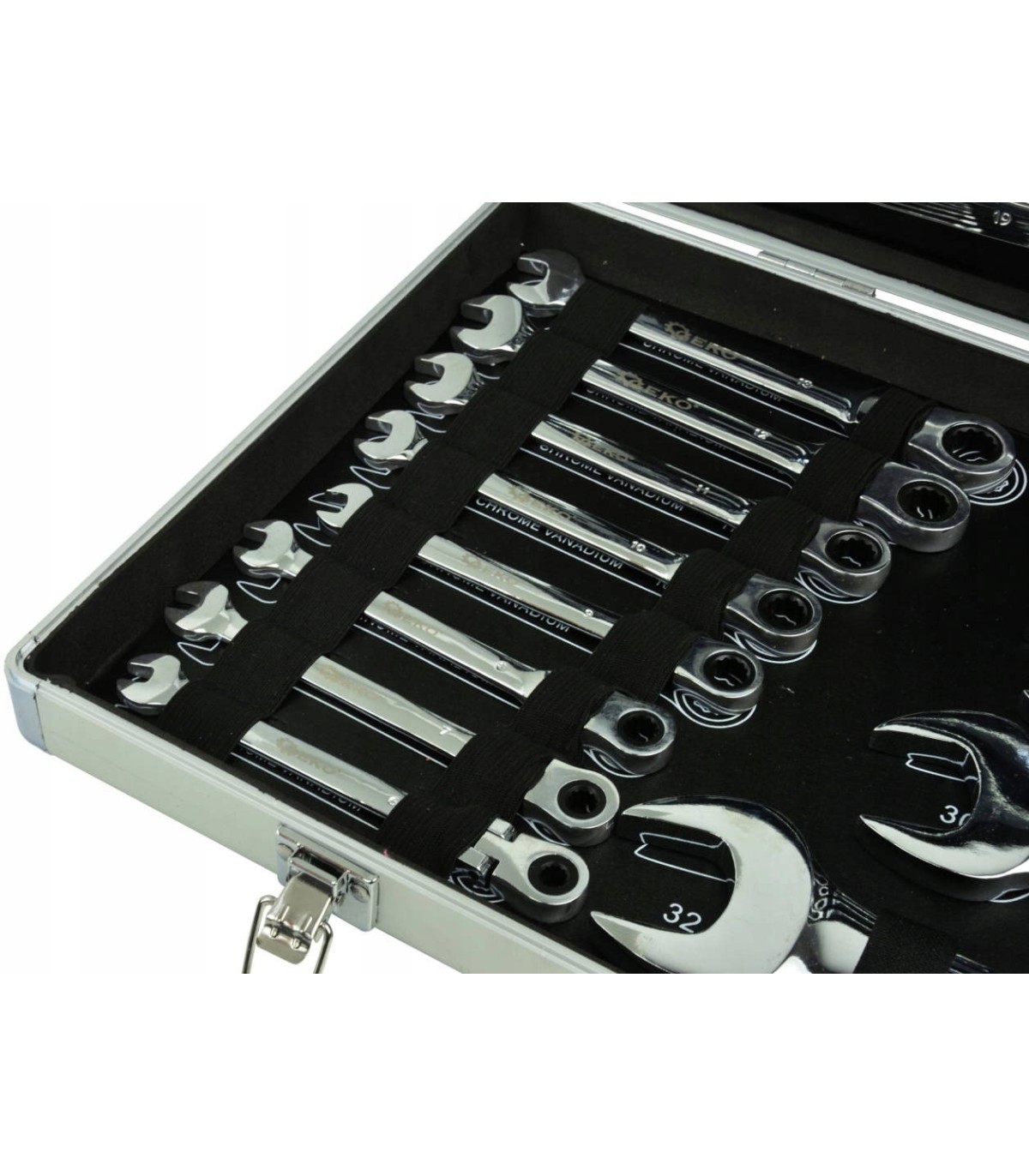 Wysokiej klasy zestaw kluczy płasko oczkowych z grzechotką.