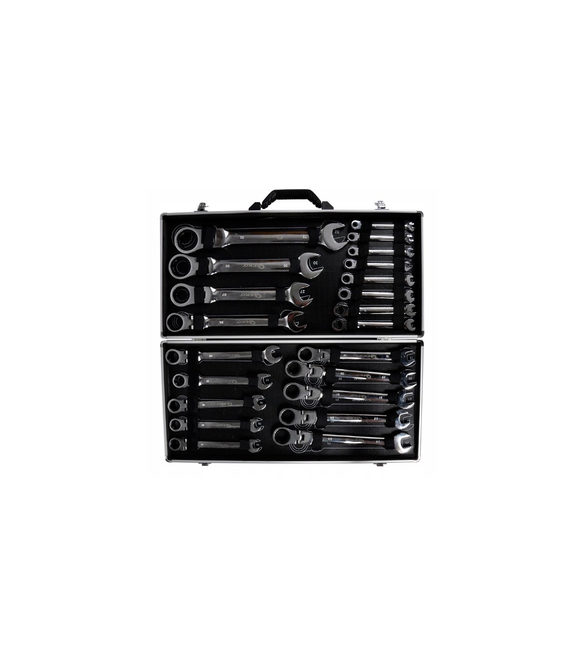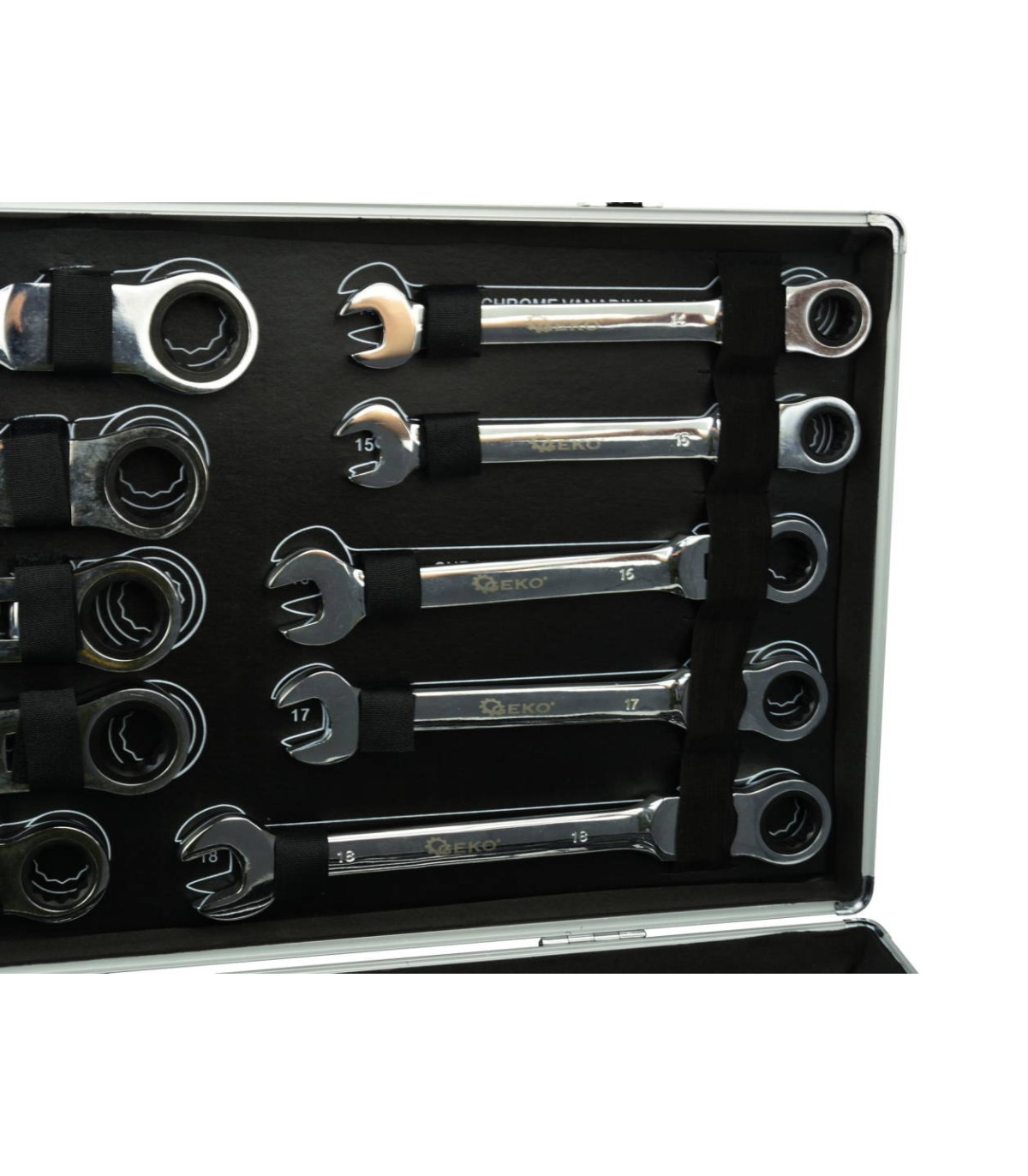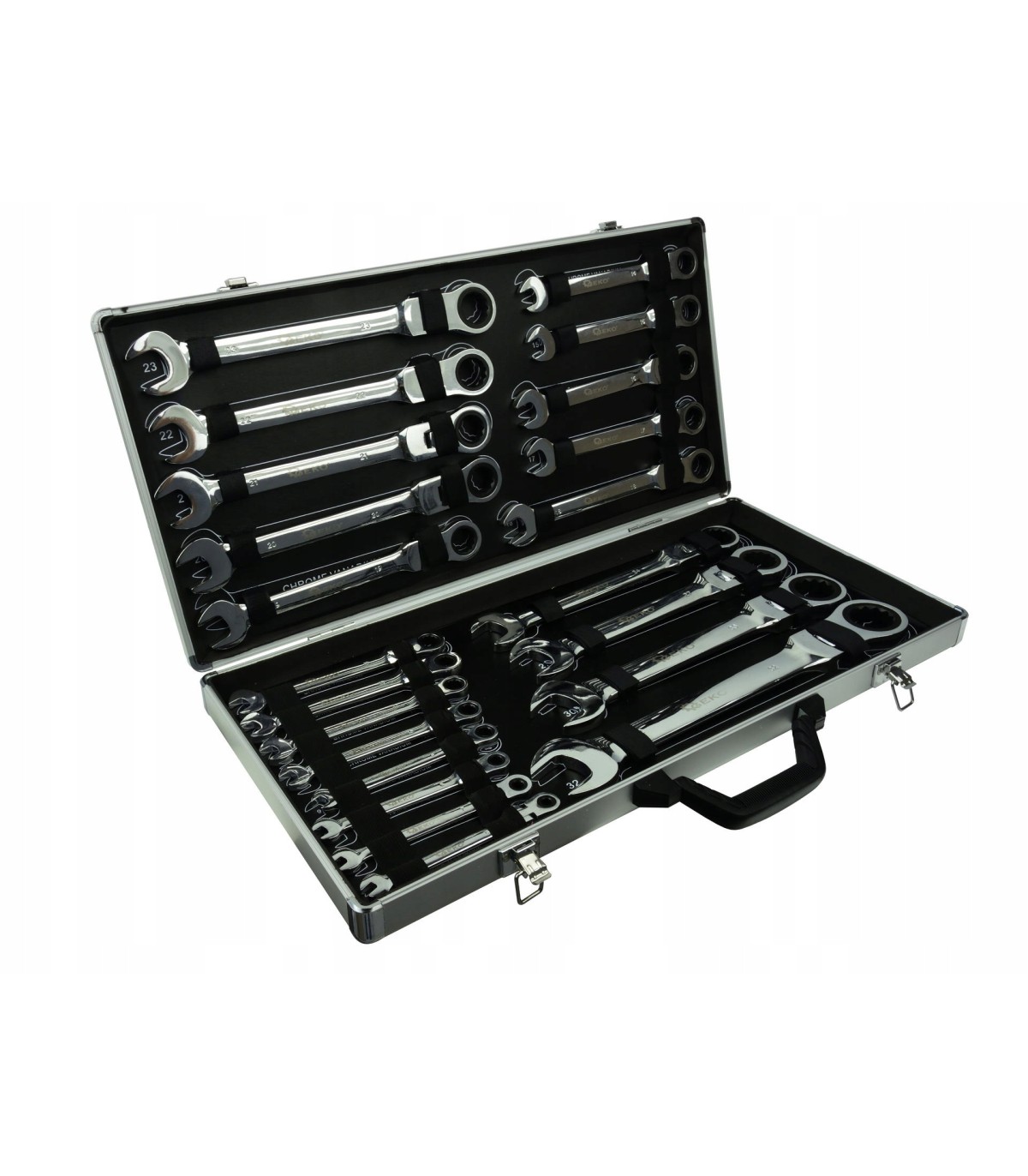 Wysokiej klasy zestaw kluczy płasko oczkowych z grzechotką.