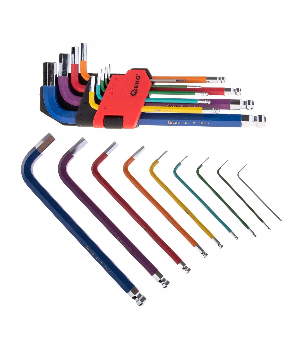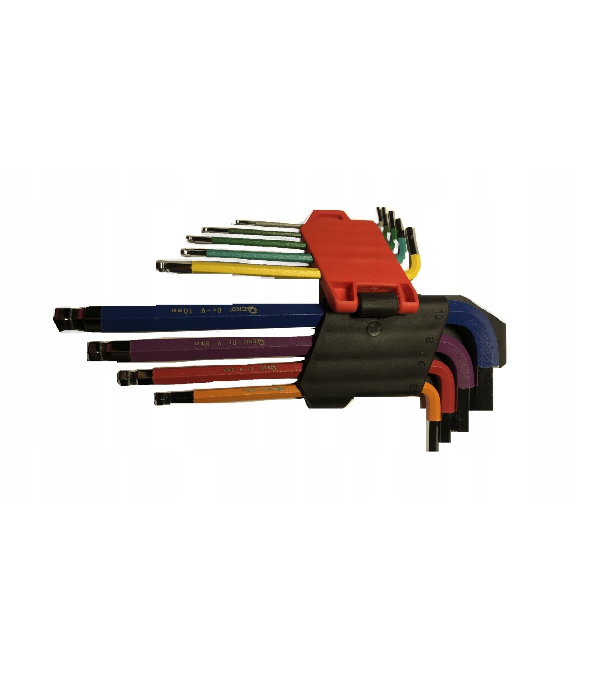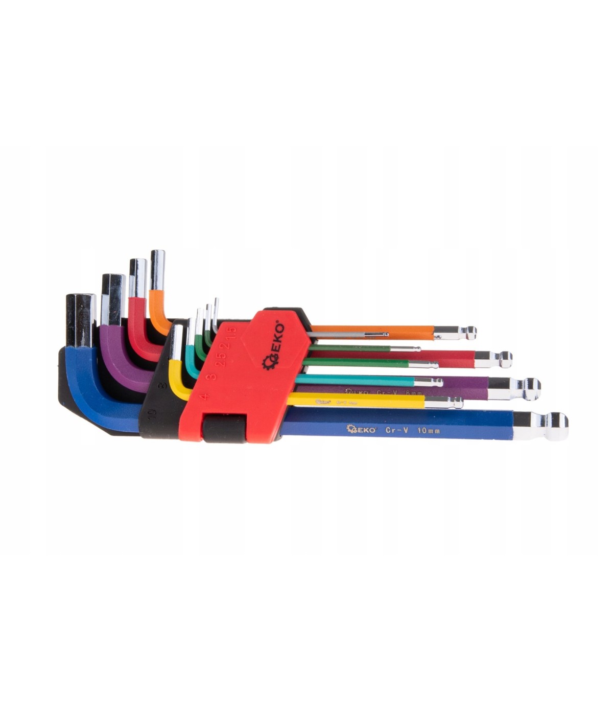 Dzięki kulkowym końcówkom możliwe jest operowanie kluczem pod kątem 25 stopni, co ułatwia dostęp do trudno dostępnych miejsc. Zestaw obejmuje 9 kluczy w różnych kolorach, co ułatwia szybkie rozróżnianie rozmiarów.