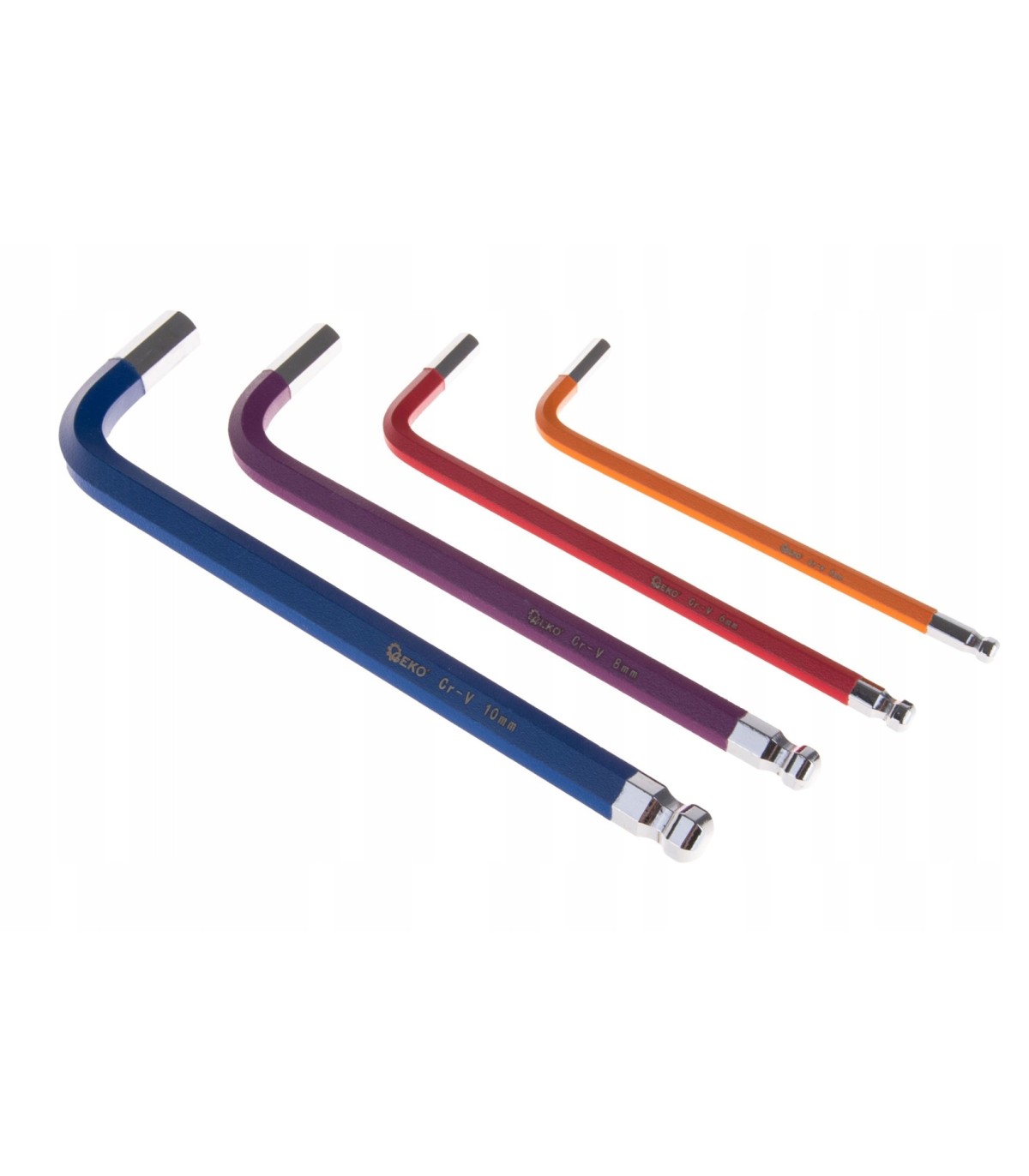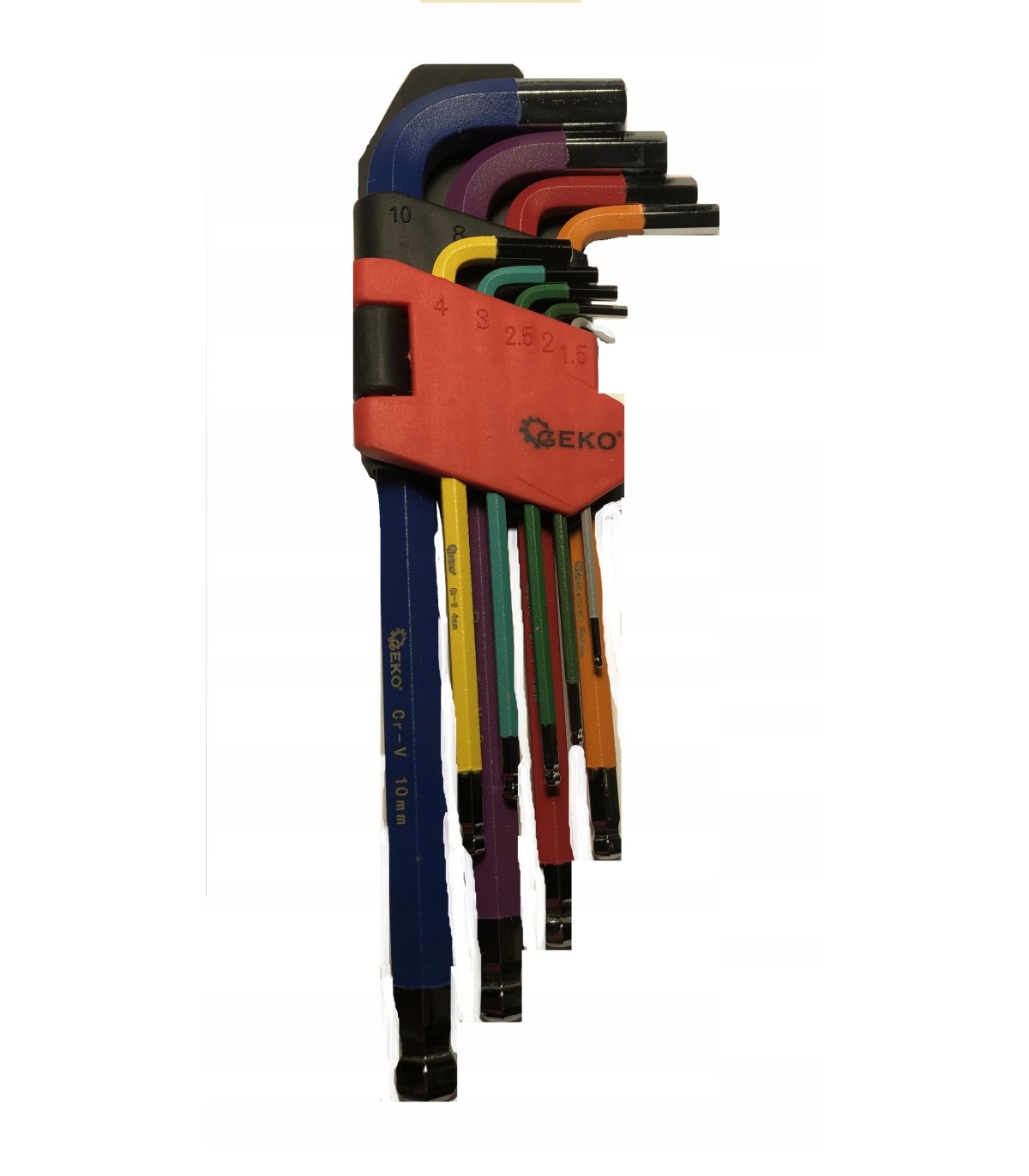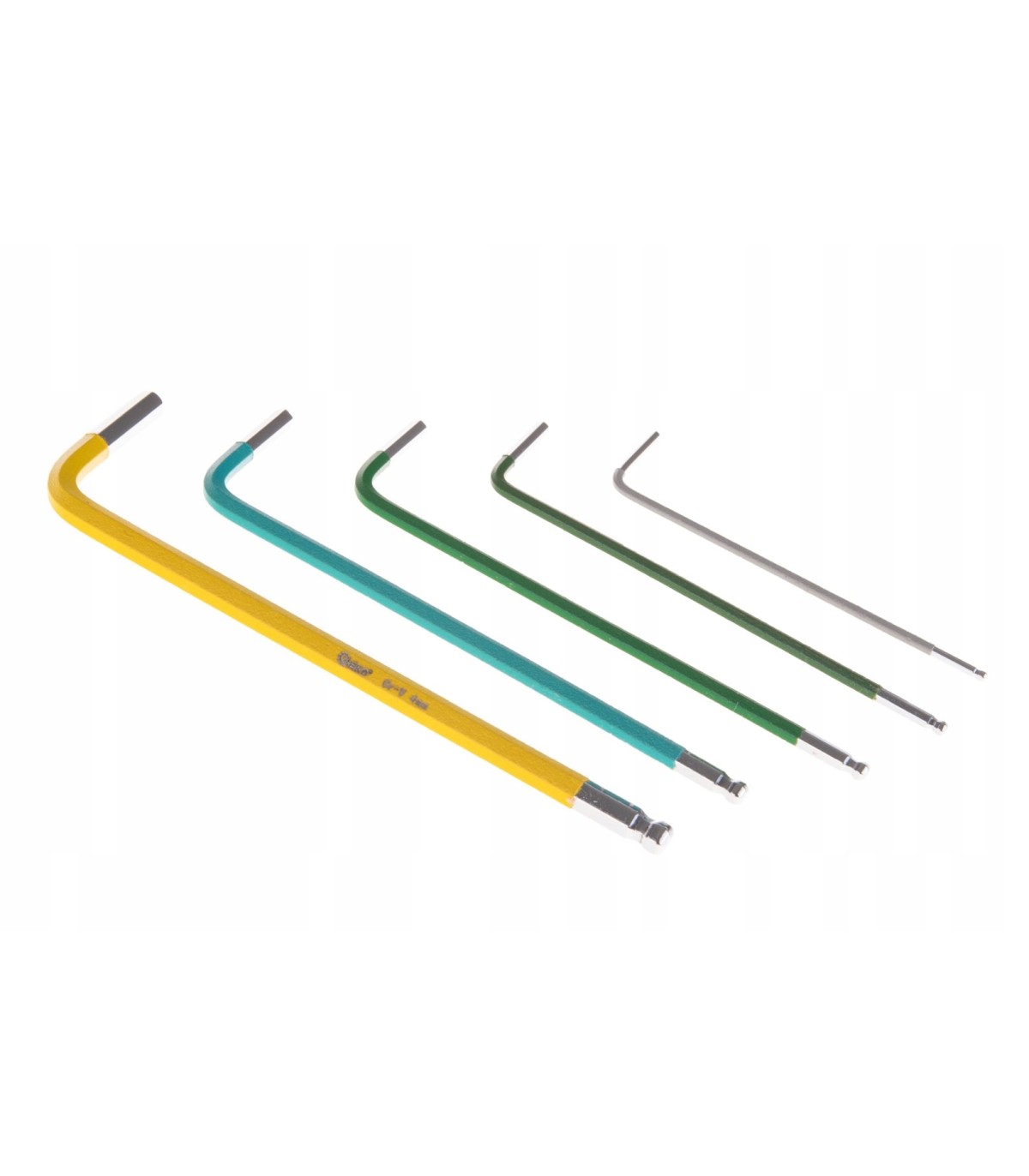 Dzięki kulkowym końcówkom możliwe jest operowanie kluczem pod kątem 25 stopni, co ułatwia dostęp do trudno dostępnych miejsc. Zestaw obejmuje 9 kluczy w różnych kolorach, co ułatwia szybkie rozróżnianie rozmiarów.