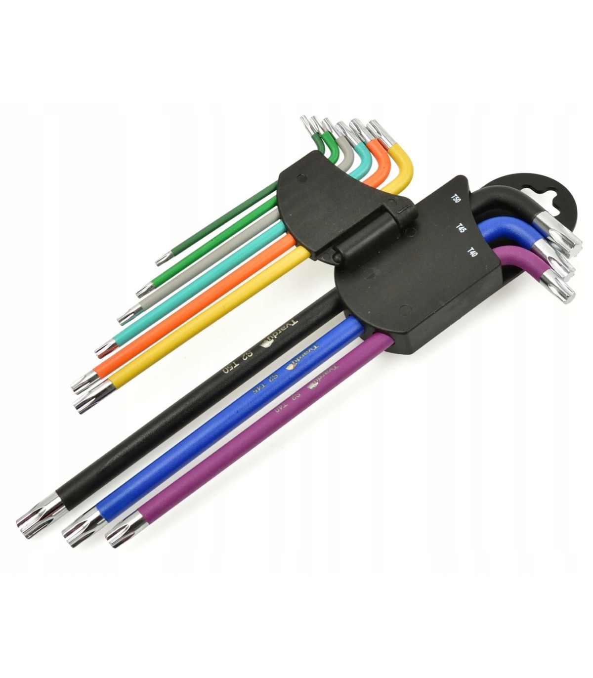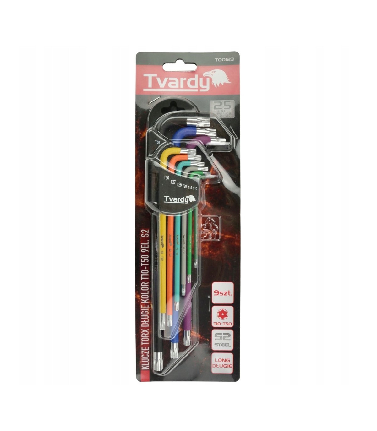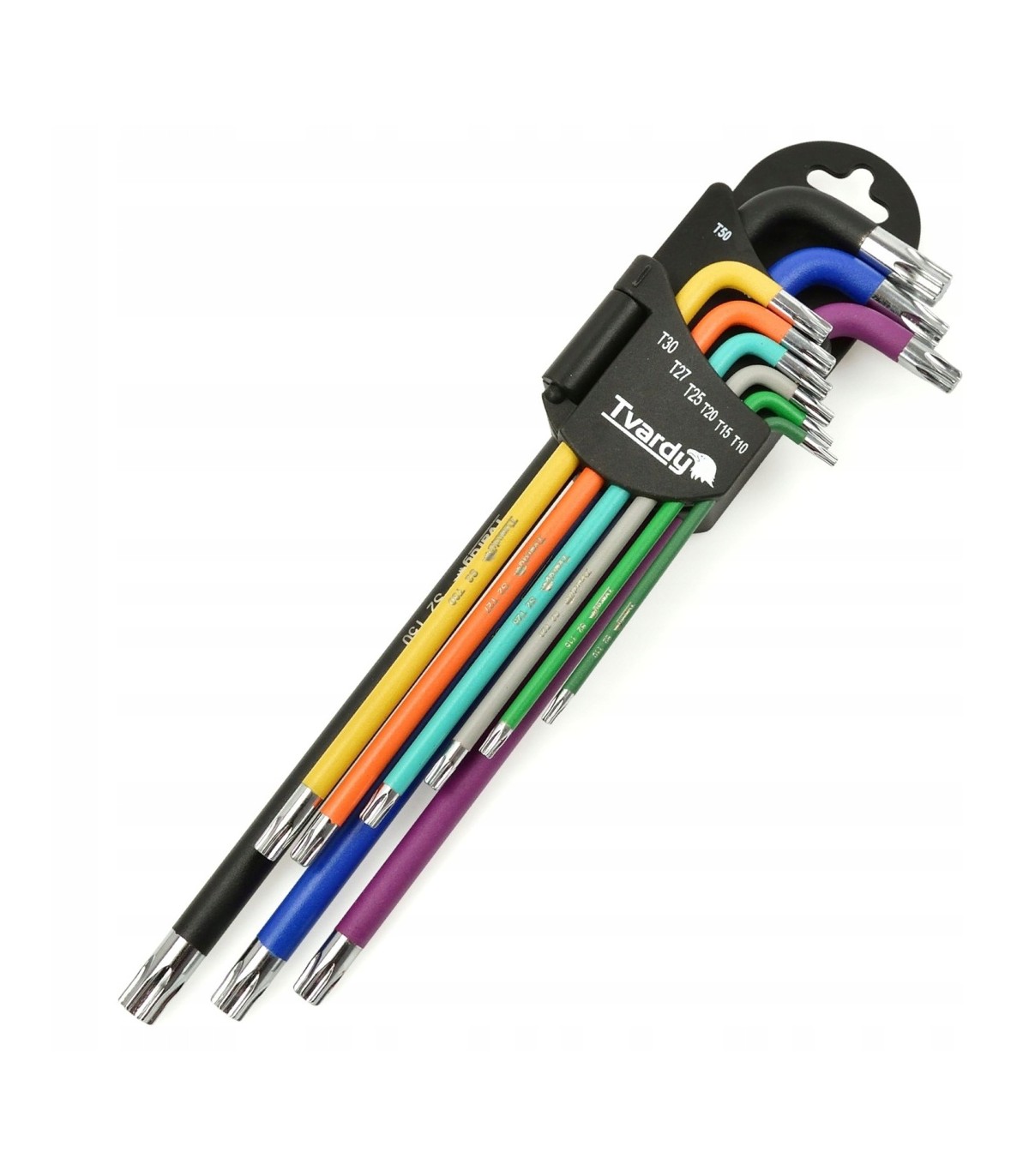 Zestaw długich kluczy torx profesjonalnej marki narzędziowej Tvardy. Wykonane z wysokogatunkowej stali S2 charakteryzującej się znacznie większą wytrzymałością niż powszechnie stosowana stal narzędziowa CrV. Długość kluczy umożliwia prace w trudno dostępnych miejscach. Różne kolory kluczy ułatwiają wybór właściwego rozmiaru klucza.