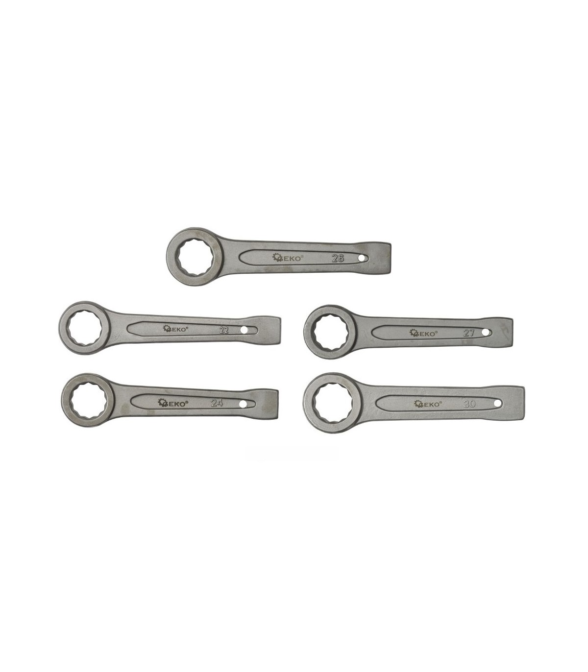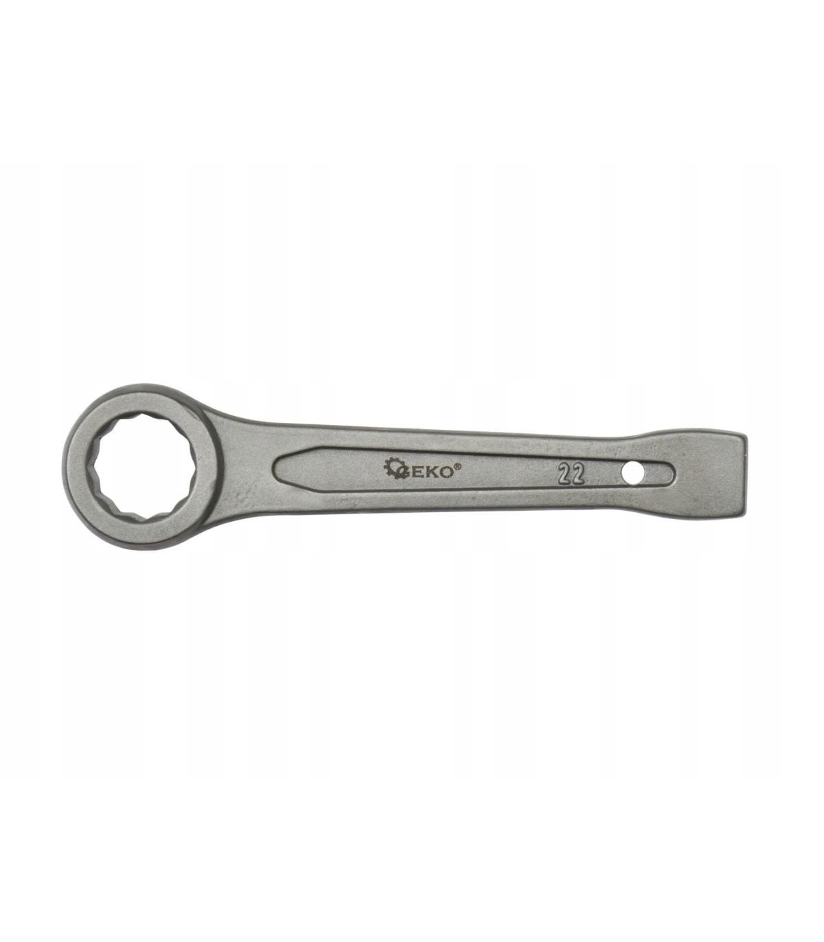 Wysokiej jakości klucz oczkowy do pobijania renomowanej marki GEKO. Przeznaczony do odkręcania mocno dokręconych, bądź zapieczonych śrub poprzez uderzania młotkiem w koniec rękojeści klucza.