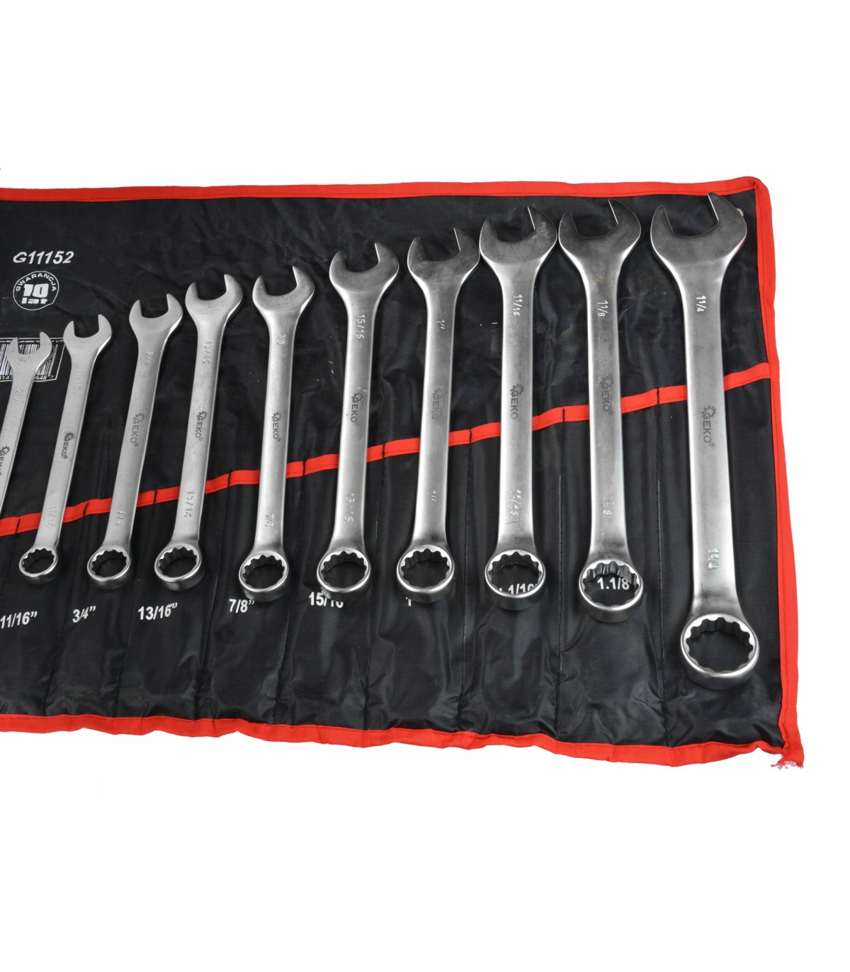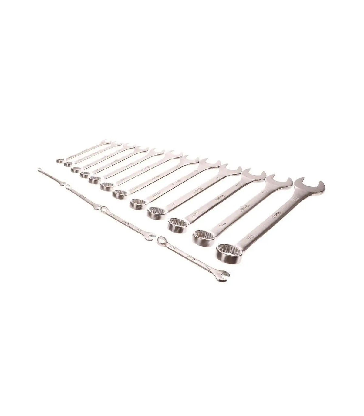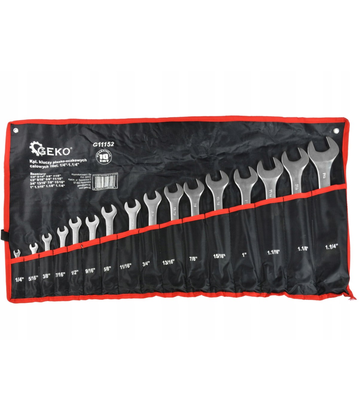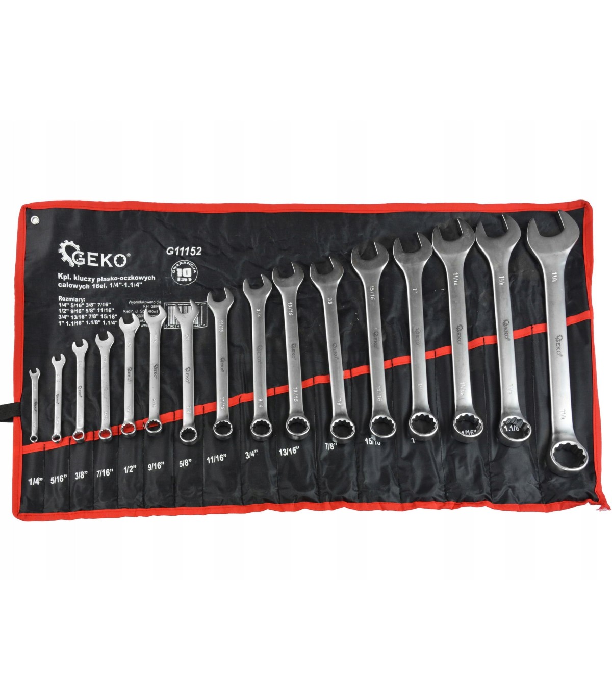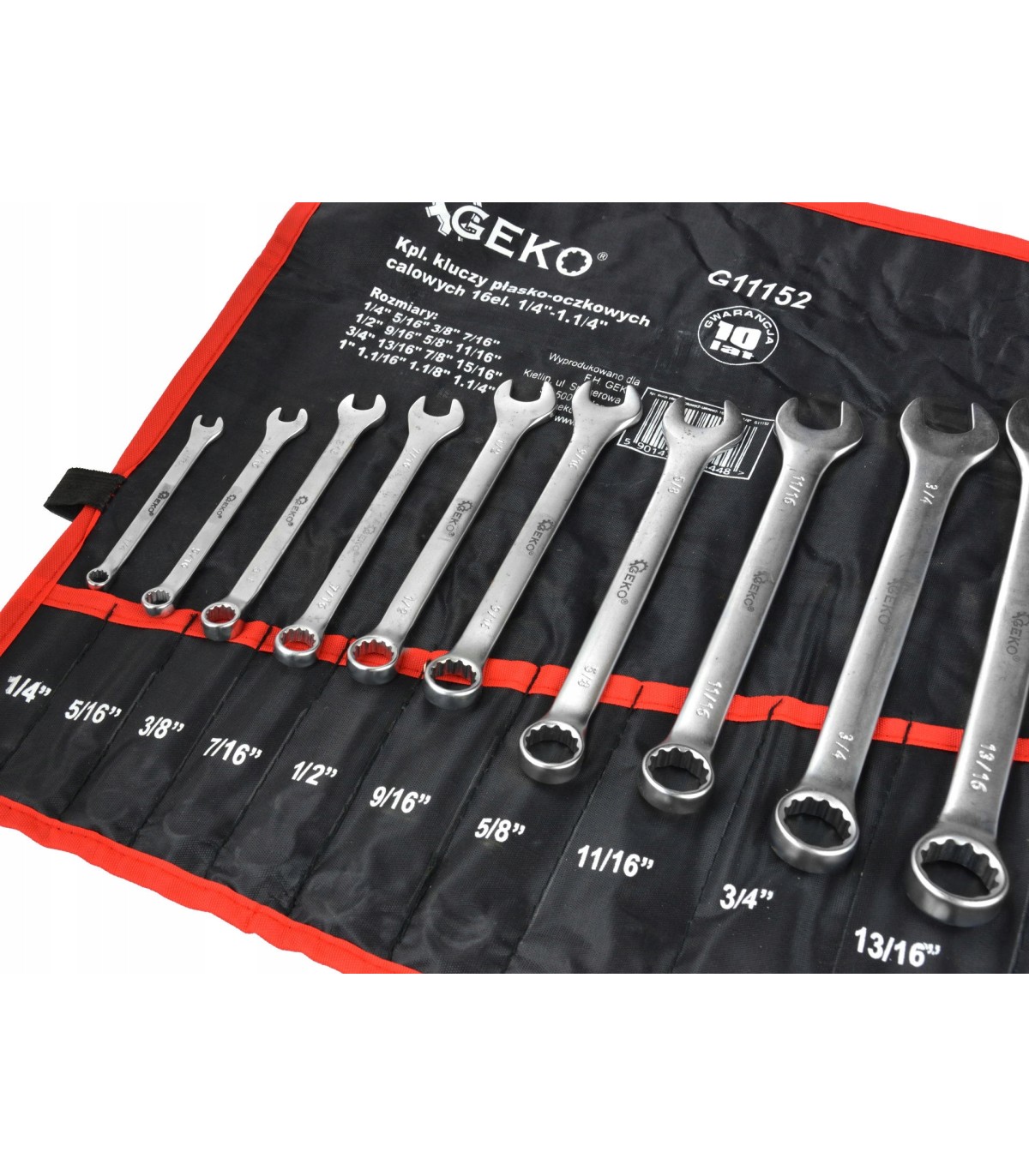 16 elementowy zestaw kluczy płasko-oczkowych calowych 1/4" - 1 1/4" CrV. Komplet wykonano ze stali stopowej chromowo-wanadowej. Bardzo mocne i wytrzymałe klucze. Wykonane zgodnie z normami ISO i DIN.