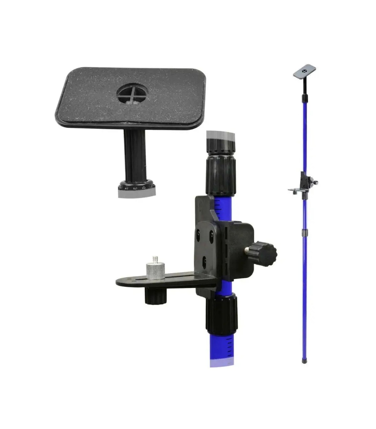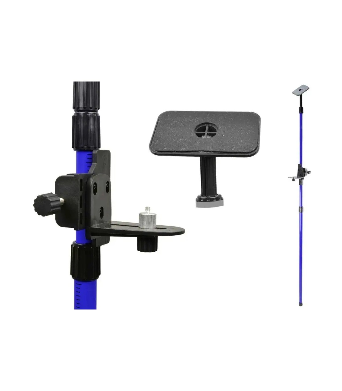 Zaciski mimośrodowe pozwalają na szybkie dopasowanie wysokości tyczki. Dodatkowo ostatni segment wyposażony jest w sprężynę, która po ustawieniu tyczki blokuje ją. Ruchomy uchwyt do montażu lasera posiada gwint mocujący 1/4".