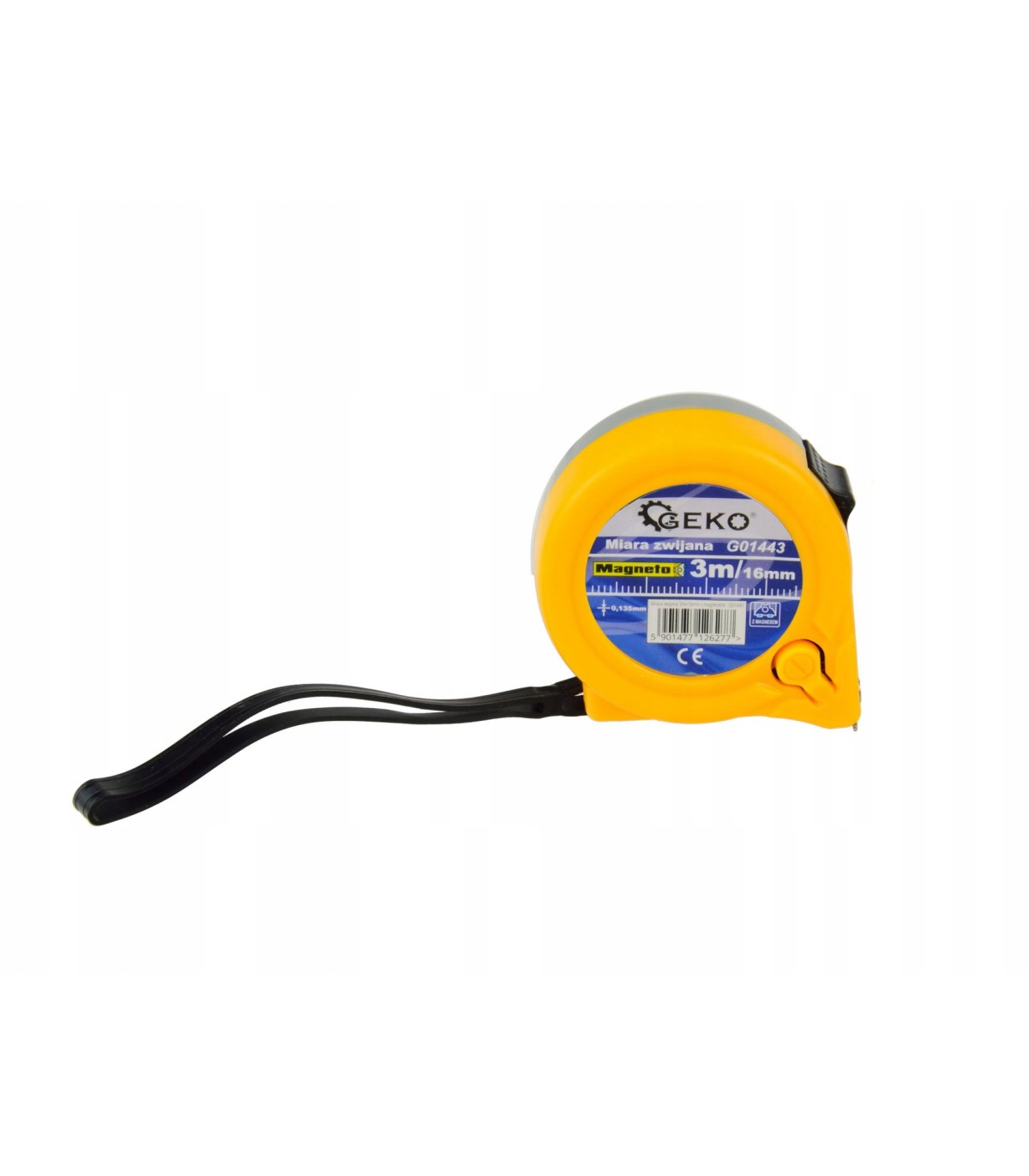 Taśmę ze stali węglowej zakończono solidnym zaczepem mierniczym z magnesem - umożliwia pomiar konstrukcji stalowych bez pomocy drugiej osoby. Obudowa miarki zrobiona z tworzywa sztucznego. Przycisk blokady obsługiwany kciukiem.