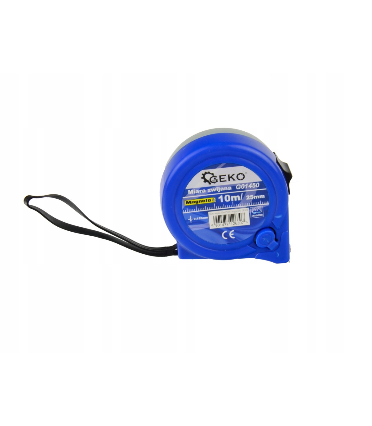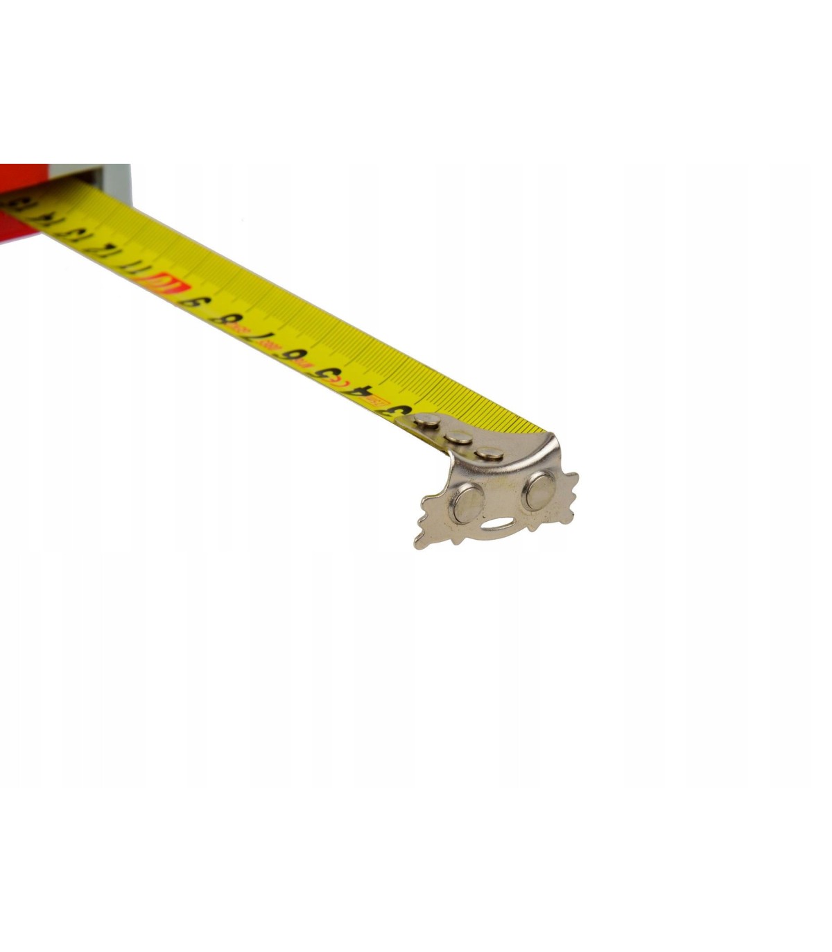 Taśmę ze stali węglowej zakończono solidnym zaczepem mierniczym z magnesem - umożliwia pomiar konstrukcji stalowych bez pomocy drugiej osoby. Obudowa miarki zrobiona z tworzywa sztucznego. Przycisk blokady obsługiwany kciukiem.