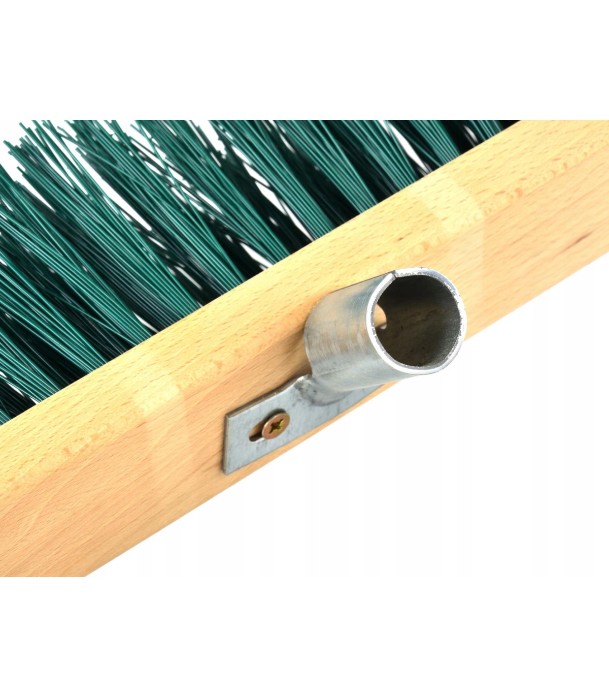 Miotła "ulicówka" o szerokości 60 cm, idealna do zamiatania dużych powierzchni na zewnątrz. Wyposażona w twarde, wytrzymałe nylonowe włosie, osadzone na solidnym, drewnianym korpusie. Miotła posiada metalowy uchwyt, który umożliwia montaż drewnianego kija bez gwintu, zapewniając stabilność i wygodę użytkowania.