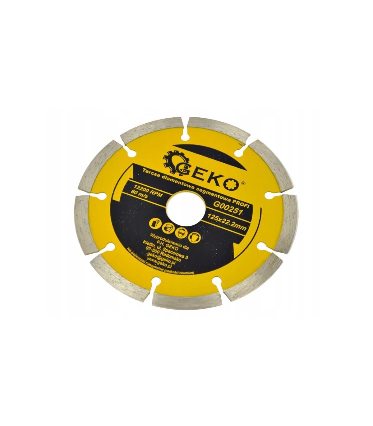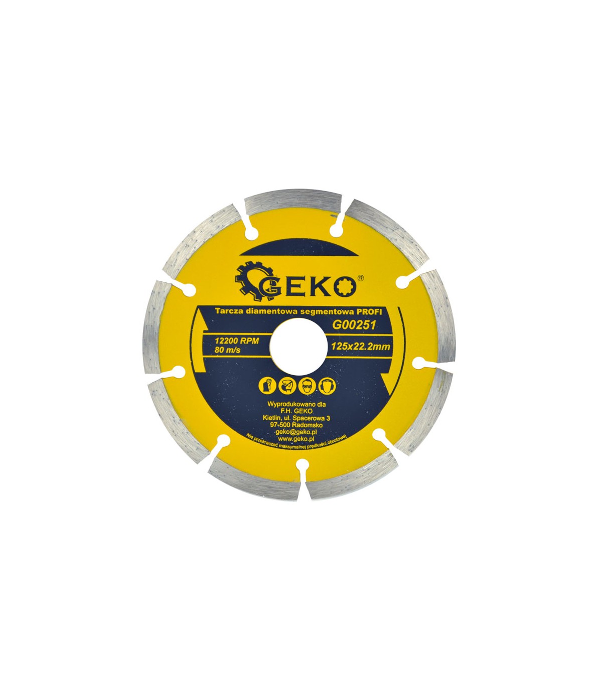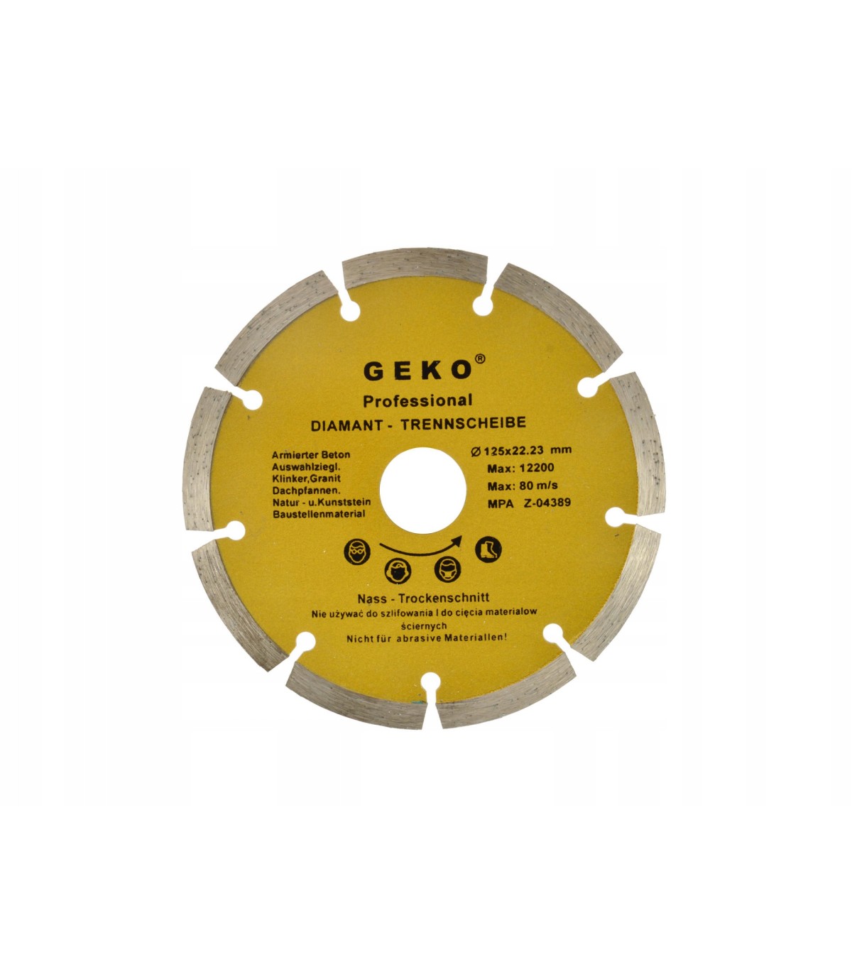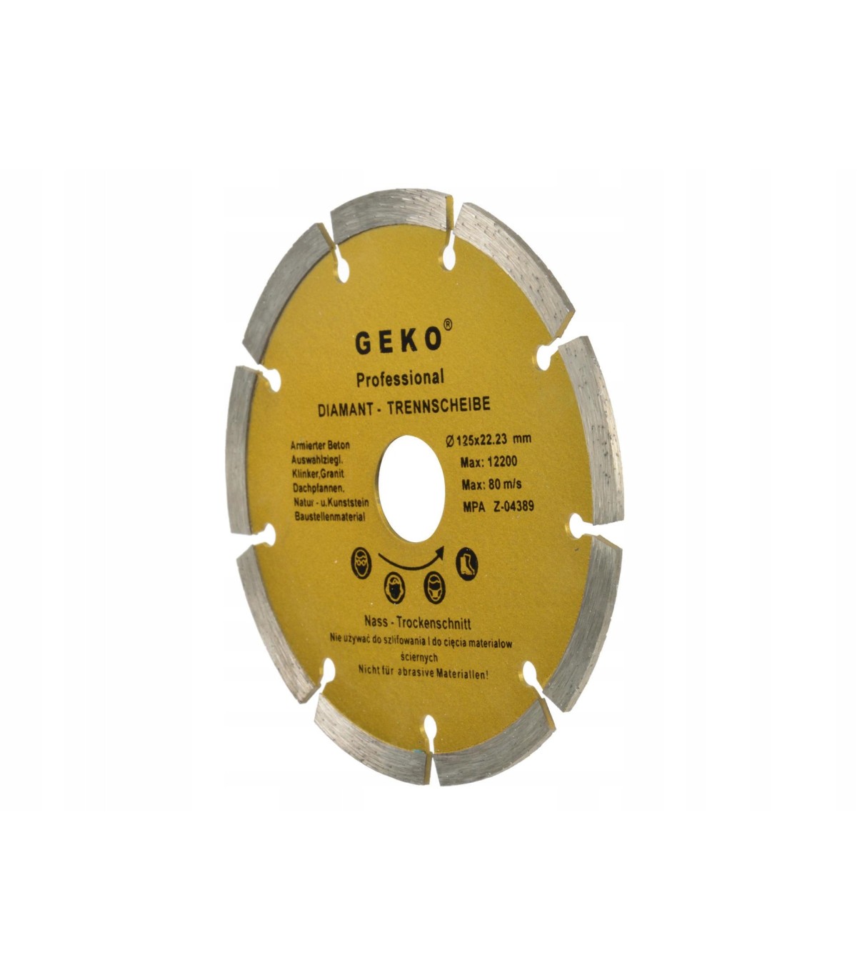 Diamentowa tarcza segmentowa ze szczelinami do cięcia materiałów budowlanych marki Geko, o wymiarach 125x22.2 mm.