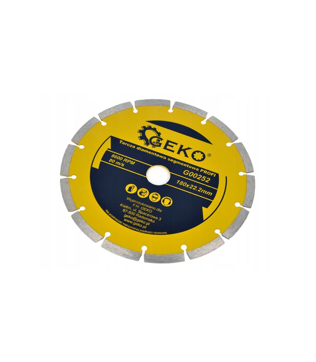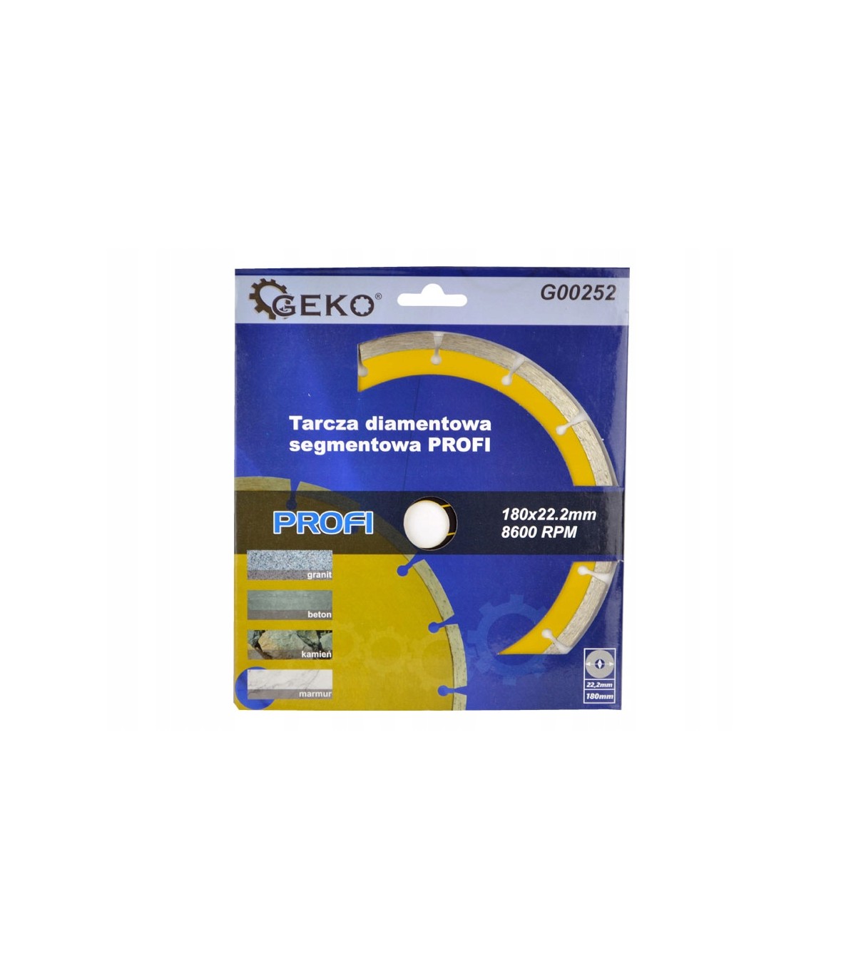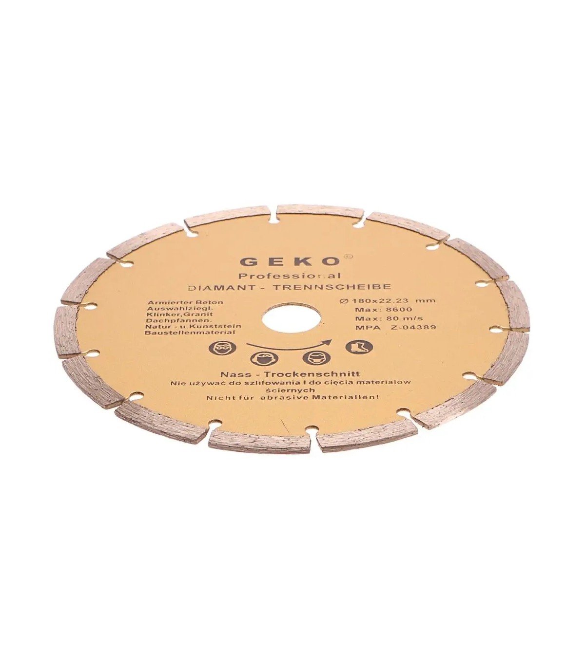 Diamentowa tarcza segmentowa ze szczelinami do cięcia materiałów budowlanych marki Geko, o wymiarach 180x22.2 mm.