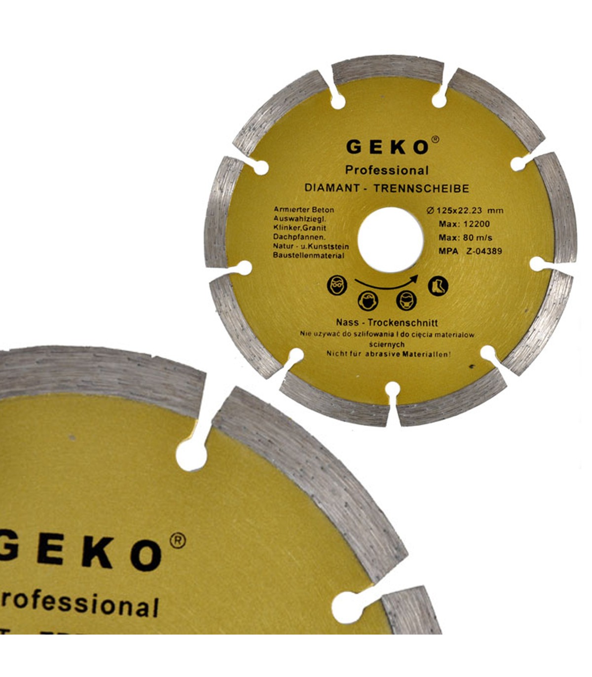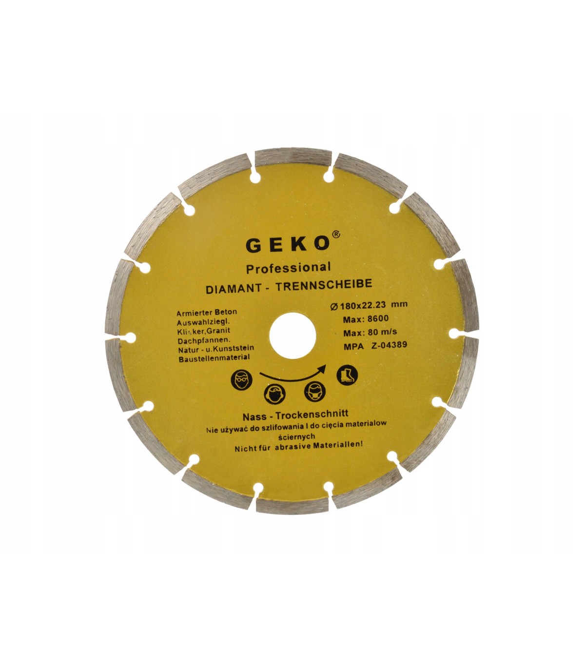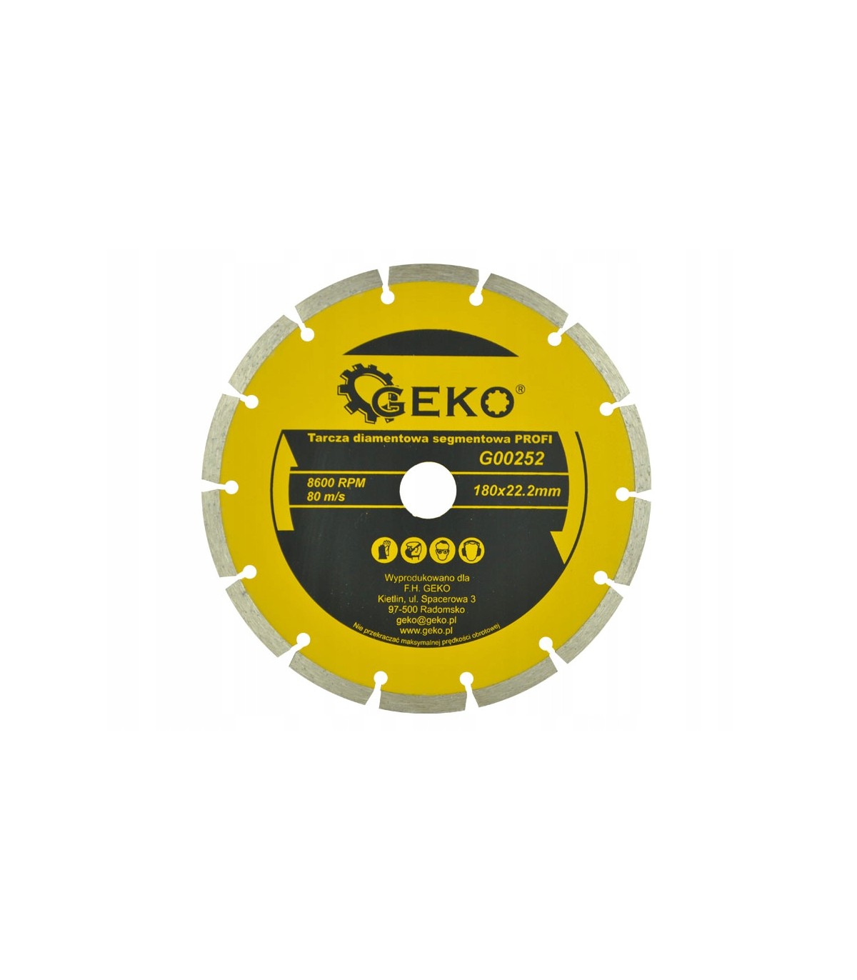 Diamentowa tarcza segmentowa ze szczelinami do cięcia materiałów budowlanych marki Geko, o wymiarach 180x22.2 mm.