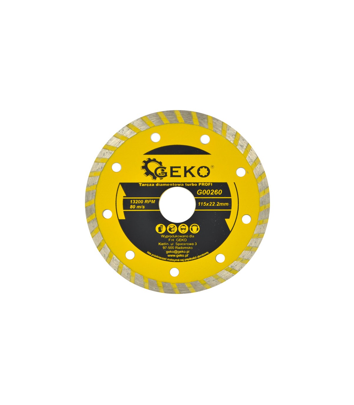 Diamentowa tarcza typu Turbo do cięcia materiałów budowlanych marki Geko, o wymiarach 115x22.2 mm.