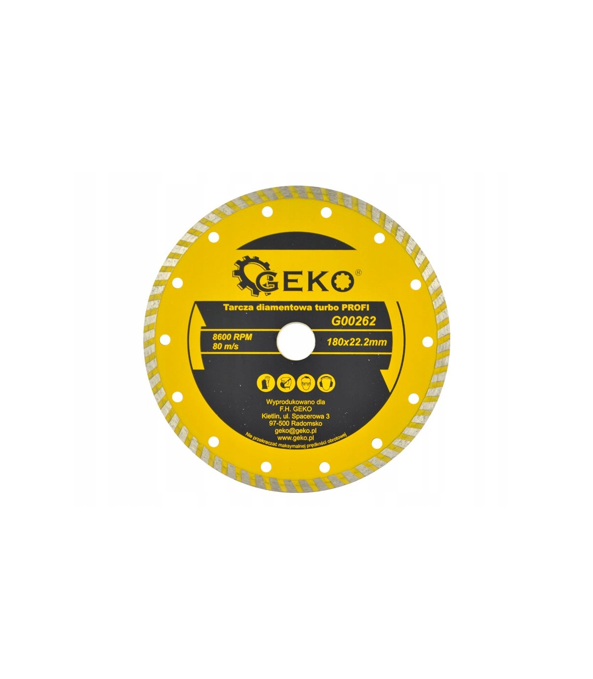 Diamentowa tarcza typu Turbo Profi do cięcia materiałów budowlanych marki Geko, o wymiarach 180x22.2 mm.