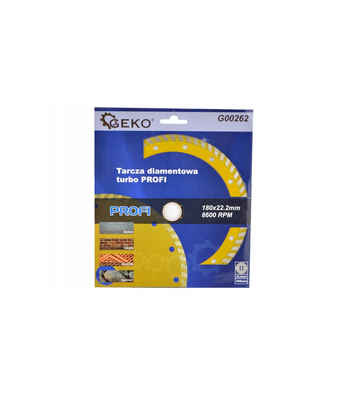 Tarcza diamentowa segmentowa bez szczelin tzw. "Turbo Profi" do cięcia materiałów budowlanych marki Geko, o wymiarach 180x22.2 mm .