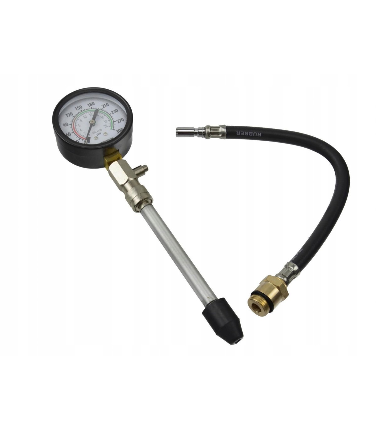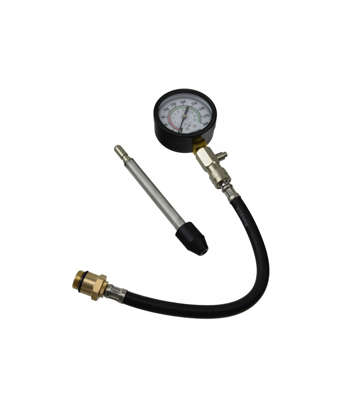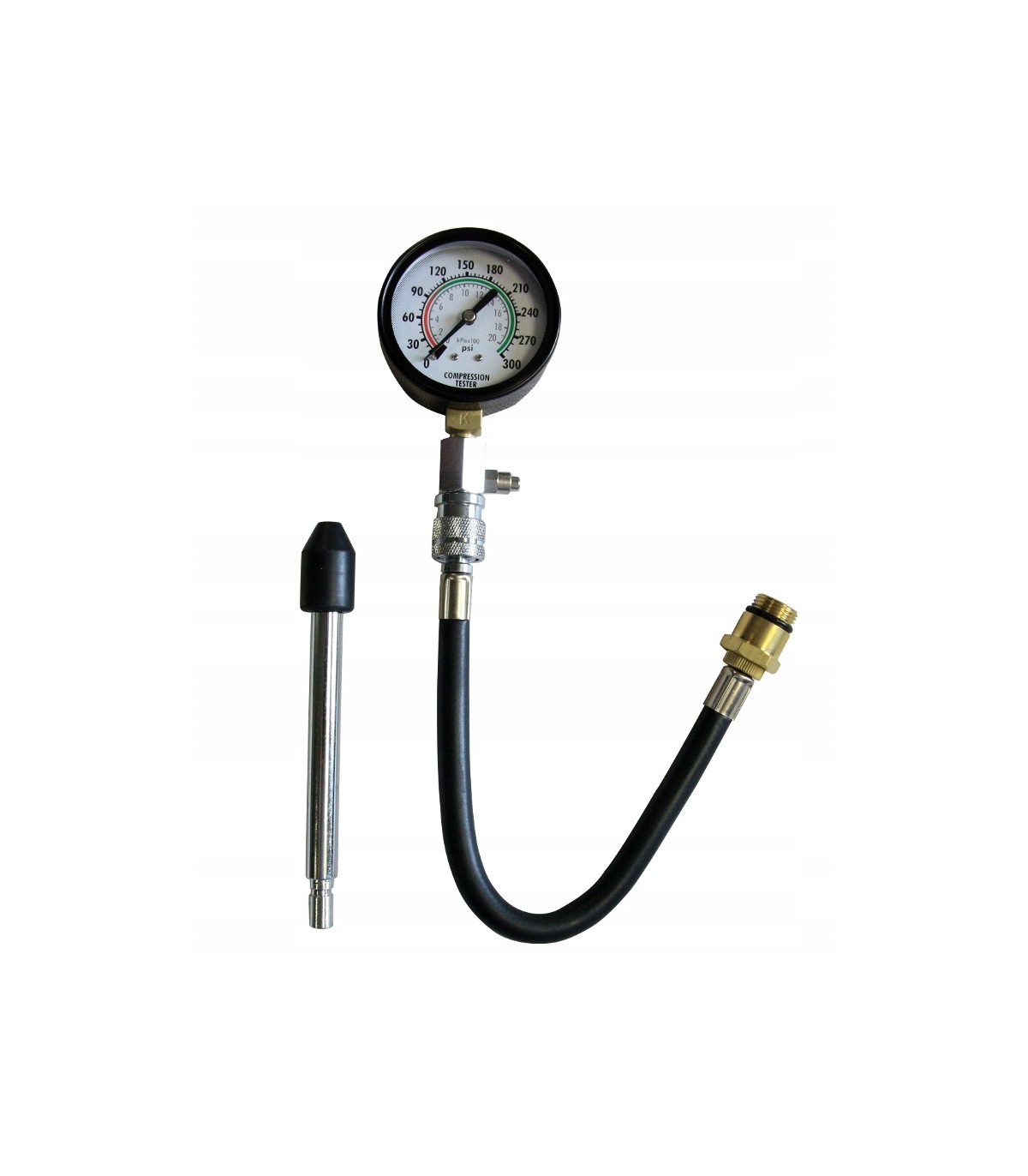 Zestaw pasuje do wszystkich gniazd świecowych. Końcówki pomiarowe można łatwo i wygodnie wymienić poprzez szybko-złączkę. Manometr analogowy pracuje w zakresie ciśnienia pomiaru 3 - 20 Bar (50-300 PSI).