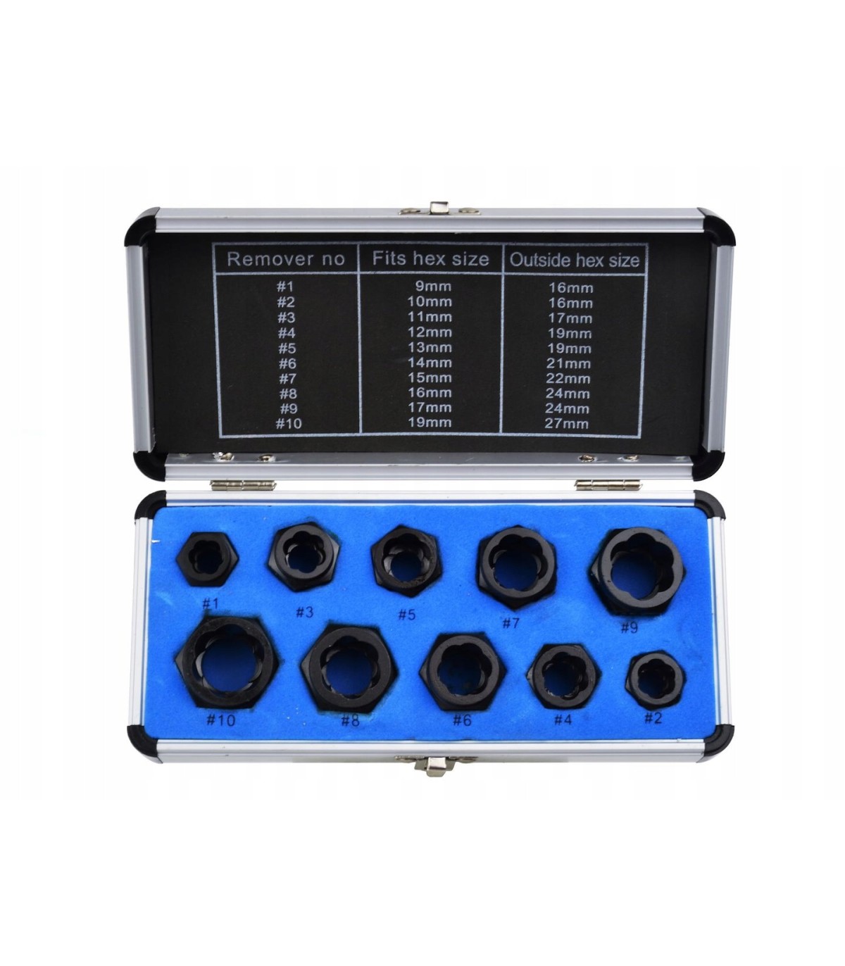 Zestaw do usuwania uszkodzonych nakrętek i śrub o rozmiarze 9 - 19 mm. Specjalny kształt nasadki ułatwiający zaklinowanie się jej na śrubie sprawia że odkręcenie uszkodzonej śruby nie będzie stanowiło problemu. Nasadki wykonano z bardzo wytrzymałej stali chromowo-molibdenowej (CR-MO), co daje im wysoką twardość oraz dużą odporność na uszkodzenia. Zestaw doskonale sprawdzi się w profesjonalnym warsztacie samochodowym, jak i w przydomowym garażu.