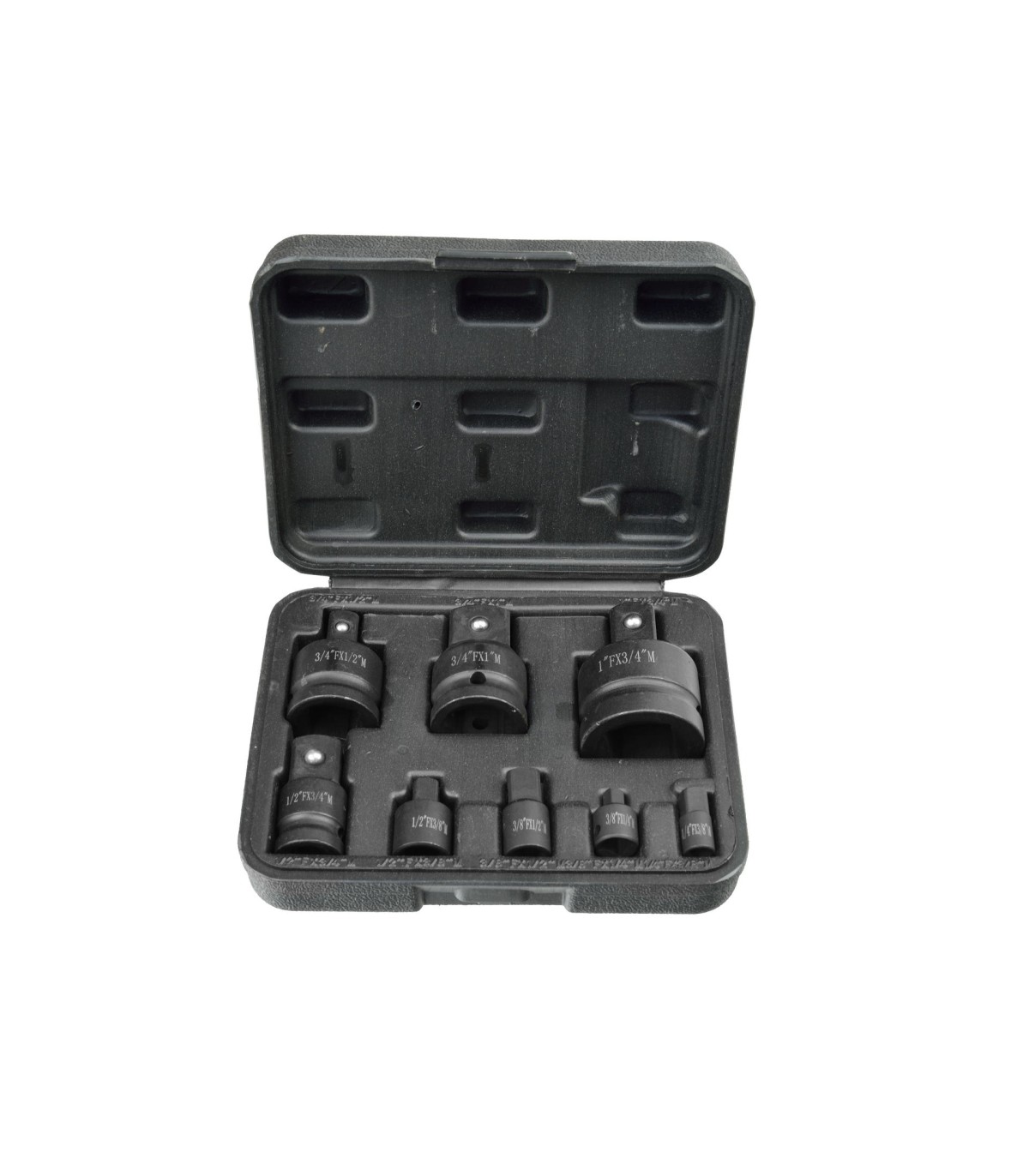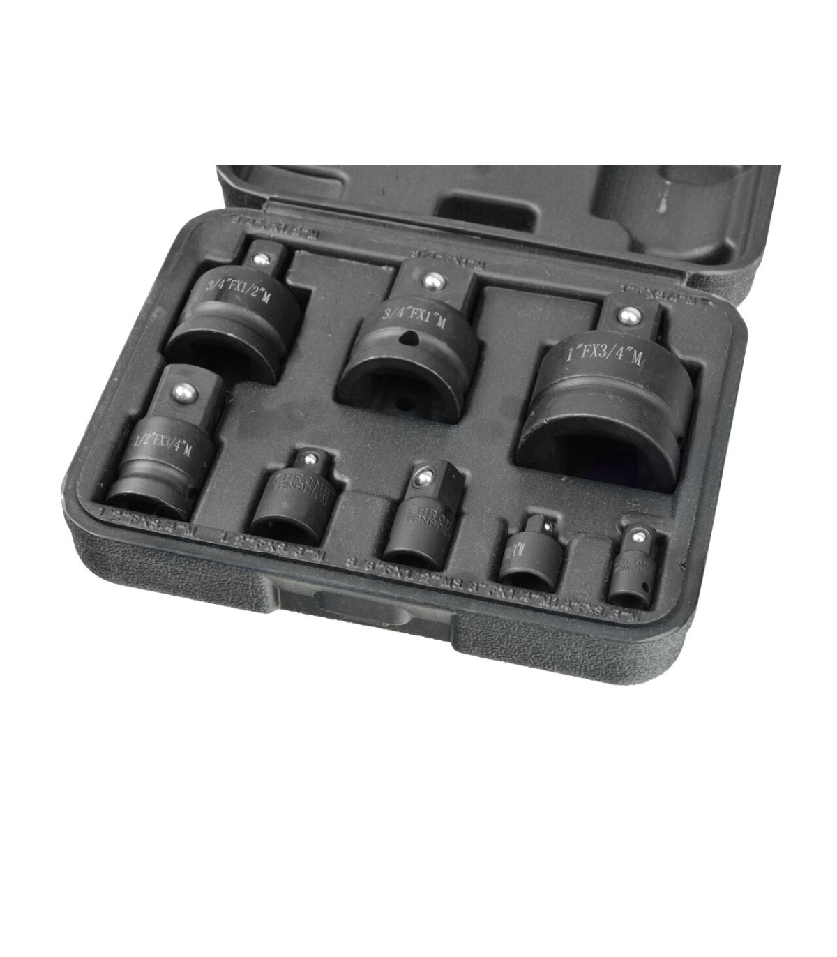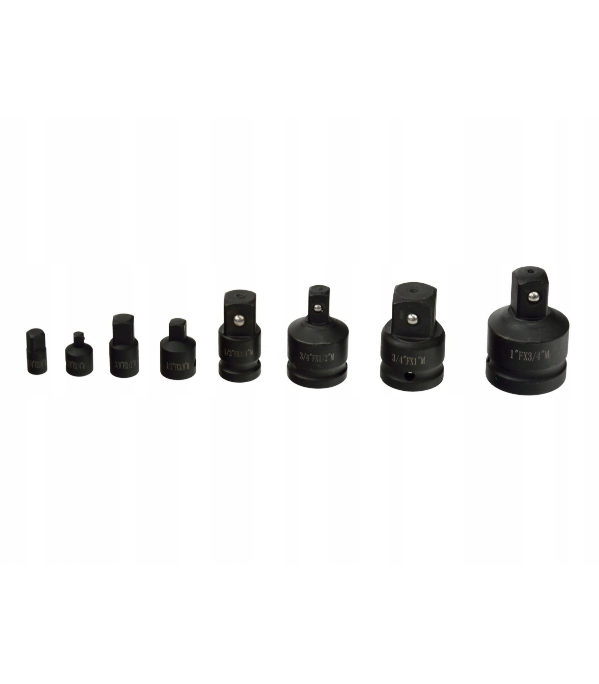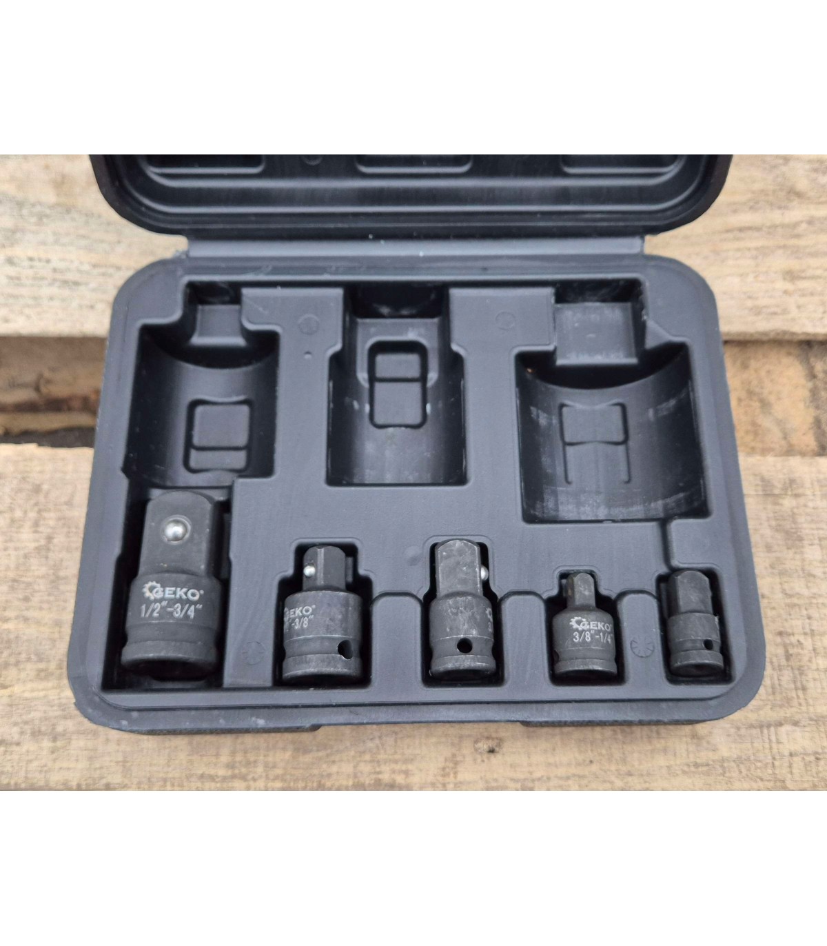 Zestaw 8 wytrzymałych redukcji udarowych umożliwia sprawne łączenie narzędzi o różnych napędach. Każda redukcja posiada specjalne miejsce na kołek oraz pierścień zabezpieczający, co gwarantuje pewne osadzenie w gnieździe i chroni przed przypadkowym wysunięciem się podczas pracy pod dużym obciążeniem.