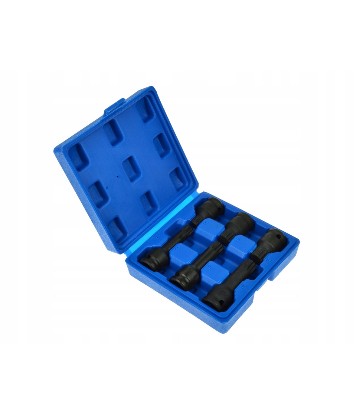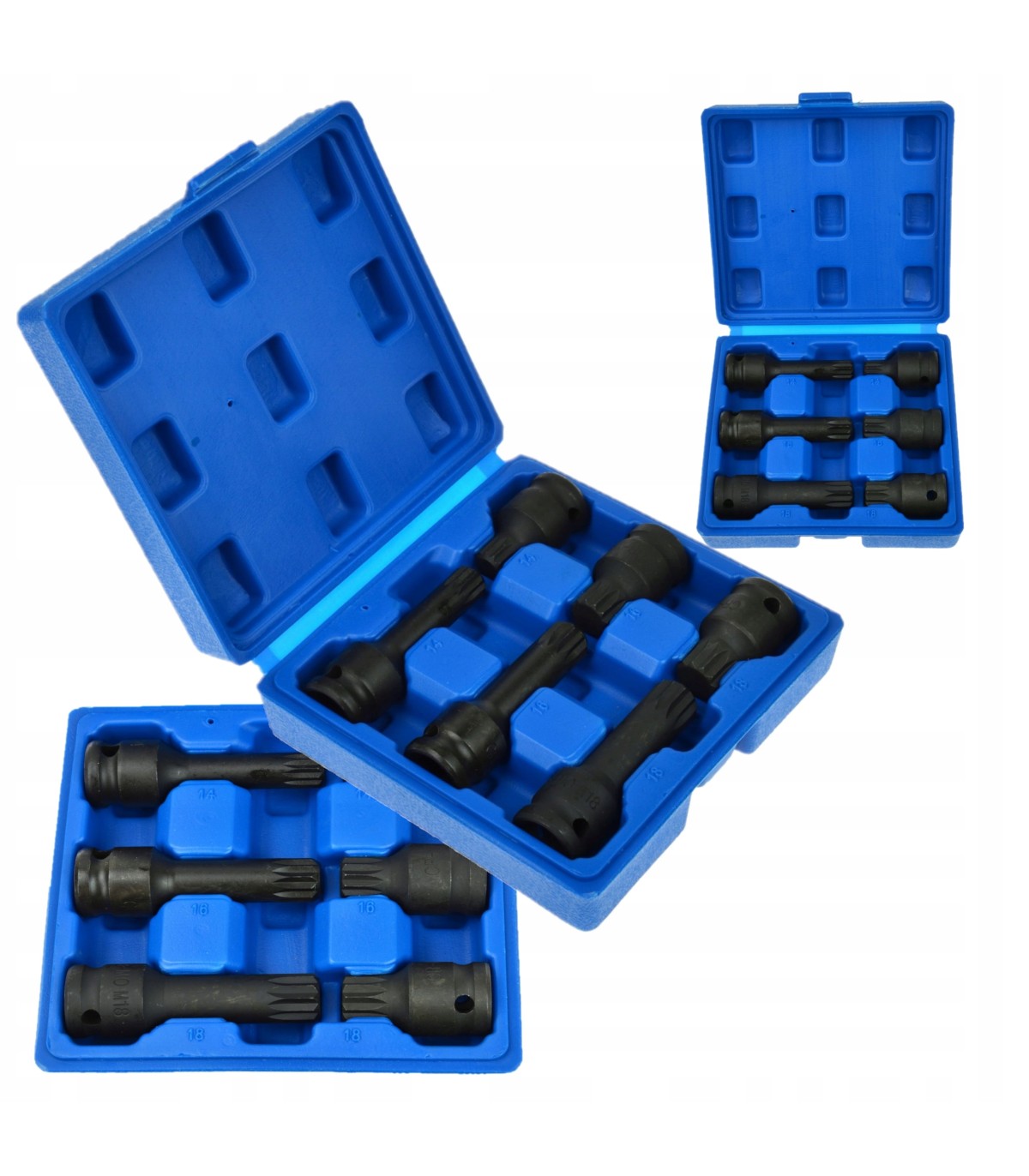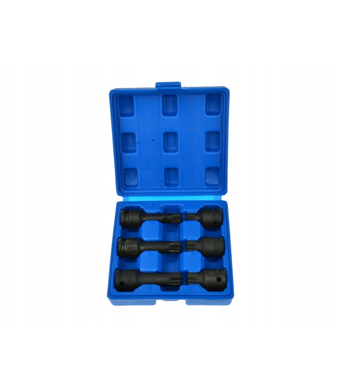 Zestaw kluczy udarowych spline stosowany w samochodach z grupy VAG, m.in VW LT, Transporter, Golf i Sharan oraz tylne zaciski hamulcowe Porsche Cayenne Prezentowany przez nas zestaw bitów udarowych jest uniwersalnym kompletem niezbędnym w każdym warsztacie. Stal chromowo-molibdenowa. Zestaw cechuje profesjonalna jakość oraz atrakcyjna cena. Wysokość kluczy 45 i 78 mm. Wszystkie elementy zestawu wykonano z Chromo-Molibdenu. Każdy klucz posiada wejście pod klucz pneumatyczny, pokrętło lub grzechotkę 1/2'' .