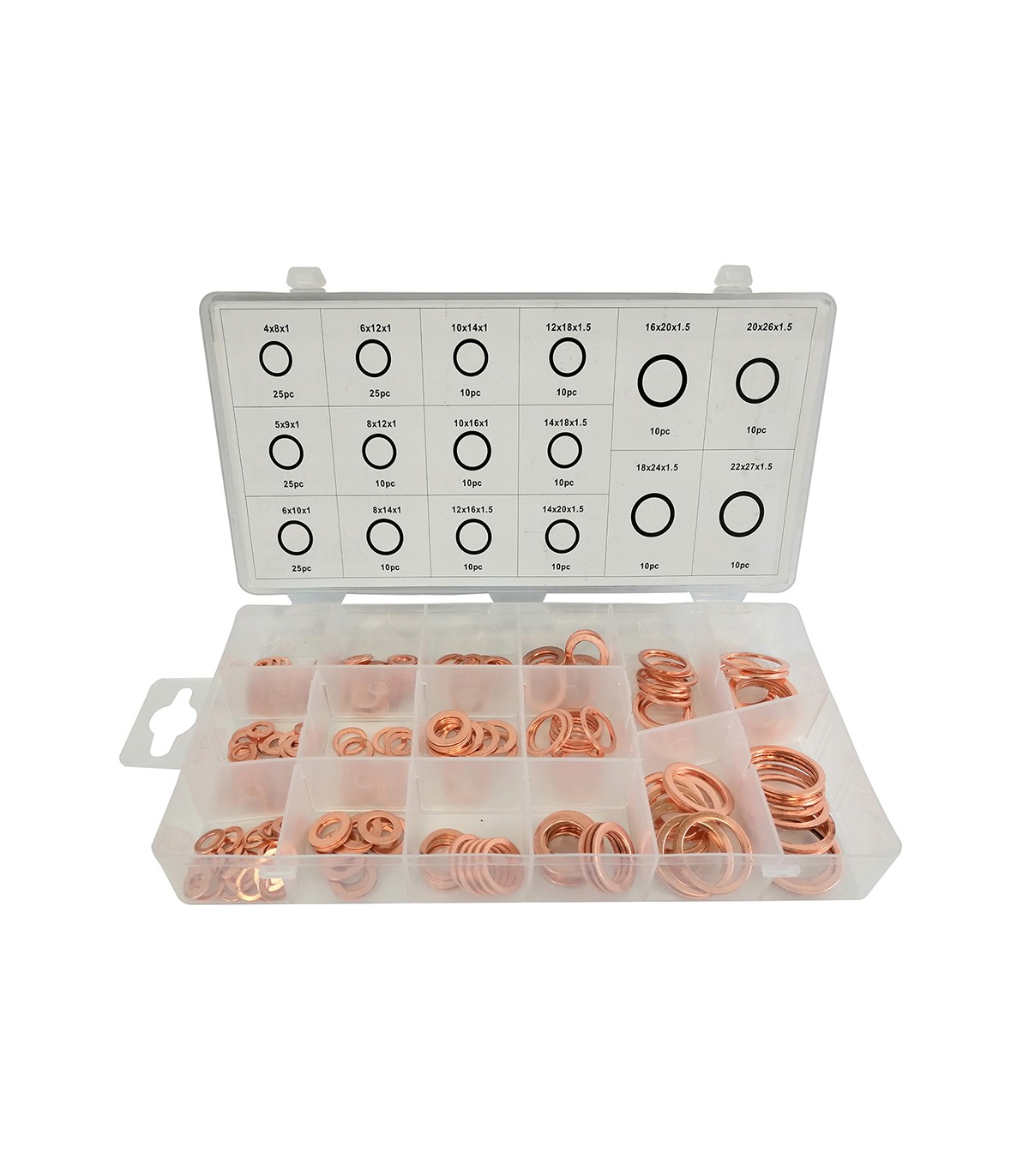 Zestaw 220 wysokiej jakości podkładek miedzianych, idealny do różnorodnych zastosowań w warsztacie, serwisie samochodowym i domu. Dzięki ich precyzyjnemu wykonaniu i właściwościom miedzi, zapewniają trwałe uszczelnienia oraz odporność na wysokie temperatury i korozję. Podkładki są posortowane i umieszczone w praktycznym sortowniku, co ułatwia przechowywanie i szybki dostęp do potrzebnego rozmiaru.