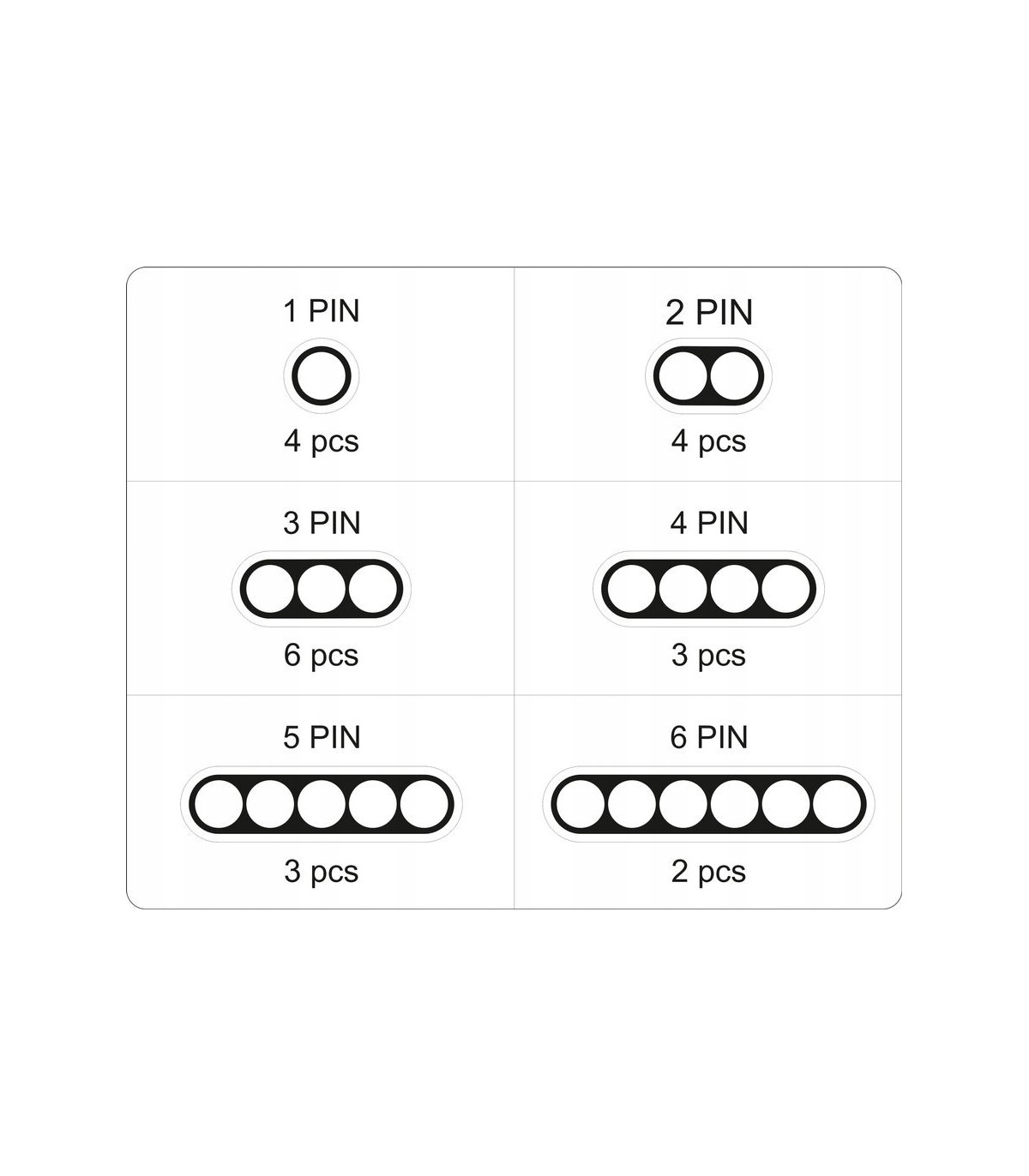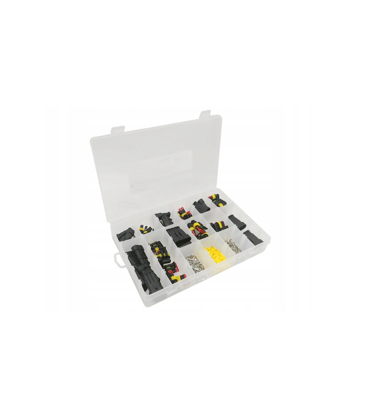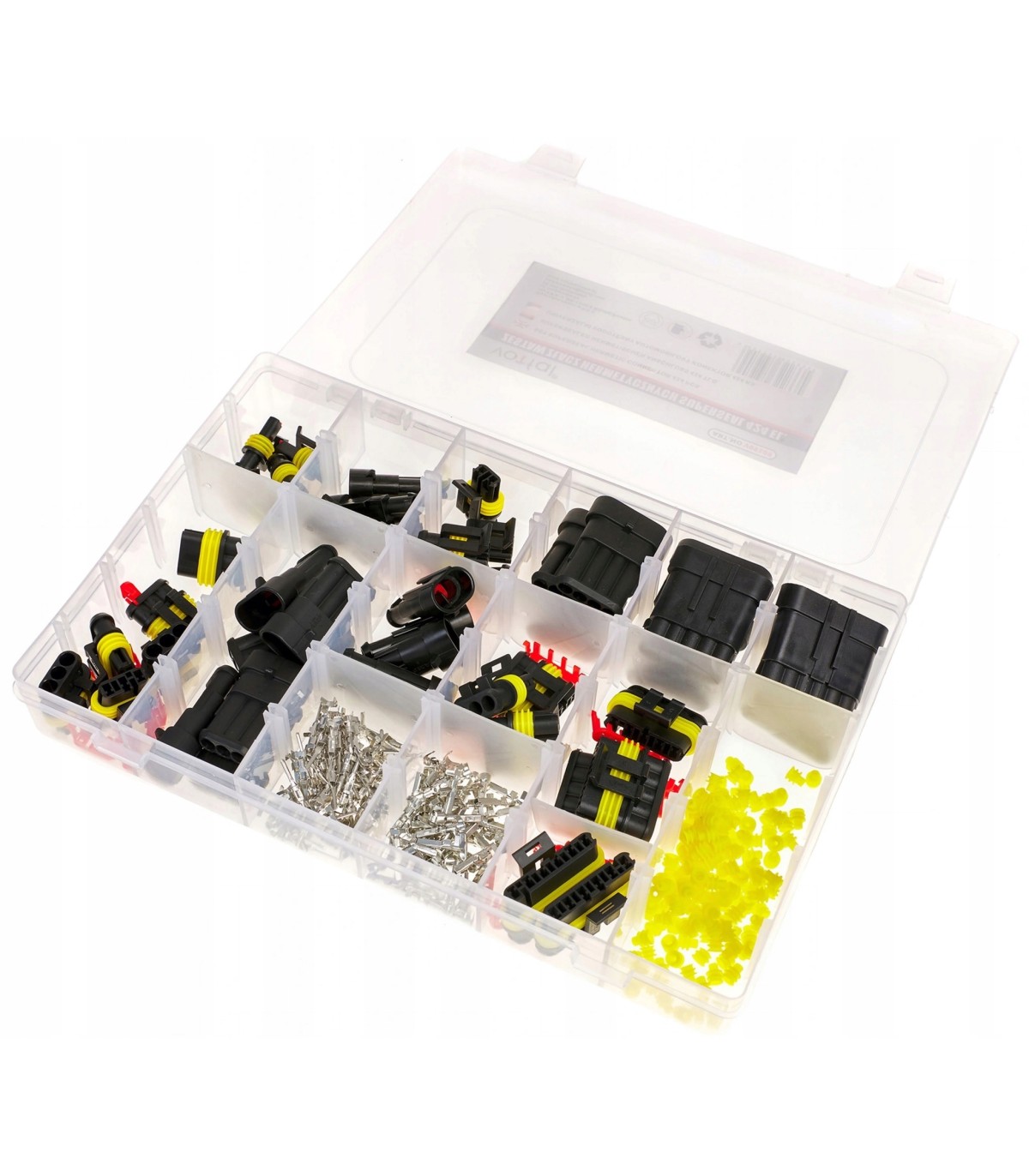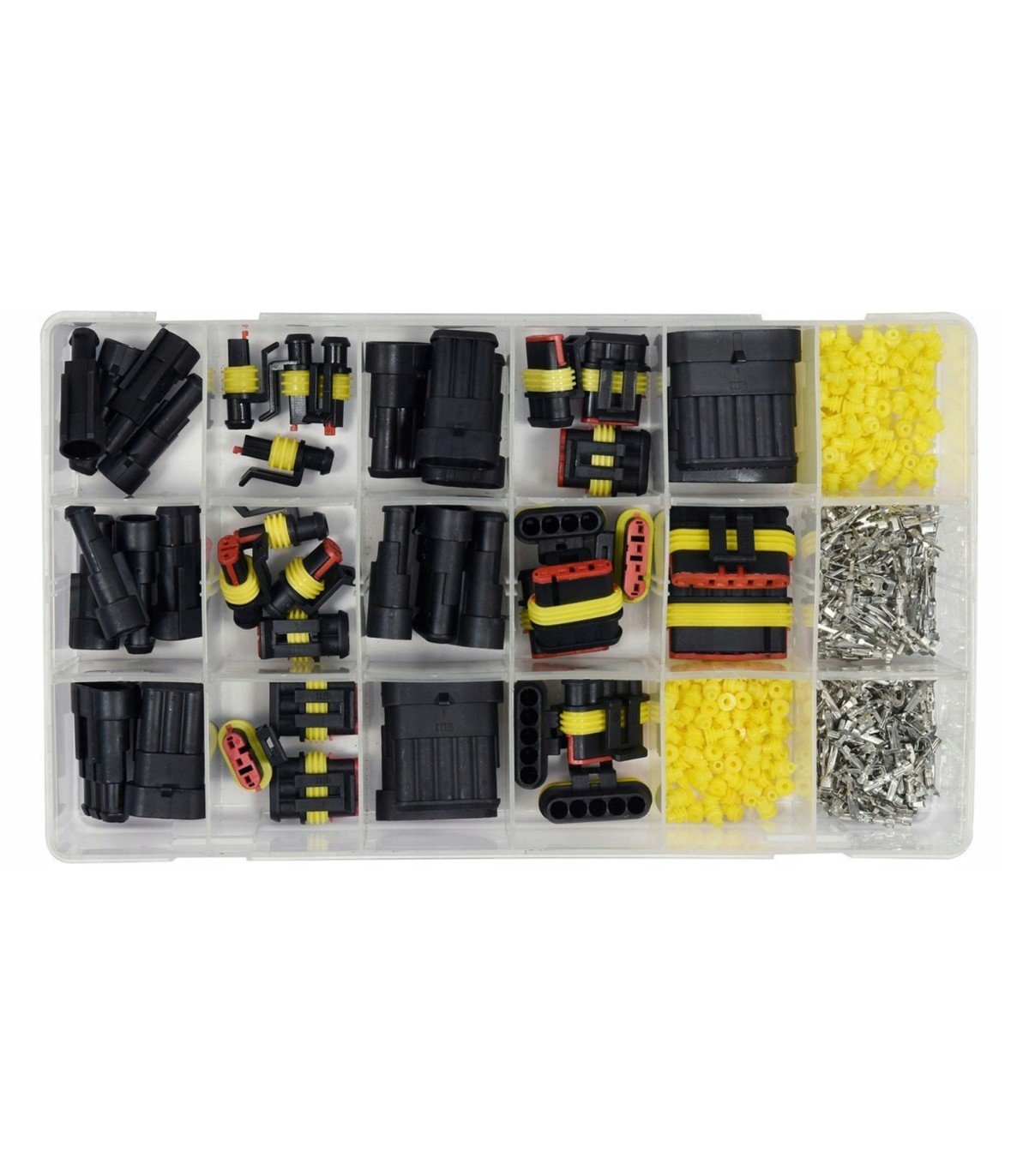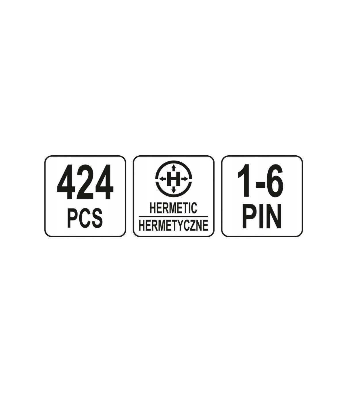 Zestaw 424 złączek hermetycznych w 6 rozmiarach pasujących do najbardziej popularnych średnic przewodów elektrycznych. Stosowane w branży motoryzacyjnej, m.in. do czujników i urządzeń w samochodach. Zapewniają bardzo dobrą izolację i szczelność. Dostępne rozmiary: 1-6-pinowe złącza typu „superserseal” wyposażone z gumowe uszczelnienia gwarantują odporność na płyny hamulcowe, oleje i paliwa opakowanie z przegródkami