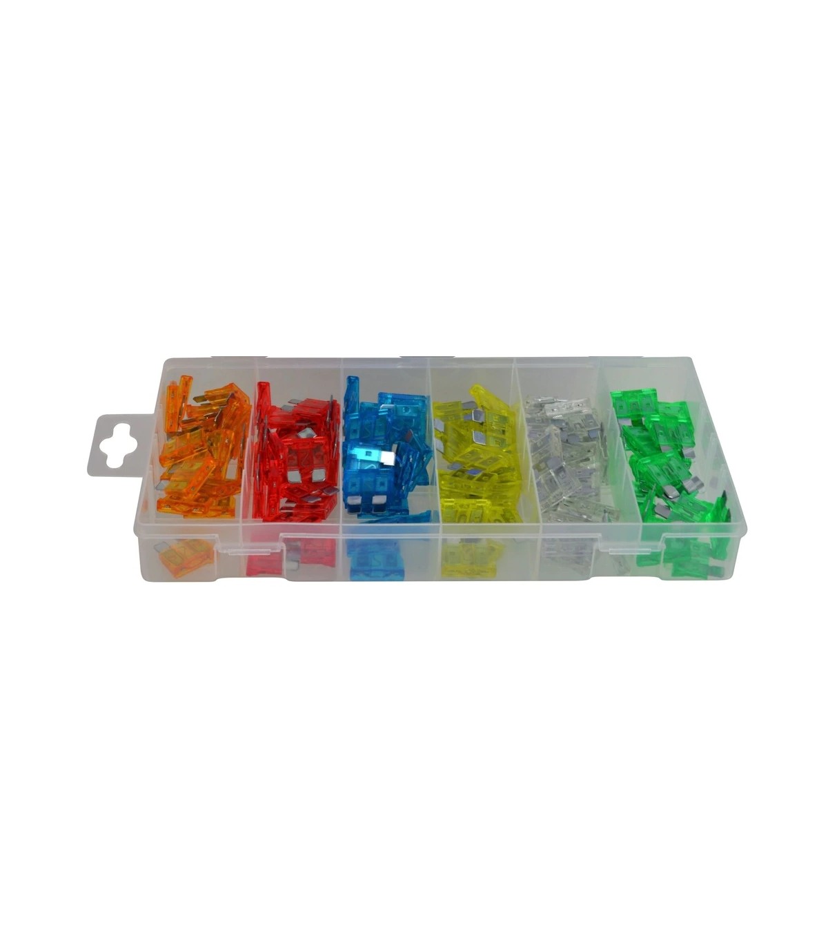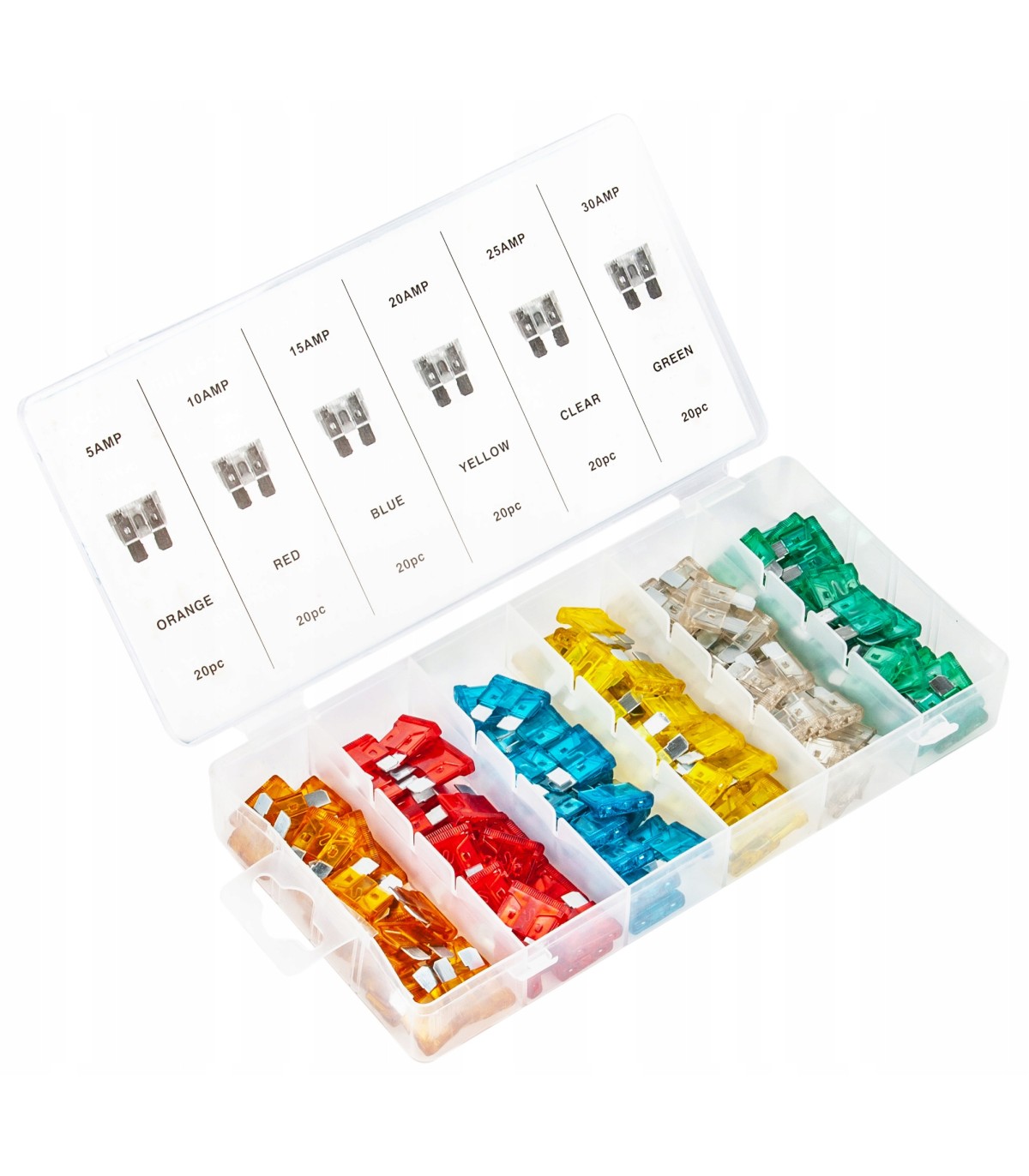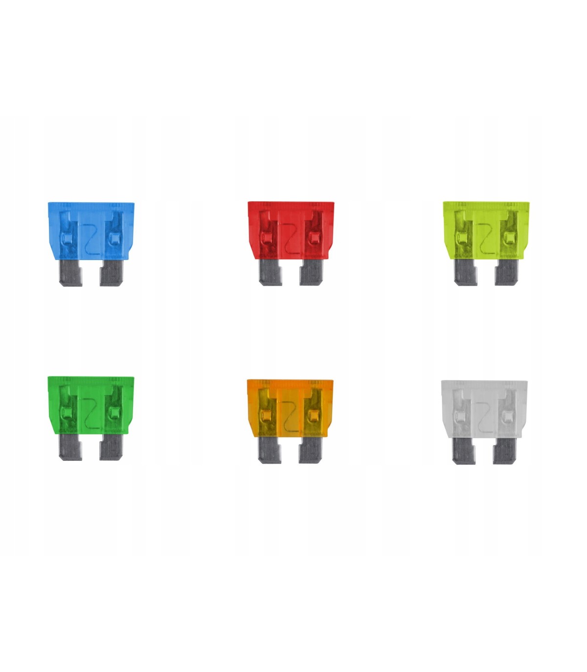 Zestaw 120 bezpieczników samochodowych płytkowych mini o natężeniu prądu od 5A do 30A. Charakterystyka produktu 6 rodzaji bezpieczników o natężeniu prądu od 5 do 30A pojemnik z tworzywa sztucznego z praktyczymi przegródkami Zawartość zestawu 20 bezpieczników MINI 5 A - pomarańczowe 20 bezpieczników MINI 10 A - czerwone 20 bezpieczników MINI 15 A - niebieskie 20 bezpieczników MINI 20 A - żółte 20 bezpieczników MINI 25 A - przezroczyste 20 bezpieczników MINI 30 A - zielone