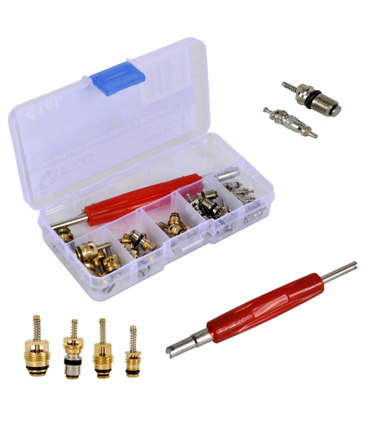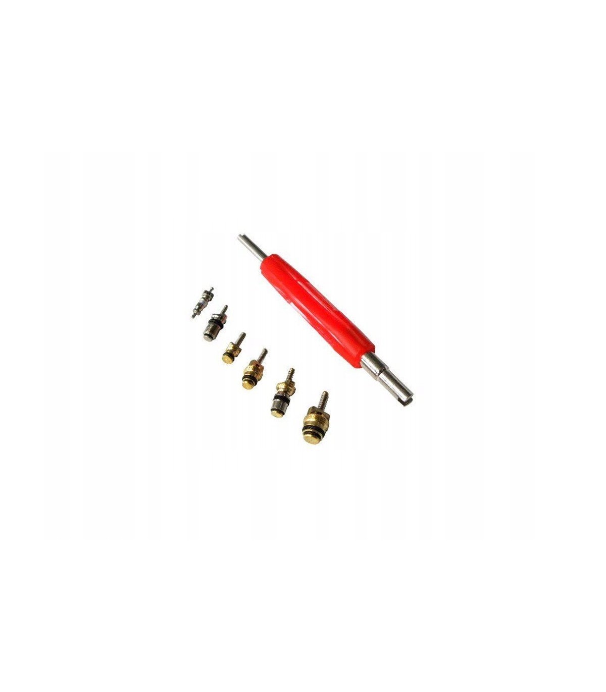 W skład zestawu wchodzi klucz do wykręcania / wkręcania zaworków oraz 6 różnych typów zaworków.