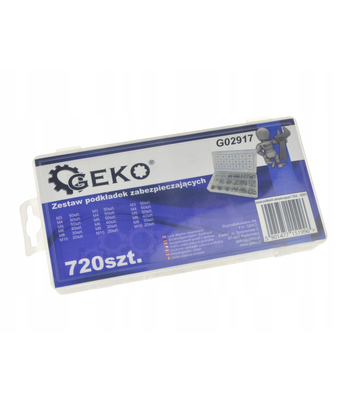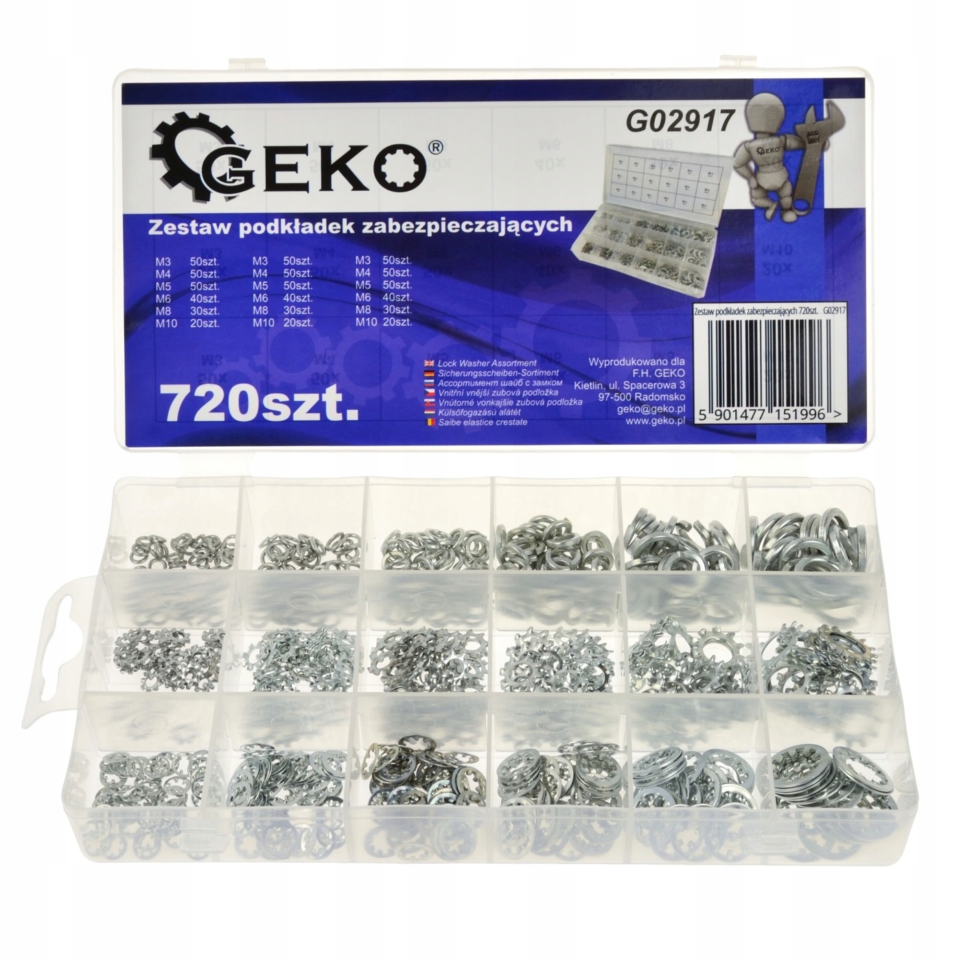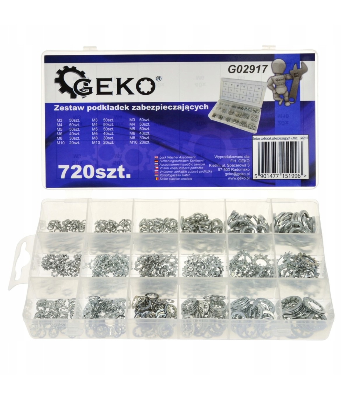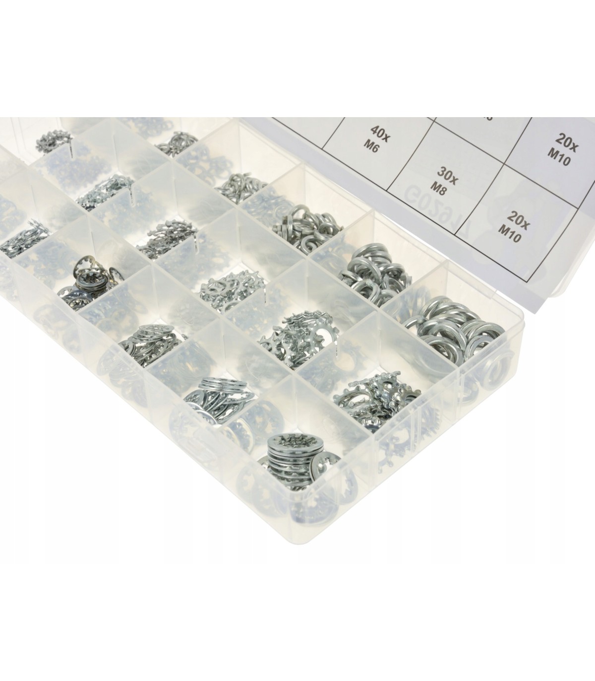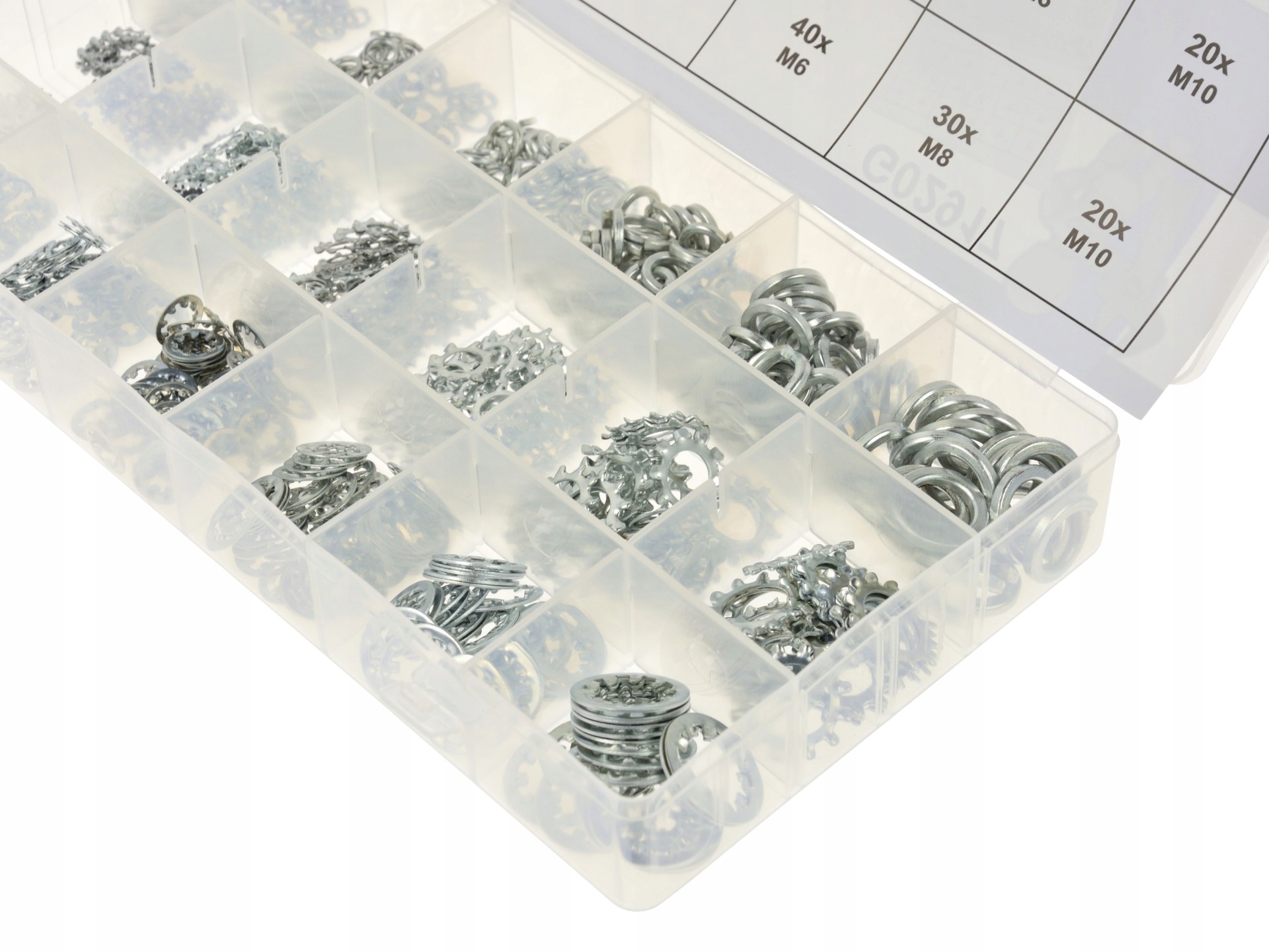 Zestaw zawiera 3 rodzaje podkładek w wygodnym przezroczystym organizerze. Podkładki wykonane są ze stali ocynkowanej.