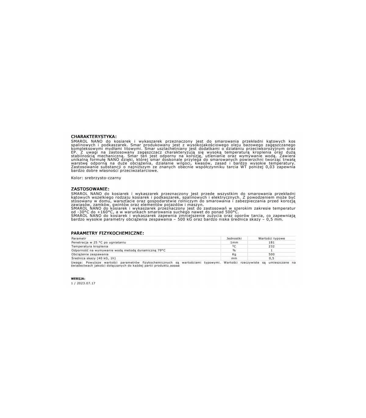 SMAROL NANO do kosiarek i wykaszarek przeznaczony jest przede wszystkim do smarowania przekładni kątowych wszelkiego rodzaju kosiarek i podkaszarek, spalinowych i elektrycznych. Z powodzeniem może być stosowany w domu, warsztacie oraz gospodarstwie rolniczym do smarowania i zabezpieczania przed korozją zawiasów, zamków, gwintów oraz elementów pojazdów i maszyn. Przeznaczony jest do zastosowań w szerokim zakresie temperatur od -30°C do +160°C, a w warunkach smarowania suchego nawet do ponad 500°C. Zapewnia zmniejszenie zużycia oraz oporów tarcia, co zapewniają bardzo wysokie parametry obciążenia zespawania – 500 kG oraz bardzo niska średnica skazy – 0,5 mm.