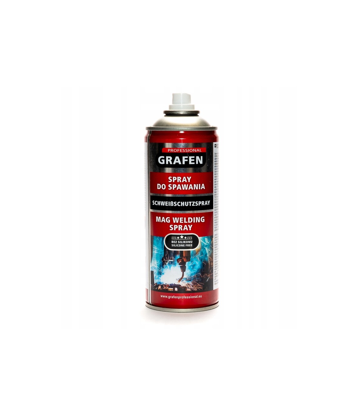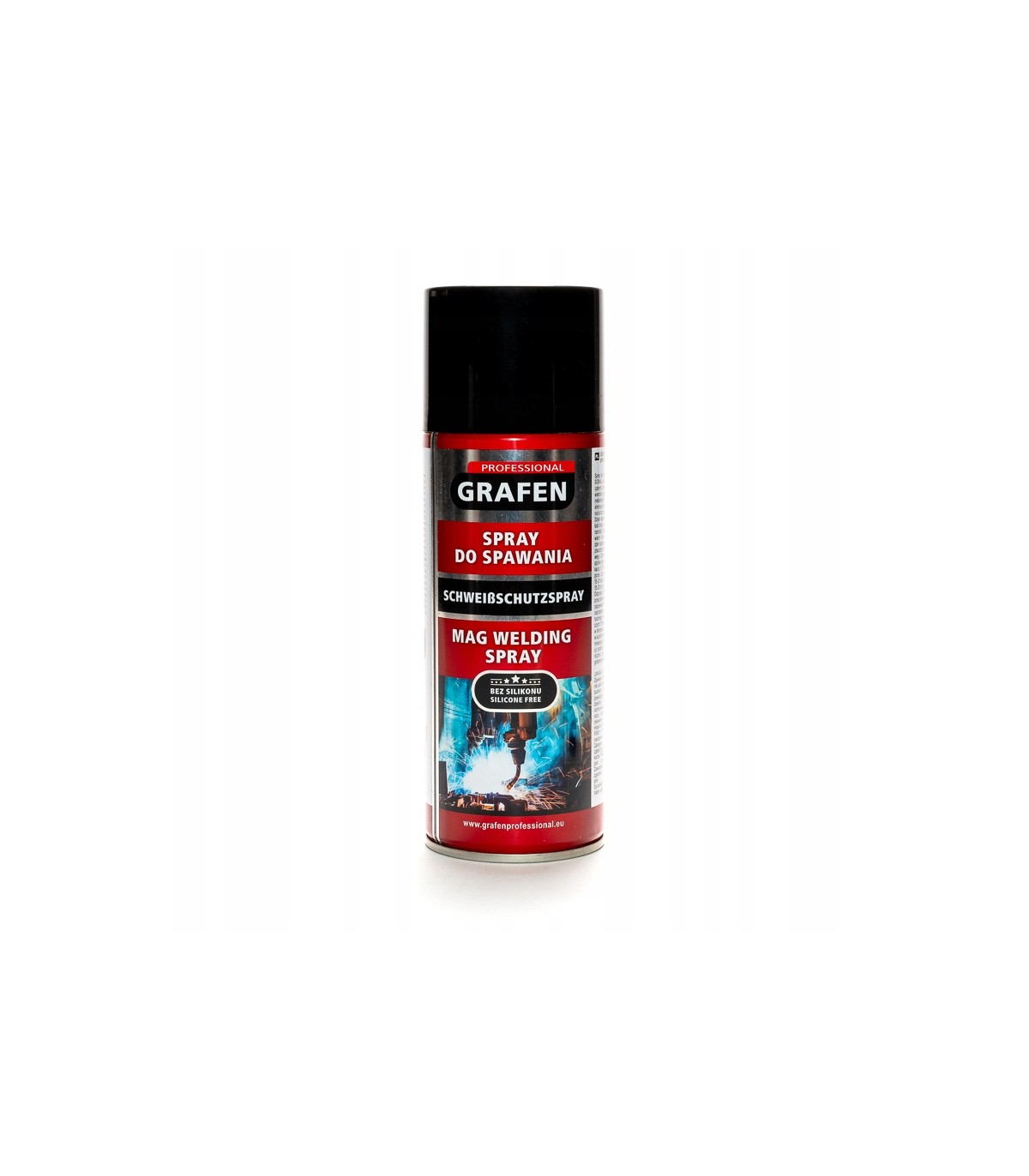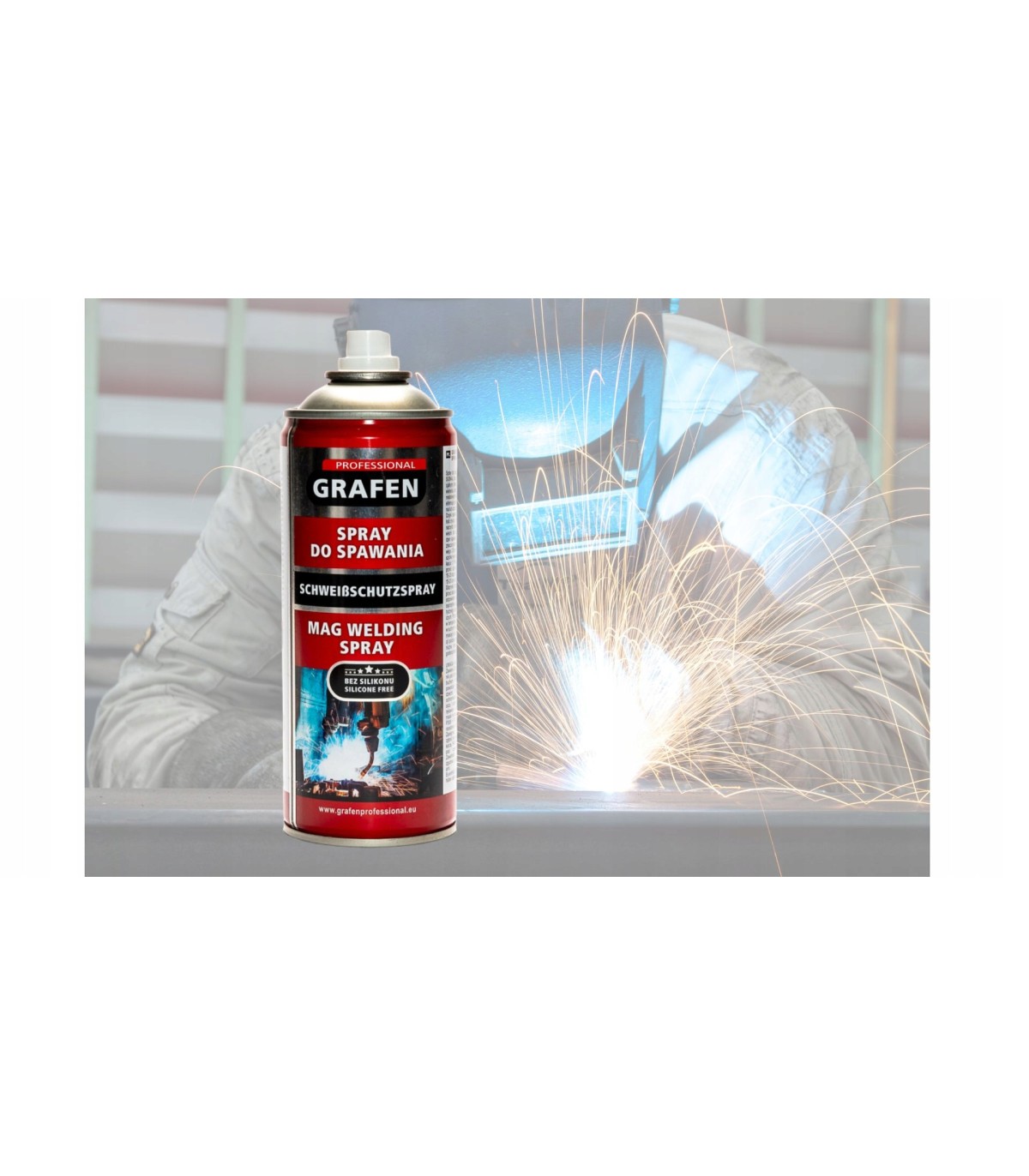 Spray do spawania Grafen Professional bez silikonu jest sprayem specjalnym, łatwo usuwa i zapobiega przywieraniu odprysków na powierzchniach metalowych w trakcie procesu spawania i eliminuje potrzebę dłutowania, szlifowania lub szczotkowania drutu po spawaniu. Dzięki specjalnej formule wydłuża trwałość dyszy, urządzeń spawalniczych oraz narzędzi, łatwo się aplikuje i jest odpowiedni do zabezpieczania dysz, urządzeń spawalniczych oraz narzędzi przeznaczonych do procesów spawania łukowego. Chroni przed utlenianiem, bardzo szybko wysycha oraz jest niepalny. Produkt odpowiedni do dysz i osłon, palników, osprzętów, automatycznego i półautomatycznego spawania, robotów spawalniczych.