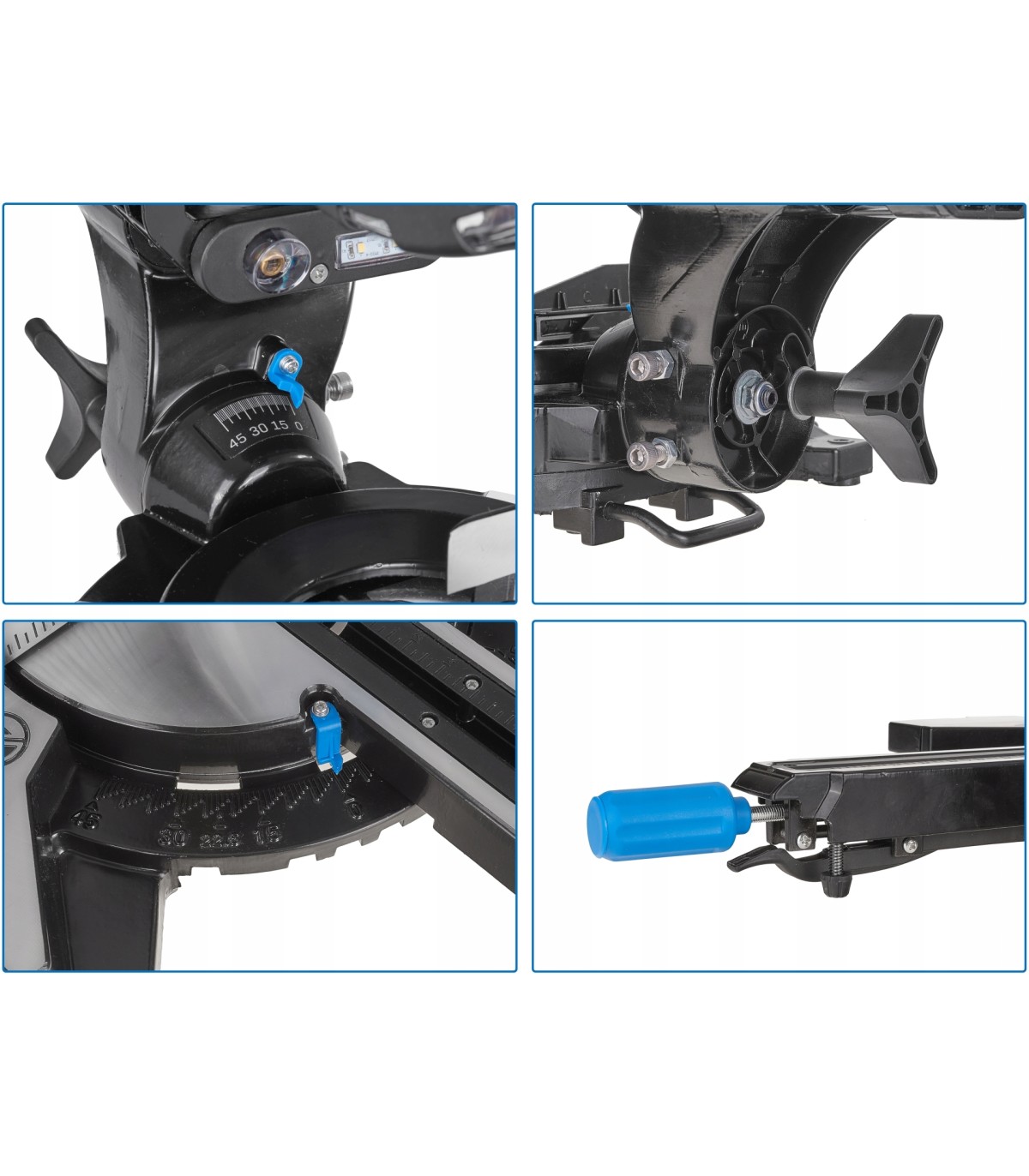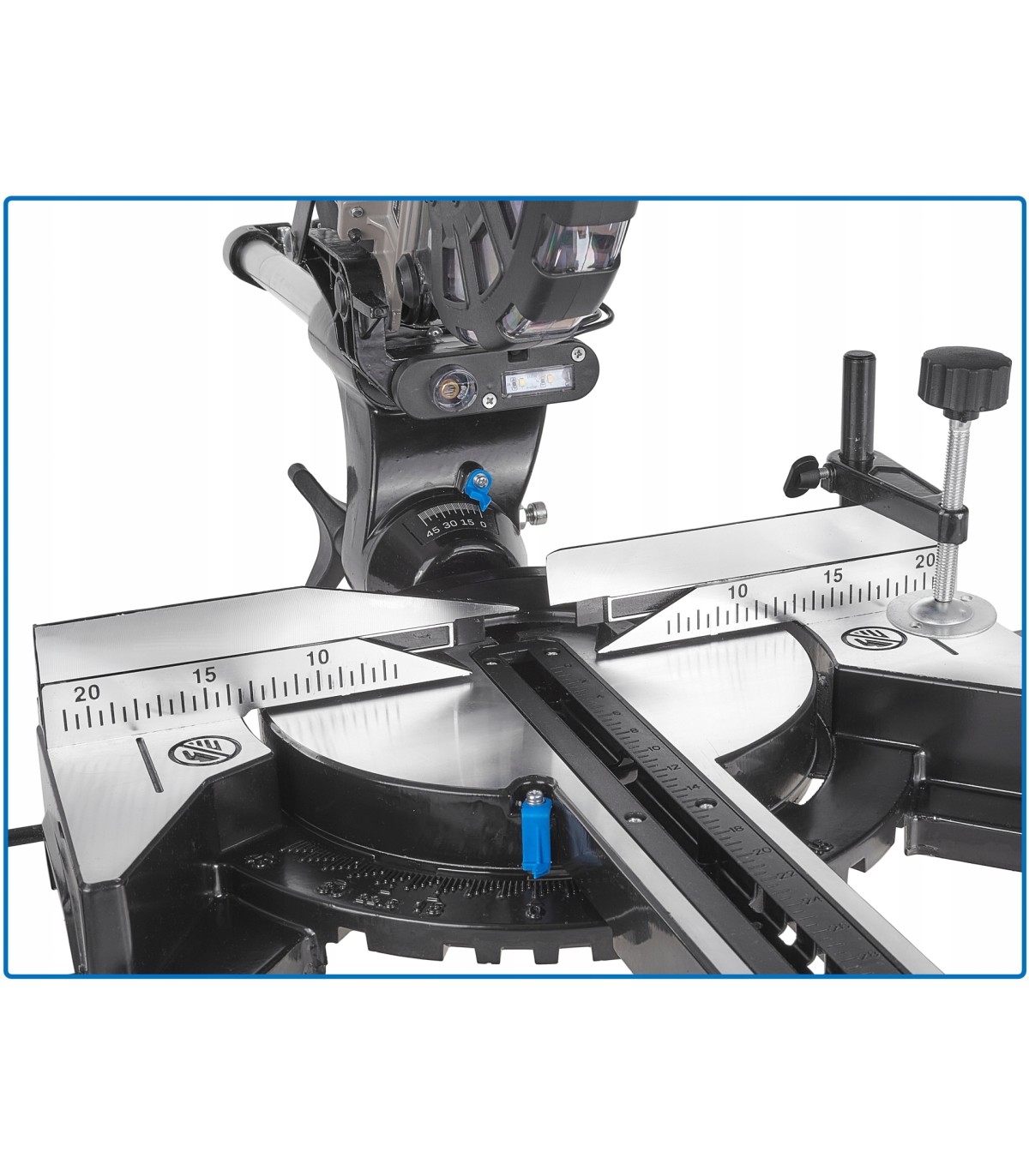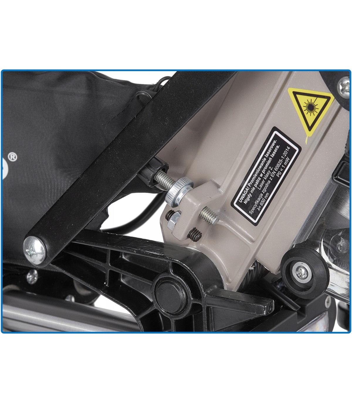 Ukośnica wyposażona została w laser precyzyjnie wyznaczający linie cięcia oraz diody LED dokładnie oświetlające obszar roboczy, co jeszcze bardziej zwiększa precyzję podczas wykonywania cięcia.
