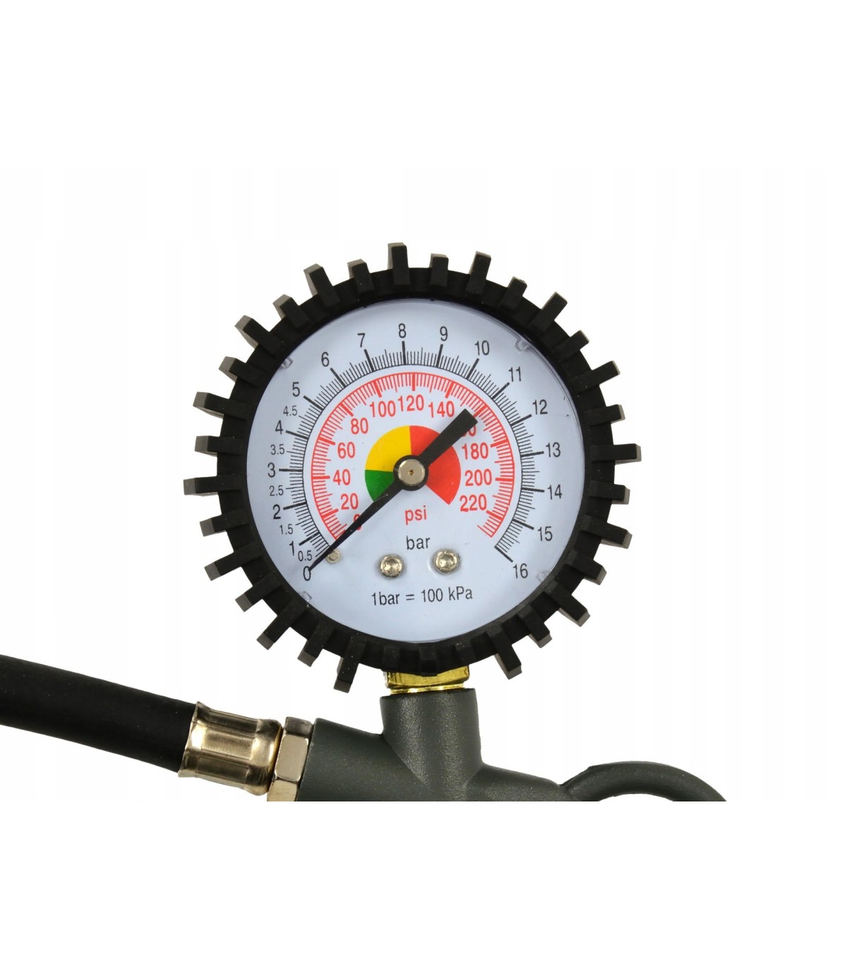 ➡️ Precyzyjny manometr: Zakres pomiarowy od 0 do 16 barów (220 psi) umożliwia dokładną kontrolę ciśnienia w pompowanych oponach, co zwiększa bezpieczeństwo i komfort jazdy.