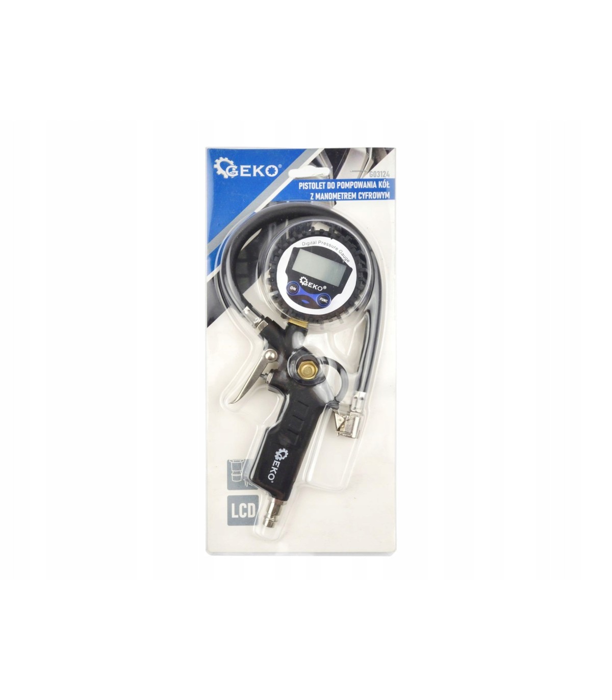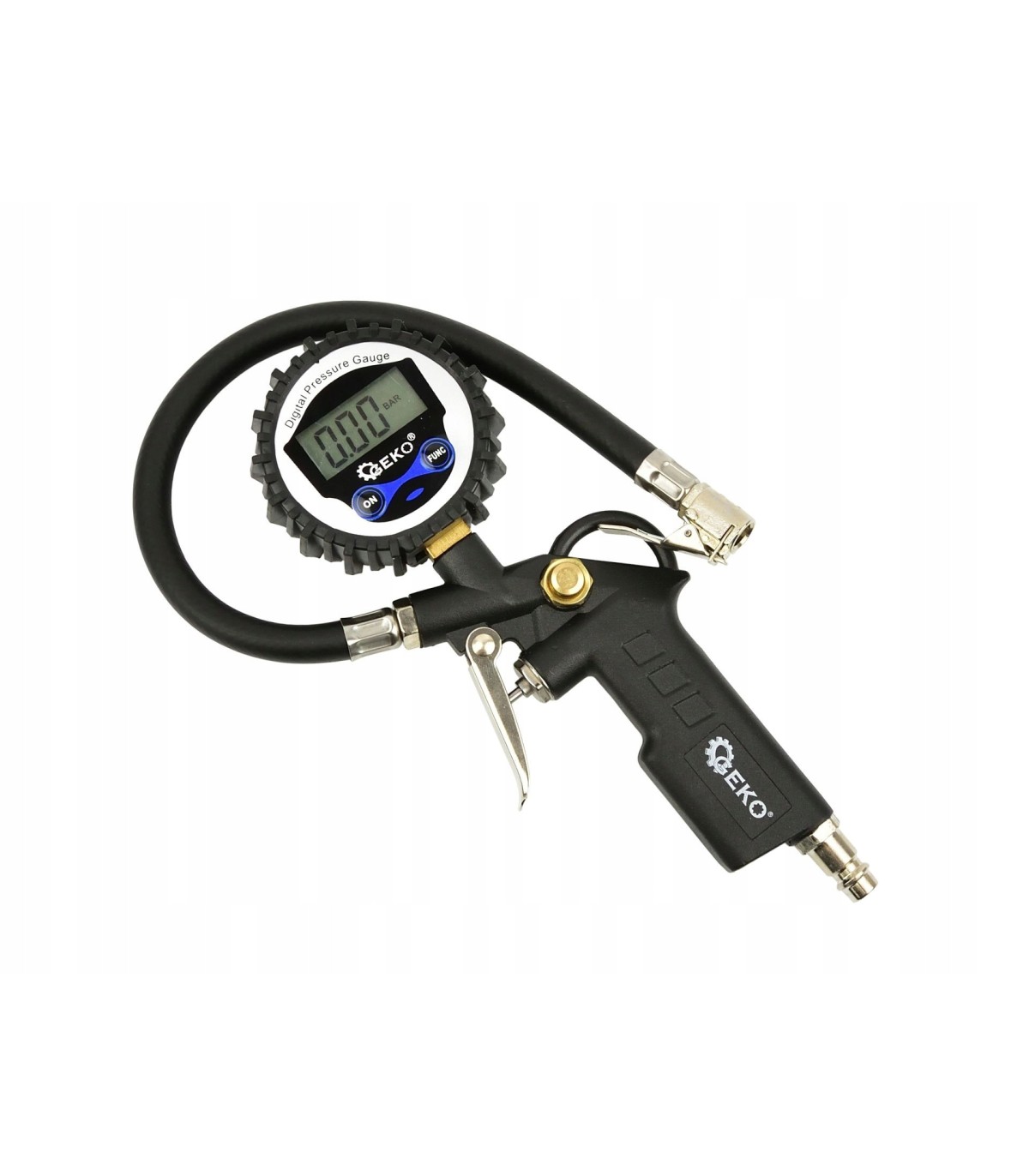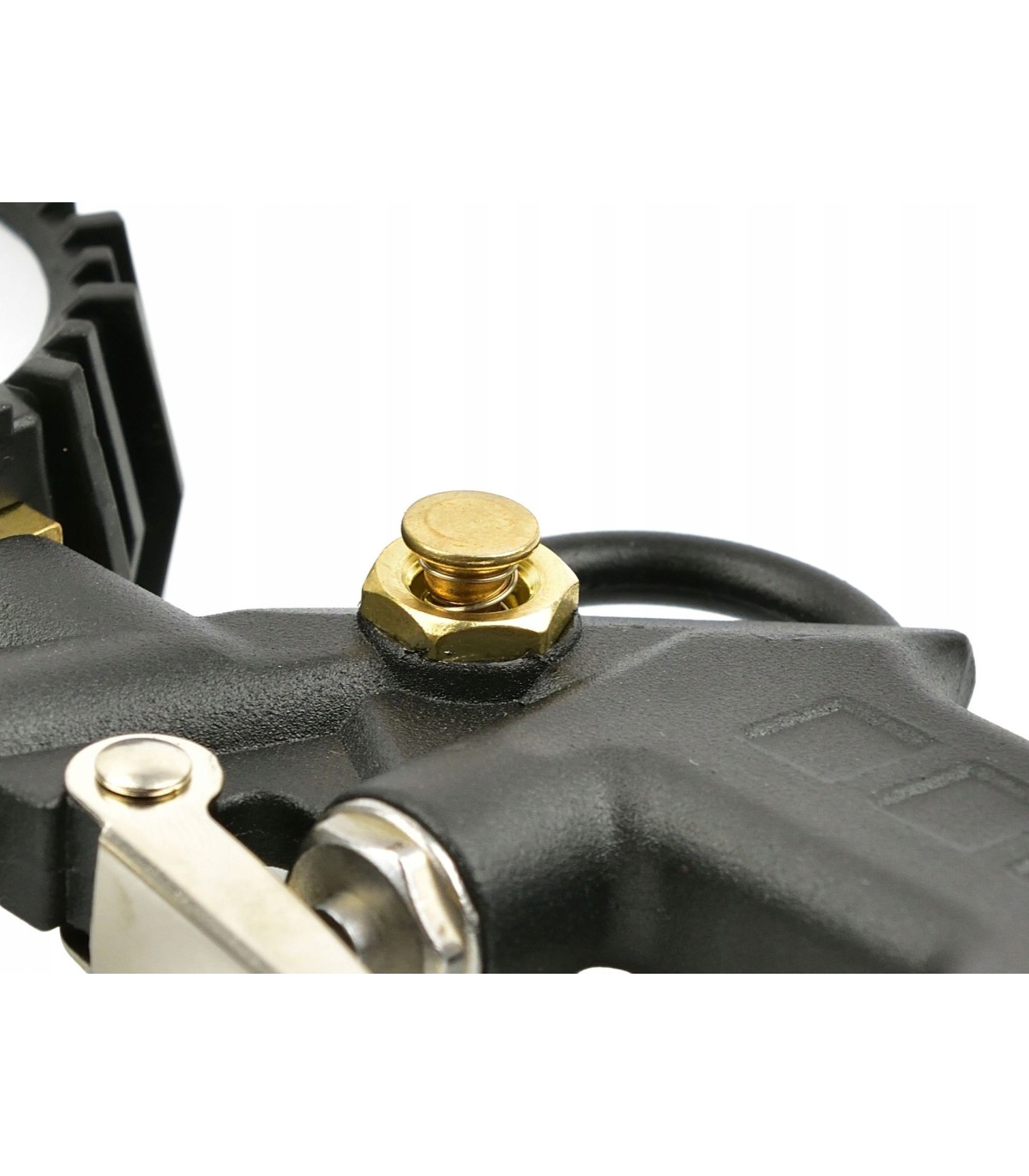 Wysokiej jakości pistolet służący do pompowania kół o standardowych wentylach samochodowych. Manometr został osłonięty wyprofilowaną gumą, chroniącą go przed uszkodzeniem podczas użytkowania. Narzędzie wyposażone zostało w standardowe szybkozłącze męskie stosowane w europejskich narzędziach pneumatycznych. Cyfrowy manometr zapewnia wskazywanie dokładnych wartości.