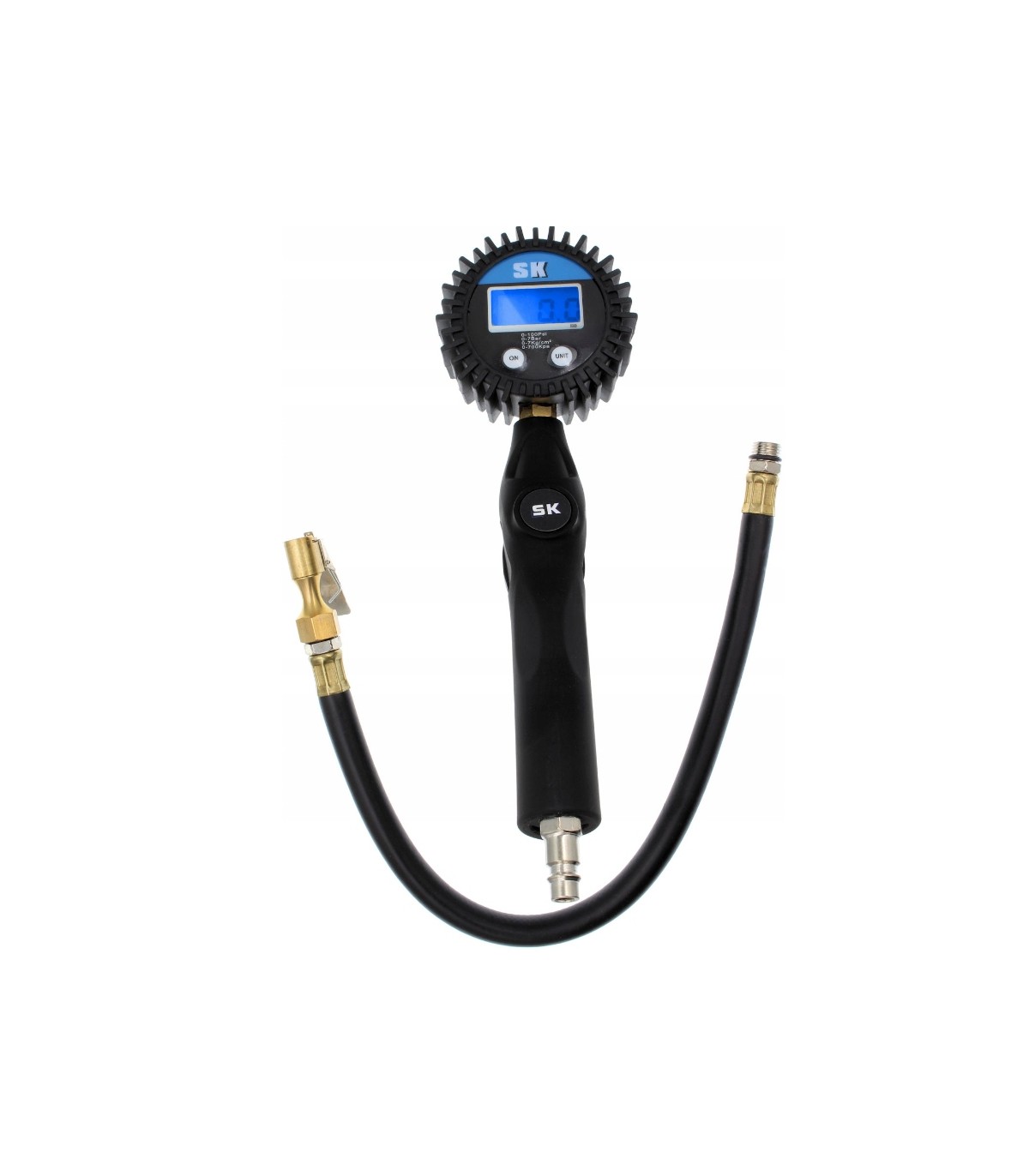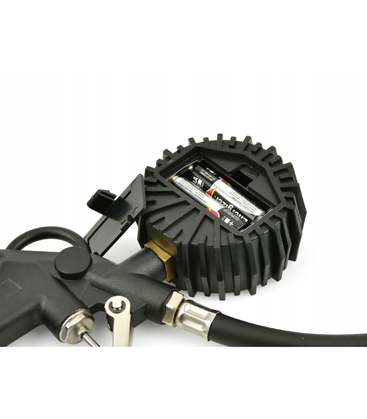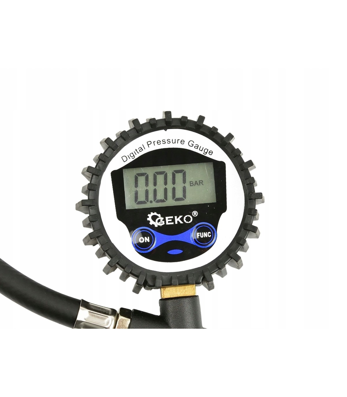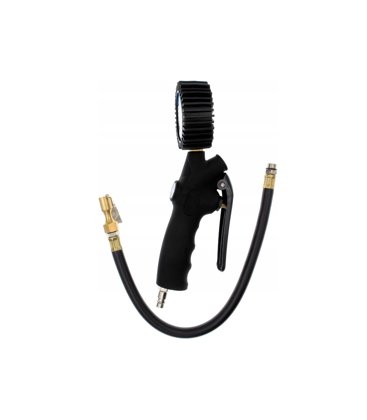 Wysokiej jakości pistolet służący do pompowania kół o standardowych wentylach samochodowych. Manometr został osłonięty wyprofilowaną gumą, chroniącą go przed uszkodzeniem podczas użytkowania. Narzędzie wyposażone zostało w standardowe szybkozłącze męskie stosowane w europejskich narzędziach pneumatycznych. Cyfrowy manometr zapewnia wskazywanie dokładnych wartości.