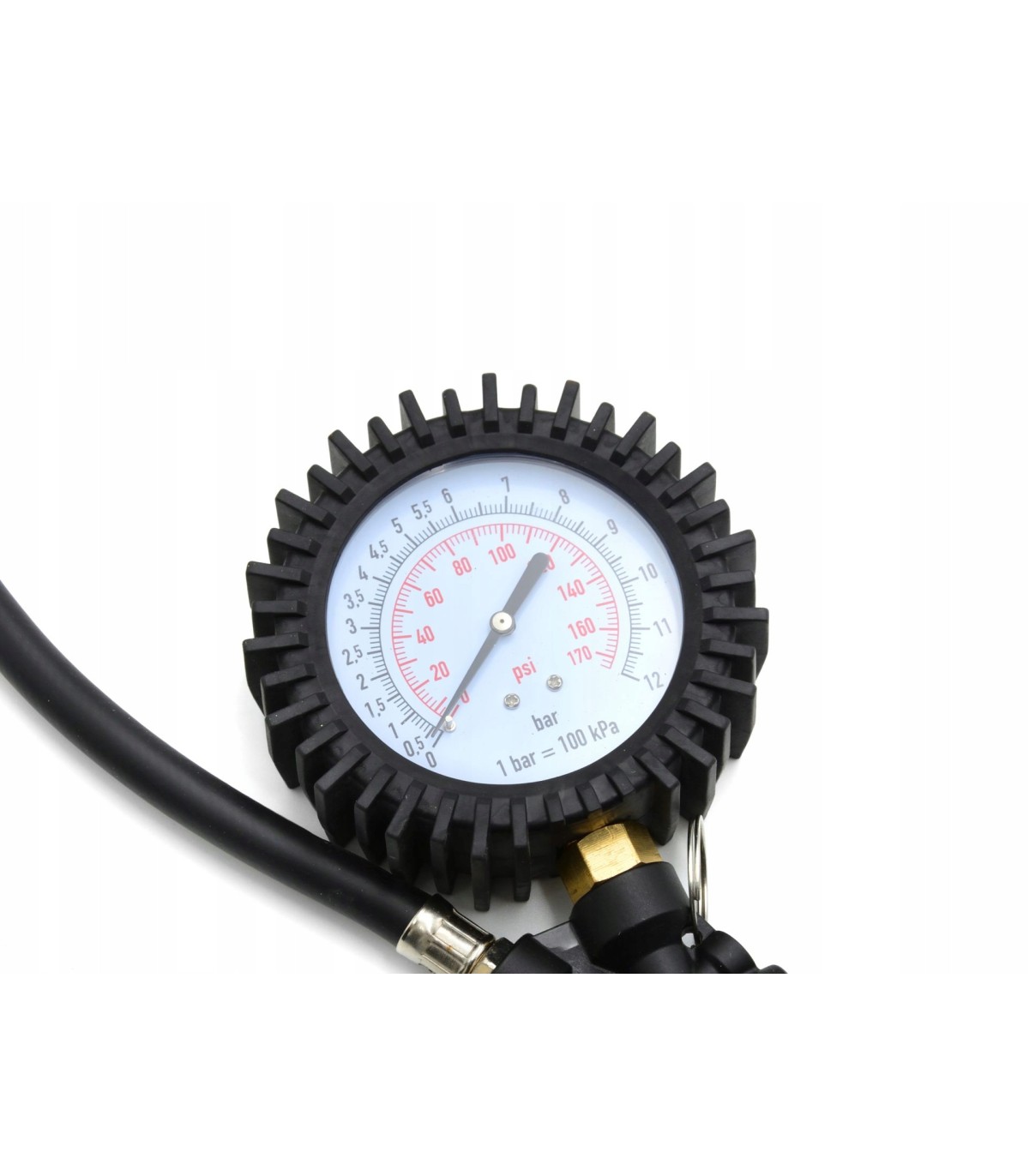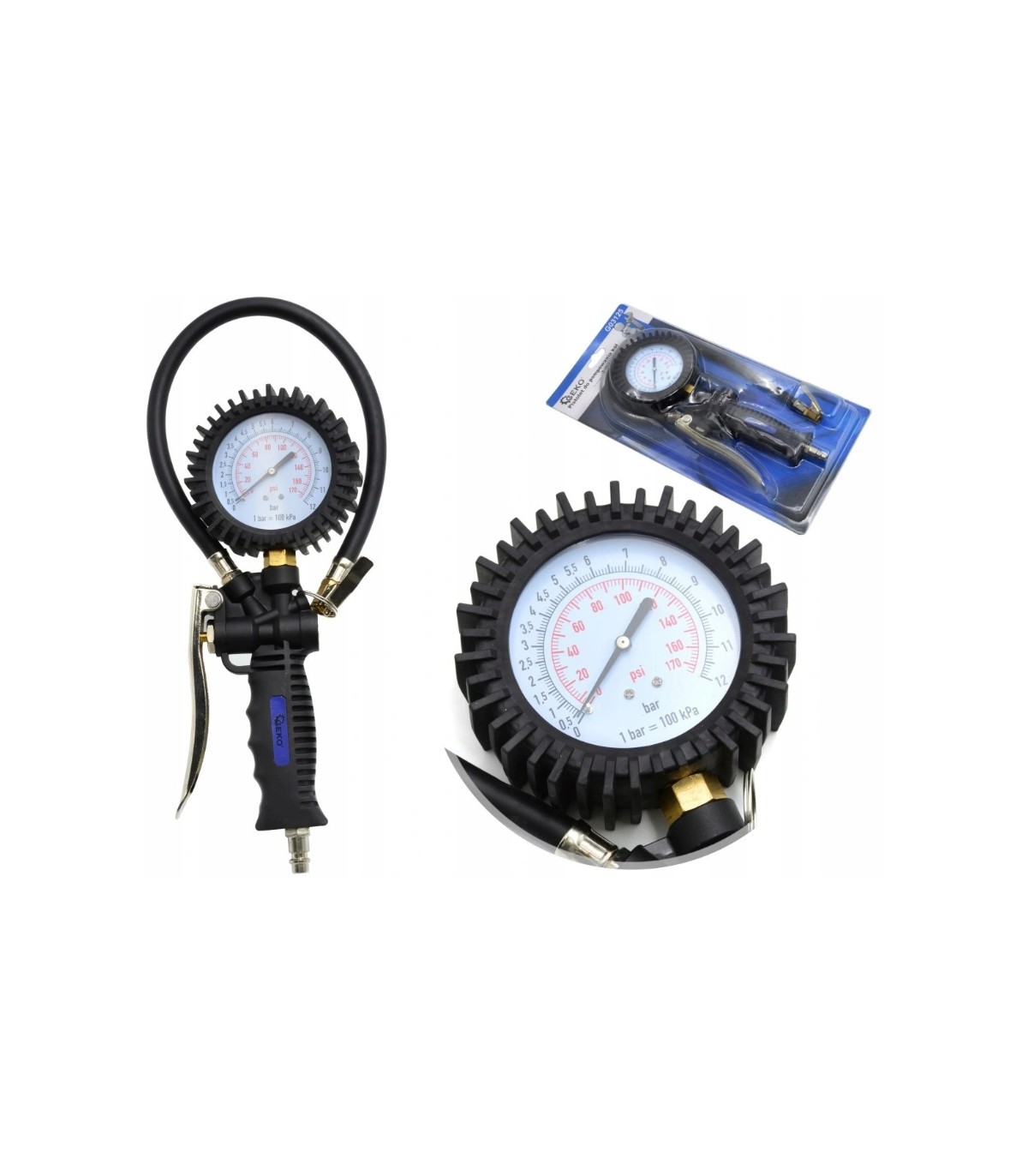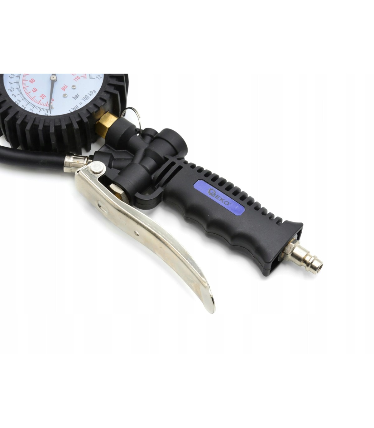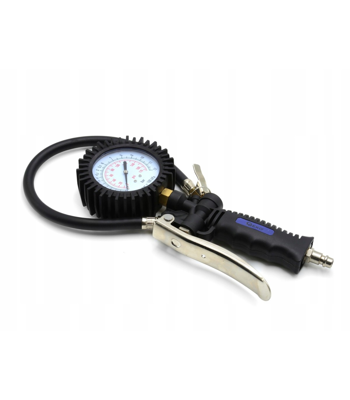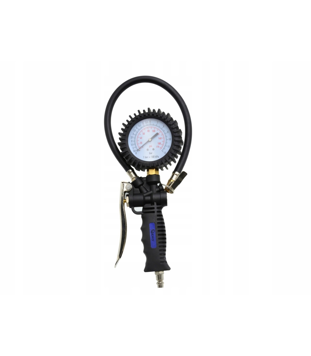 Profesjonalny pistolet pneumatyczny z manometrem - do pompowania kół samochodów osobowych i ciężarowych. Skala pomiarowa w dwóch jednostkach - Psi i Bar. Szybkozłącze 1/4" pozwala na szybkie podpięcie do kompresora.