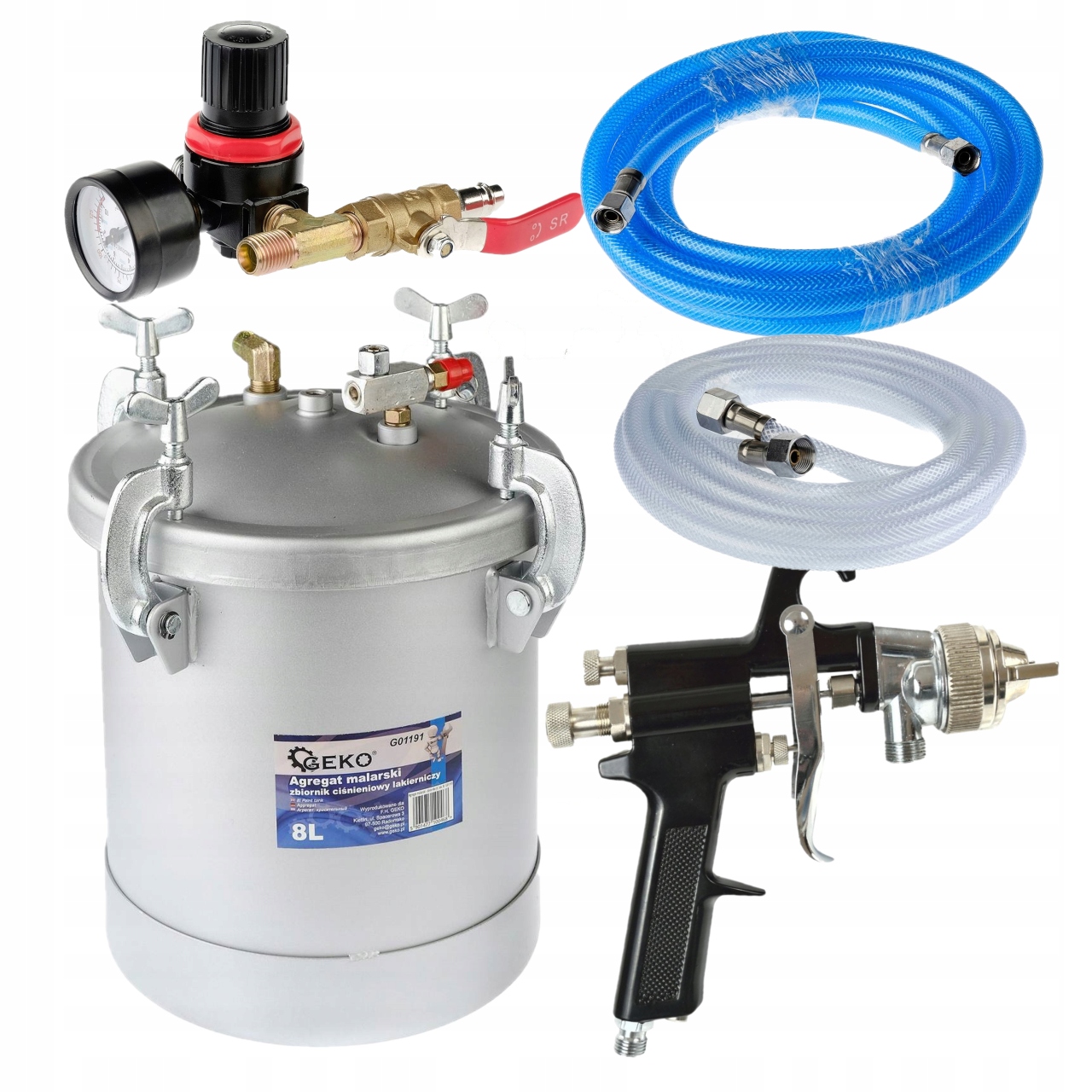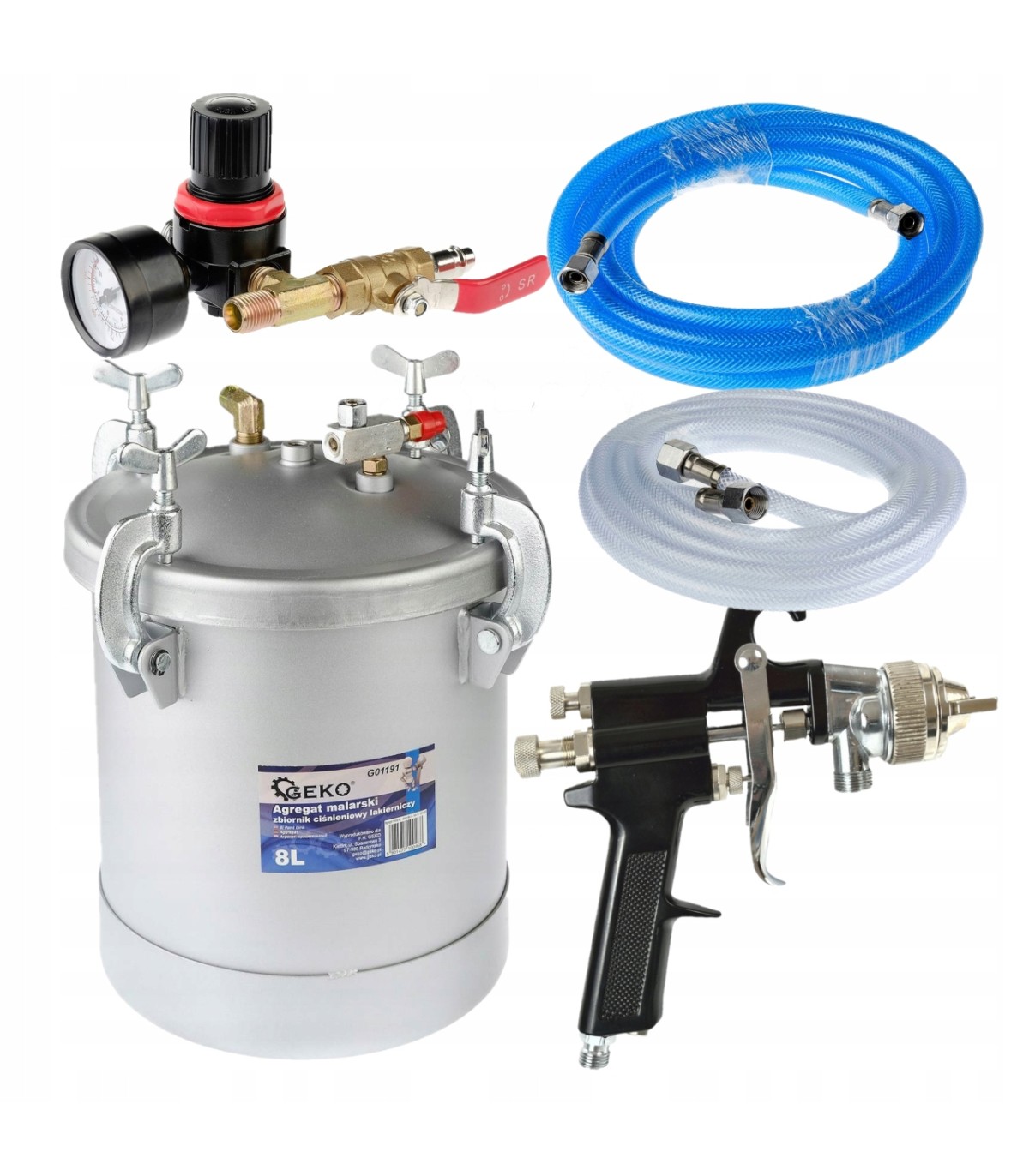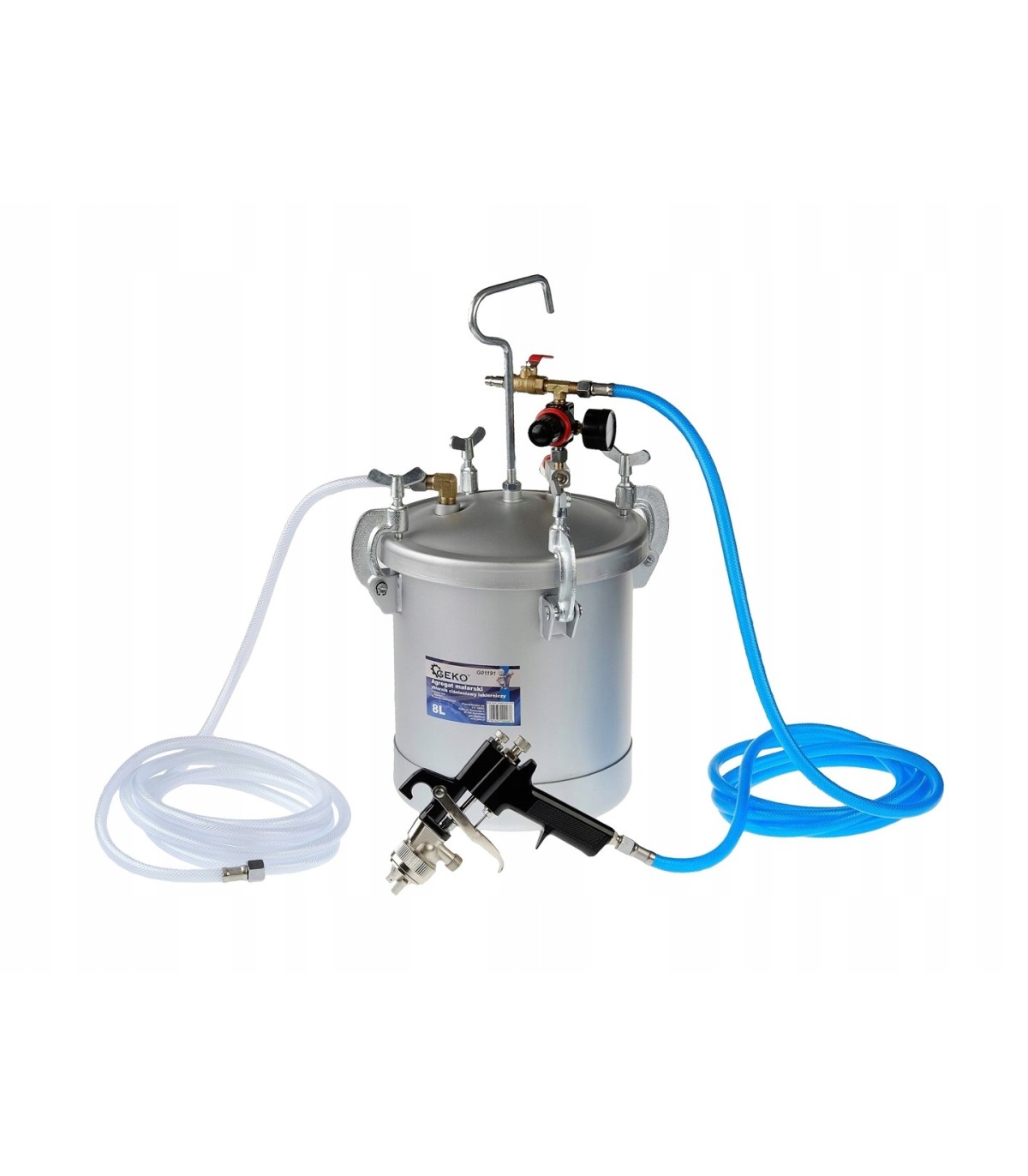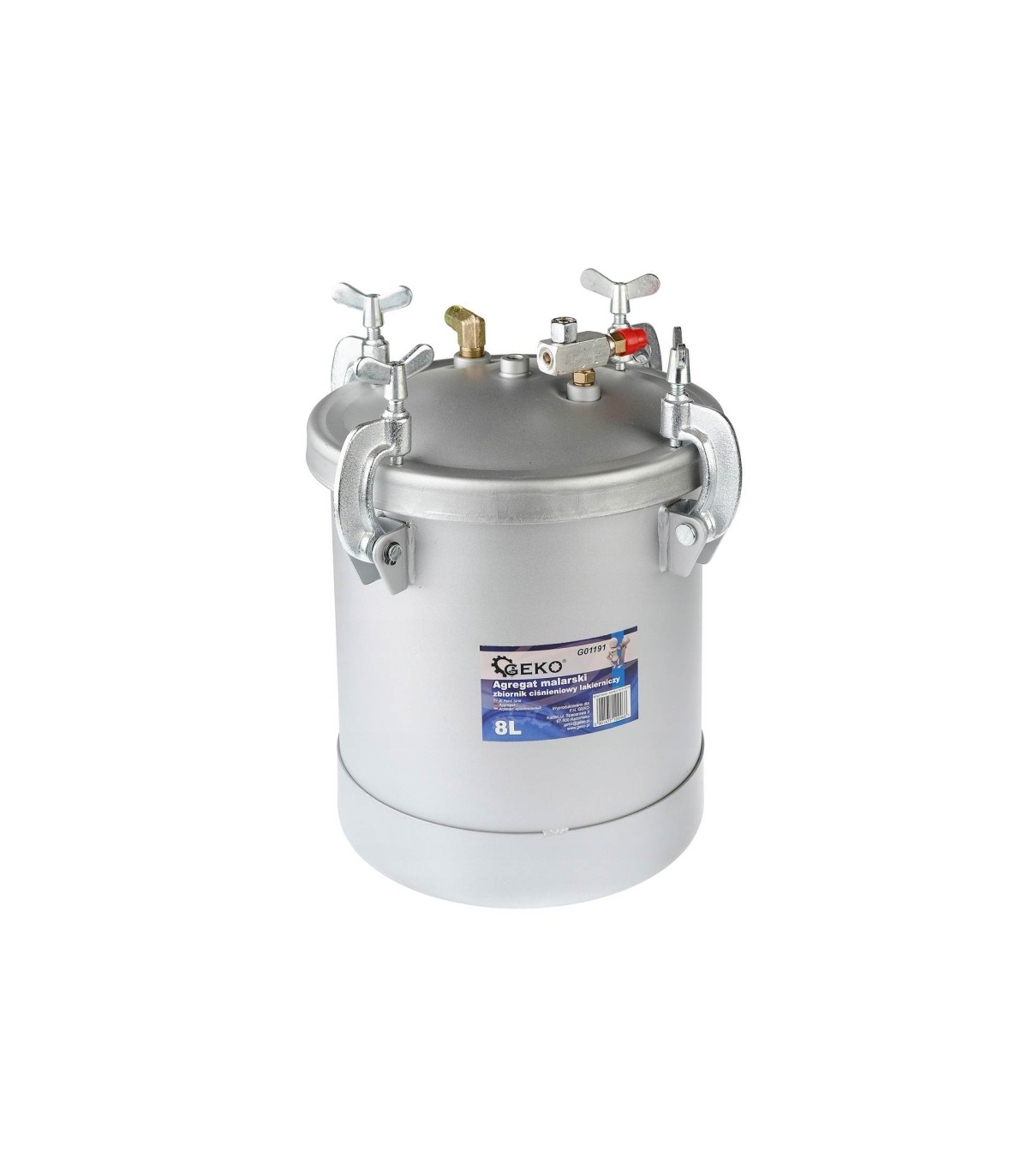 Zbiornik został wykonany z grubego aluminium na pokrywie którego zamocowany jest reduktor ciśnienia, z manometrem oraz zaworem bezpieczeństwa
