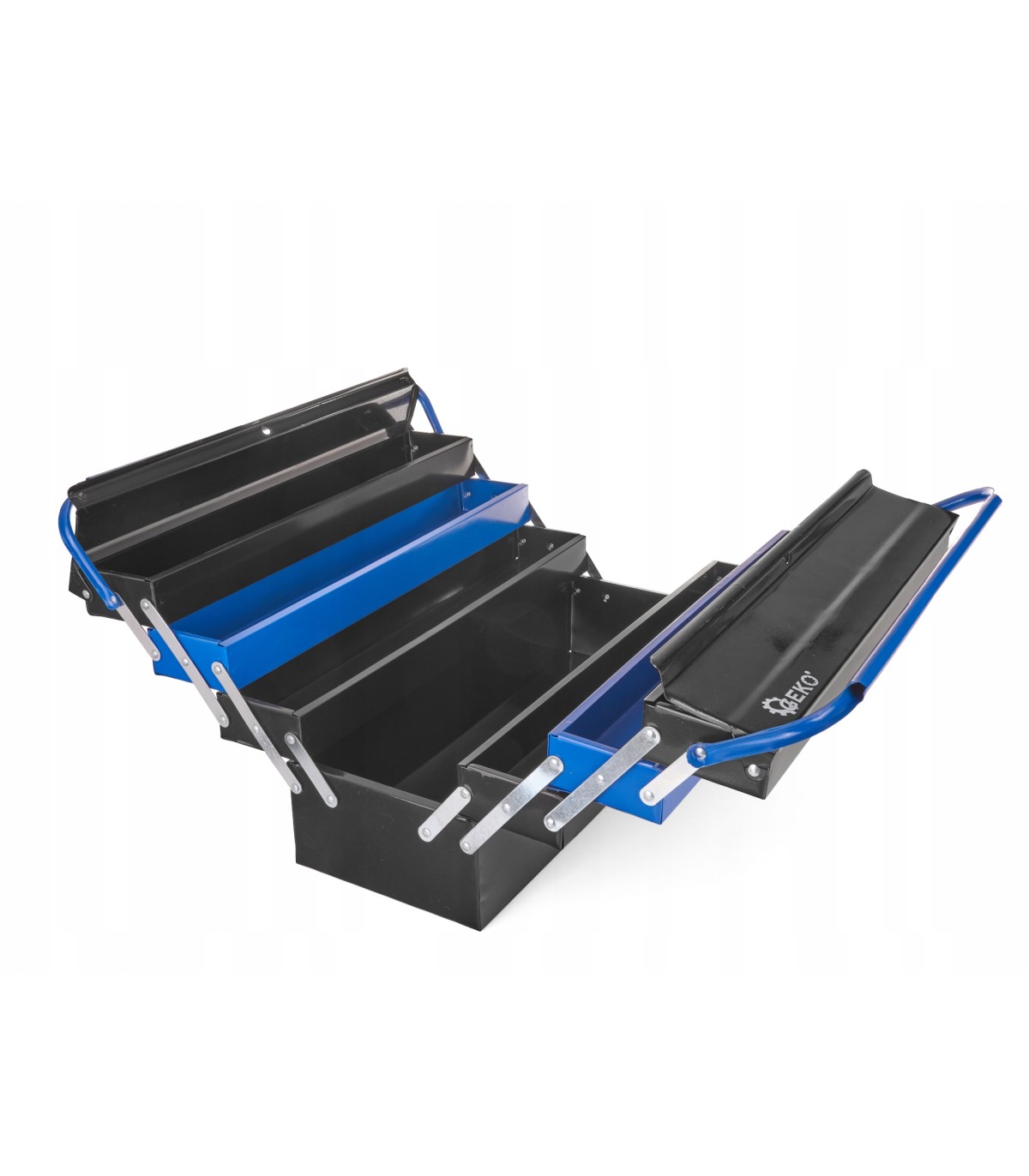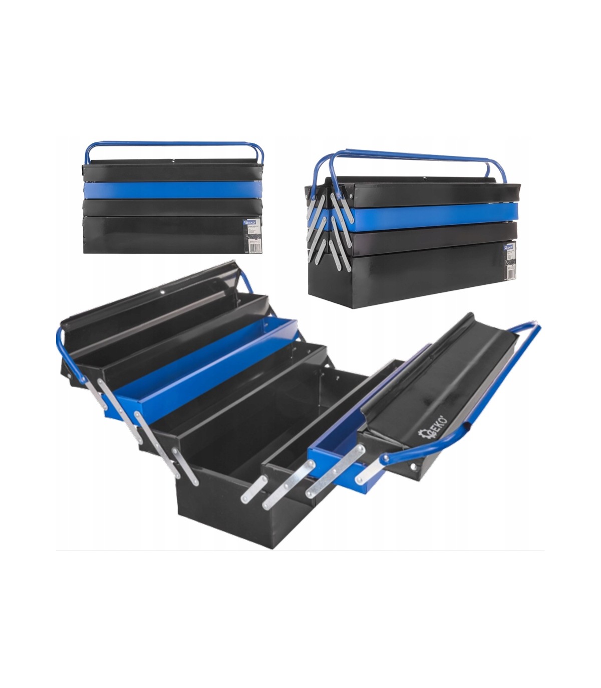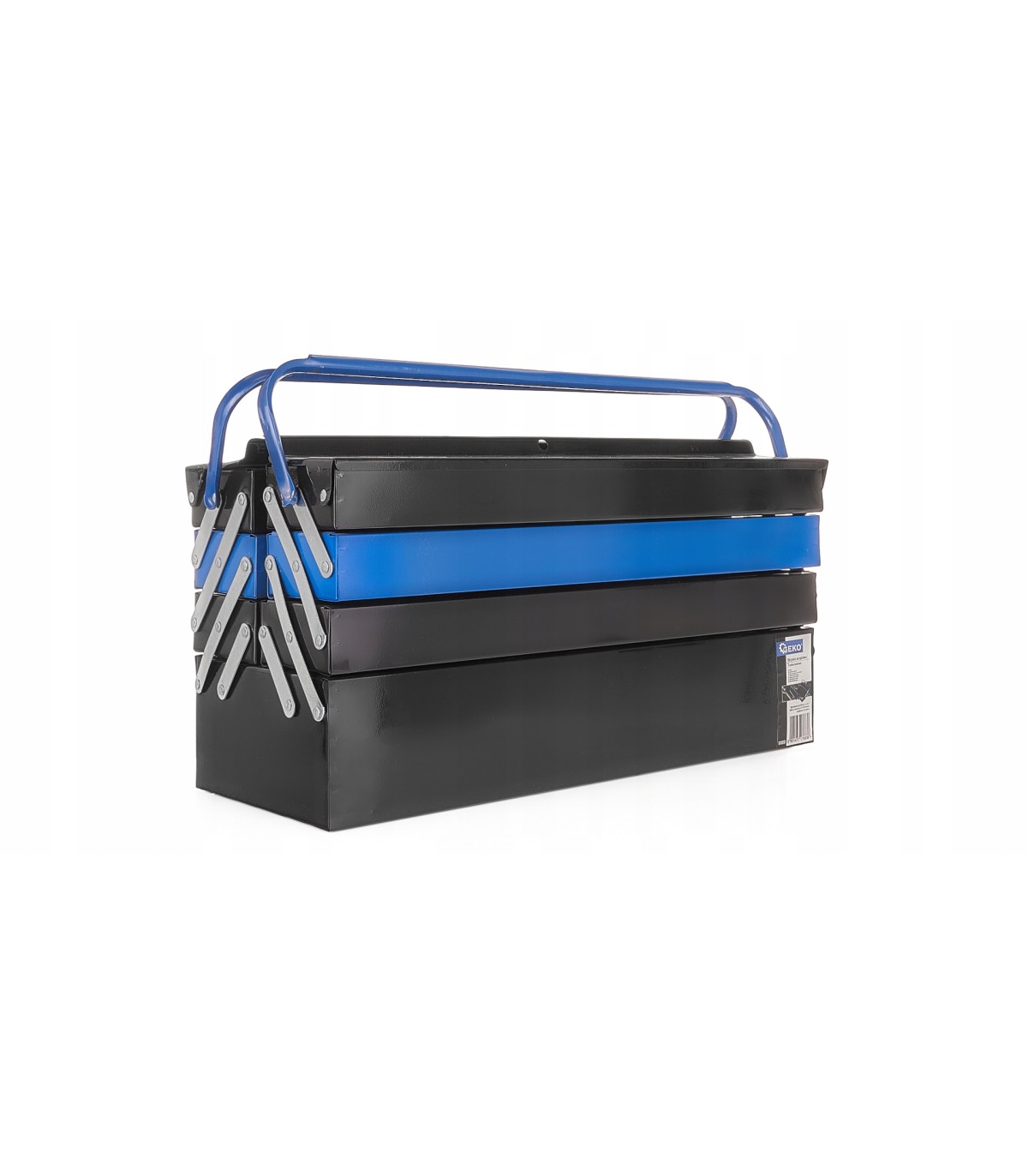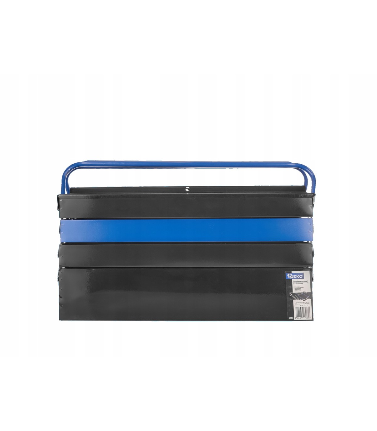 Skrzynka jest wyposażona w wygodny uchwyt do przenoszenia, a wewnątrz znajduje się wiele funkcjonalnych przegródek.