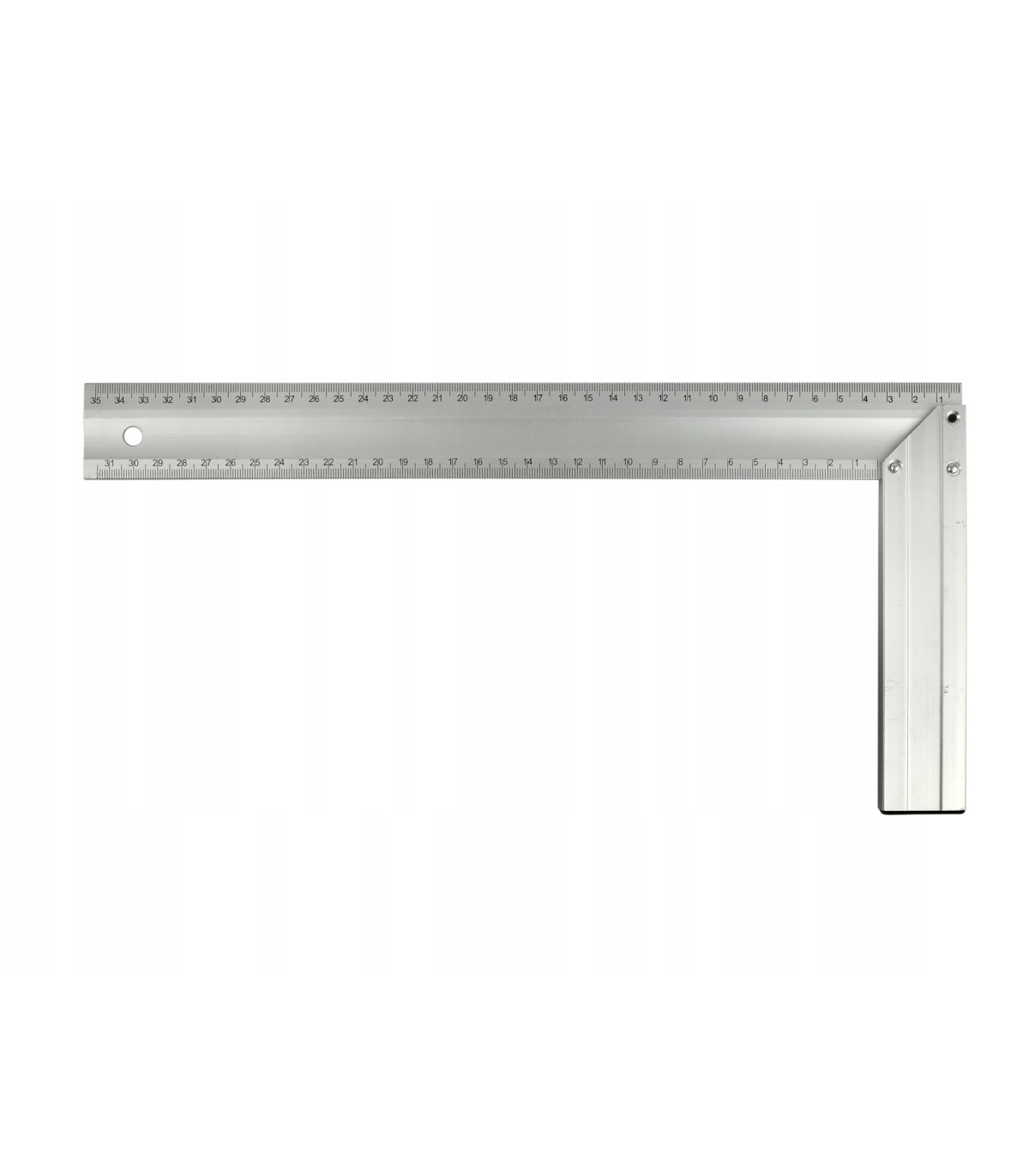Profil aluminiowy z dwustronną podziałką metryczną. Kątownik szczególnie przydatny w stolarstwie oraz branży budowlanej podczas wyznaczania i sprawdzania kątów prostych.